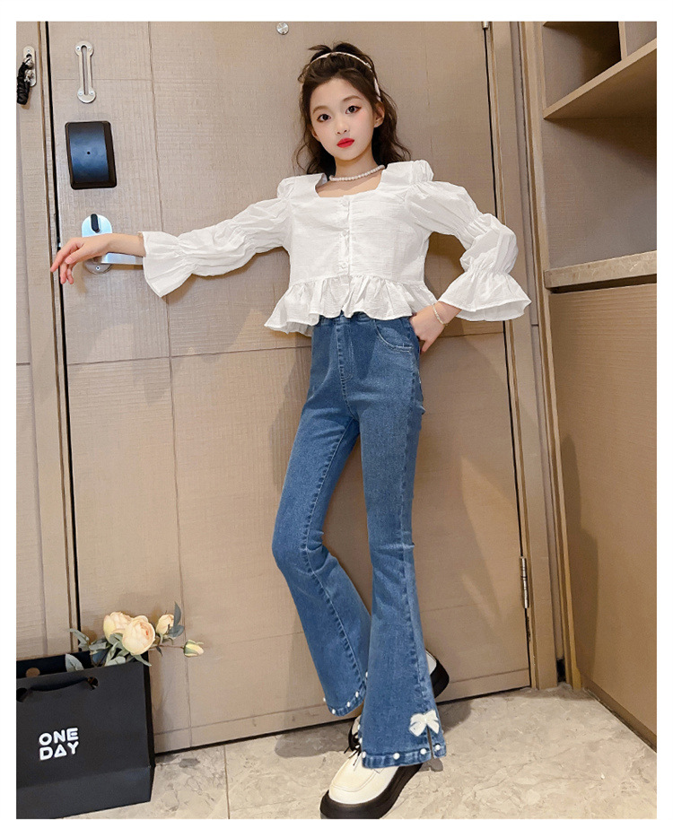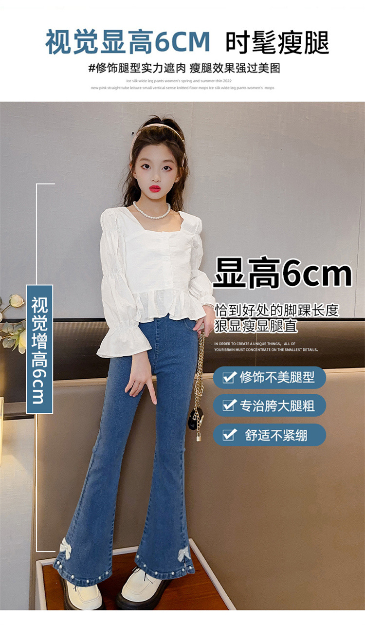 어린이 플레어 팬츠 가을과 겨울 2023 새로운 한국 스타일 기모 진주 보우 스플릿 팬츠 여아 청바지