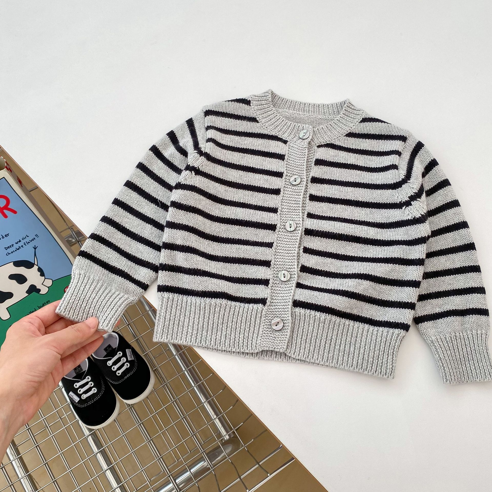 2024년 신상 남아 니트 투피스 세트 스트라이프 멜빵바지 롬퍼스 스웨터 가디건 유아 아동복 세트