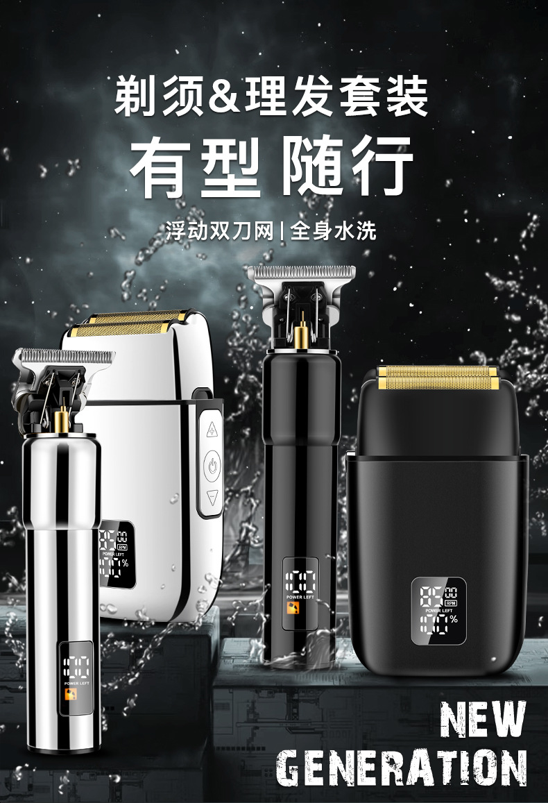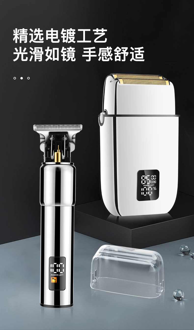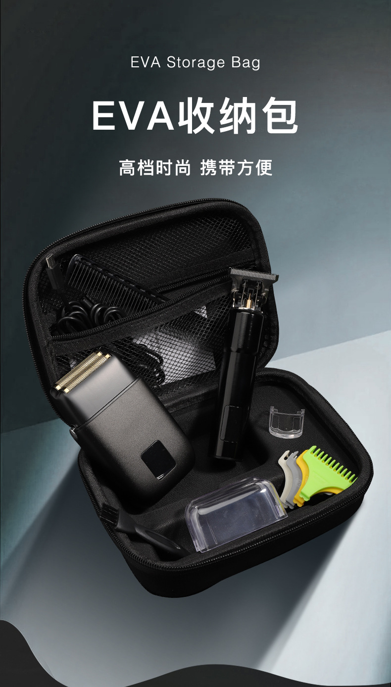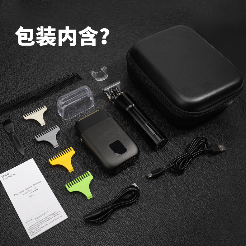 包含配件:理发器+剃须刀+EVA收纳包+充电线*2+限位梳*4(1.2.3.4mm)+梳子+剃须刀刀头保护盖+理发器防尘盖+英文说明书.