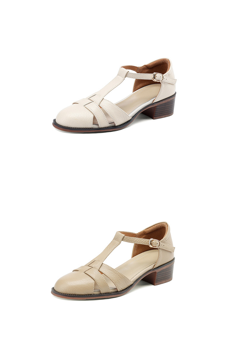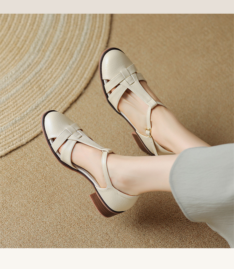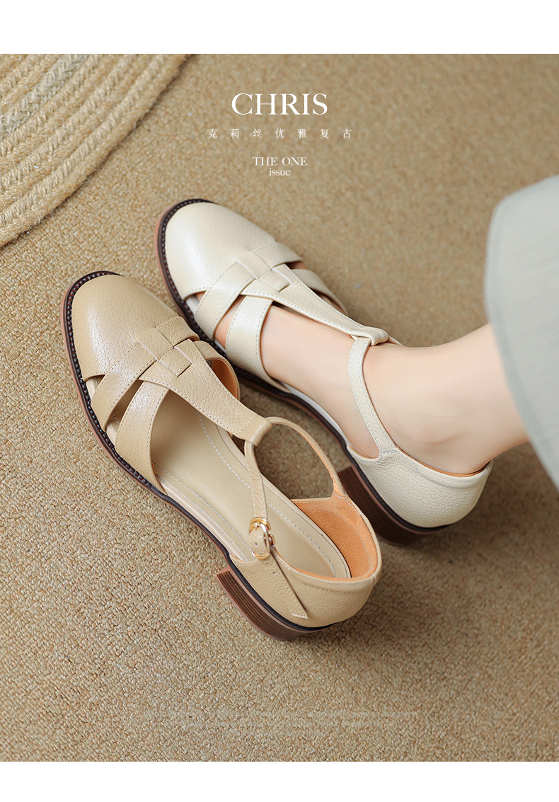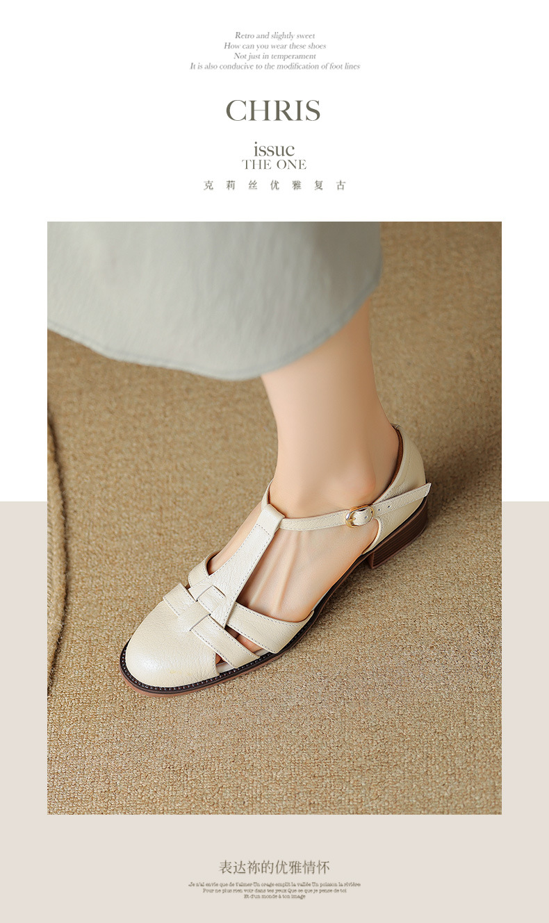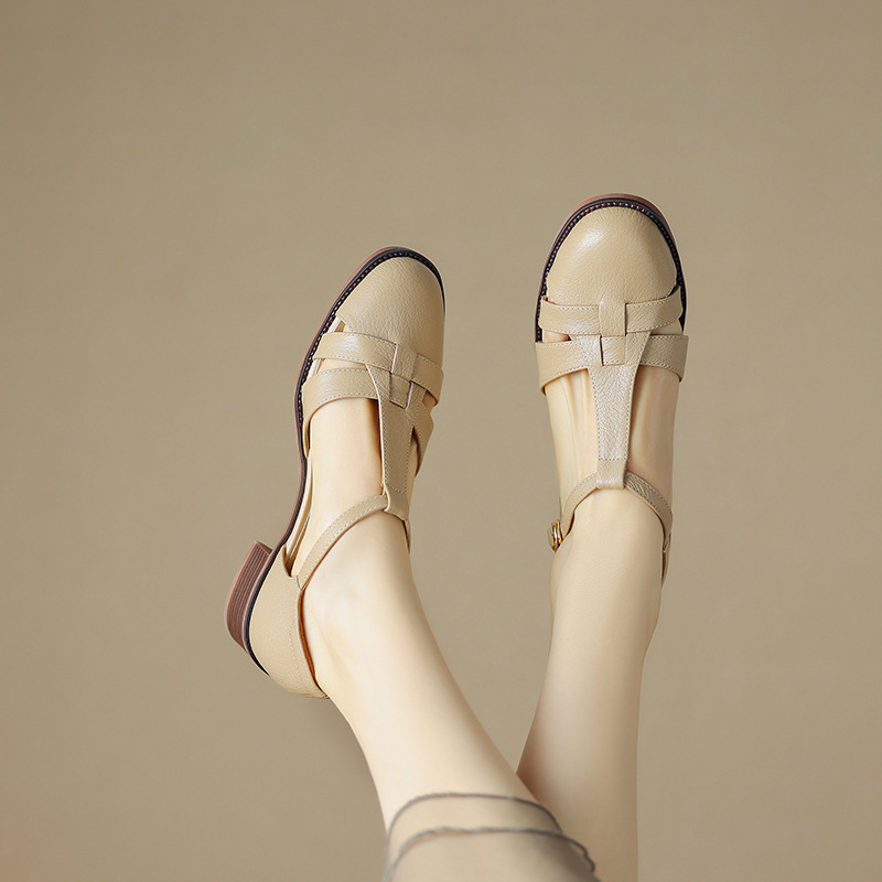 사슴과 숲 레트로 정품 가죽 발가락 로마 샌들 여자의 두꺼운 굽 2023 여름 새로운 중공 짠 돼지 케이지 신발스토어 가기