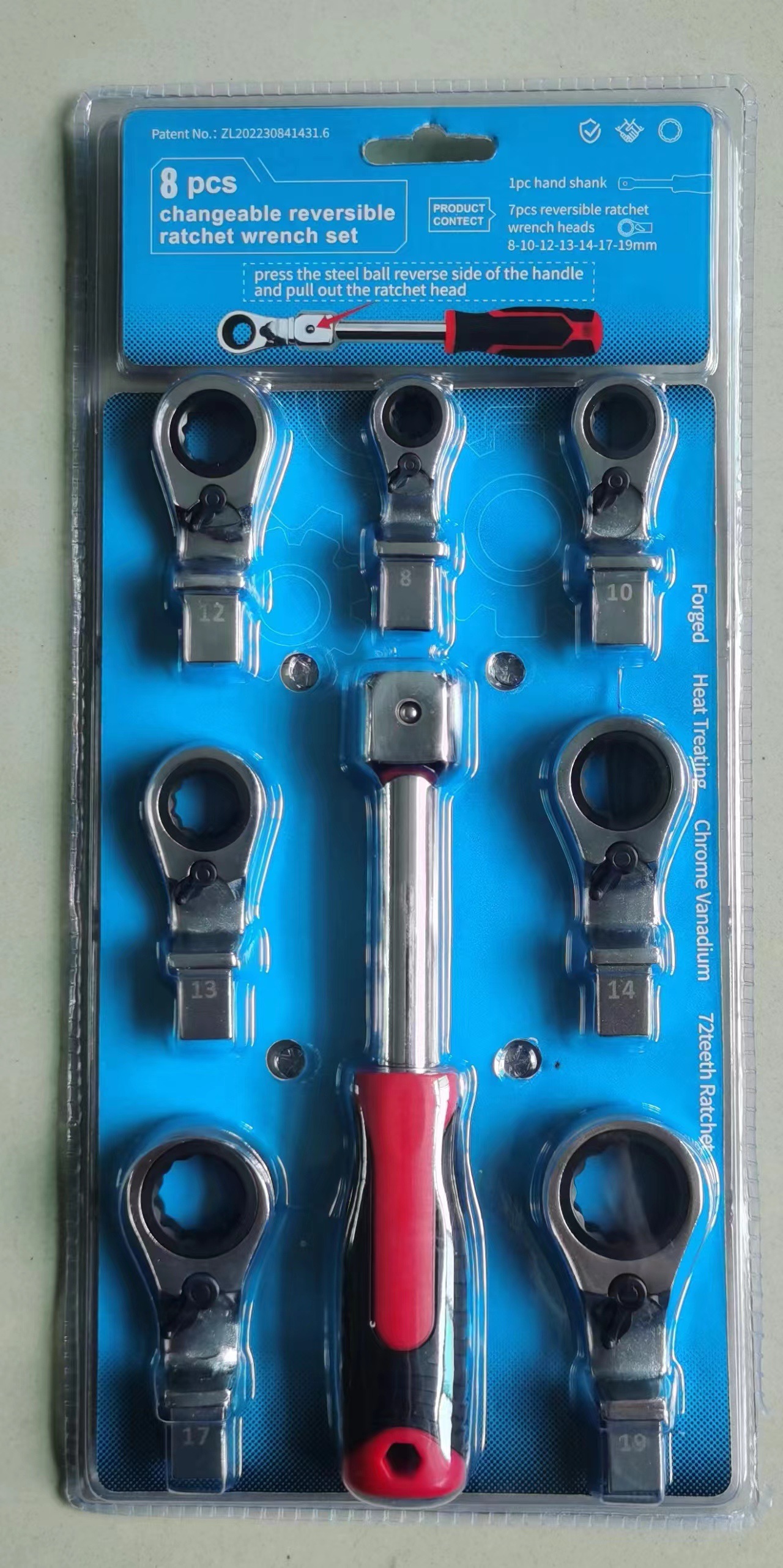 8件套棘轮头,双泡壳包装:36*36*26CM  5/20套  17/16KGS;
