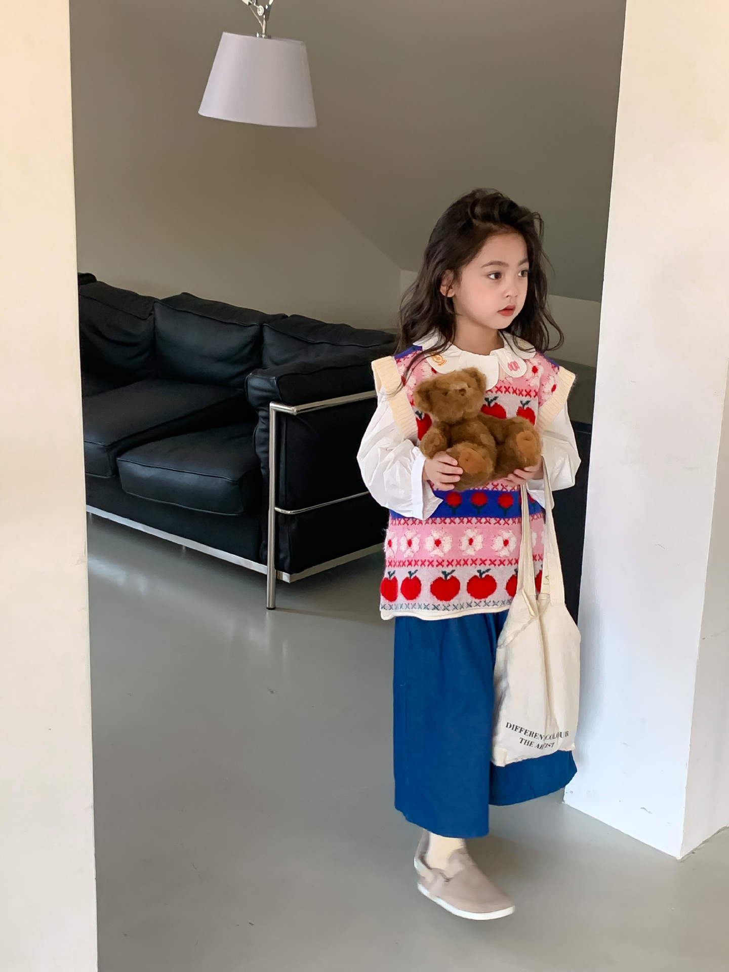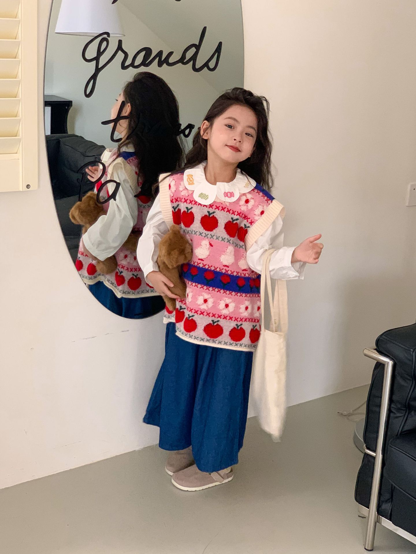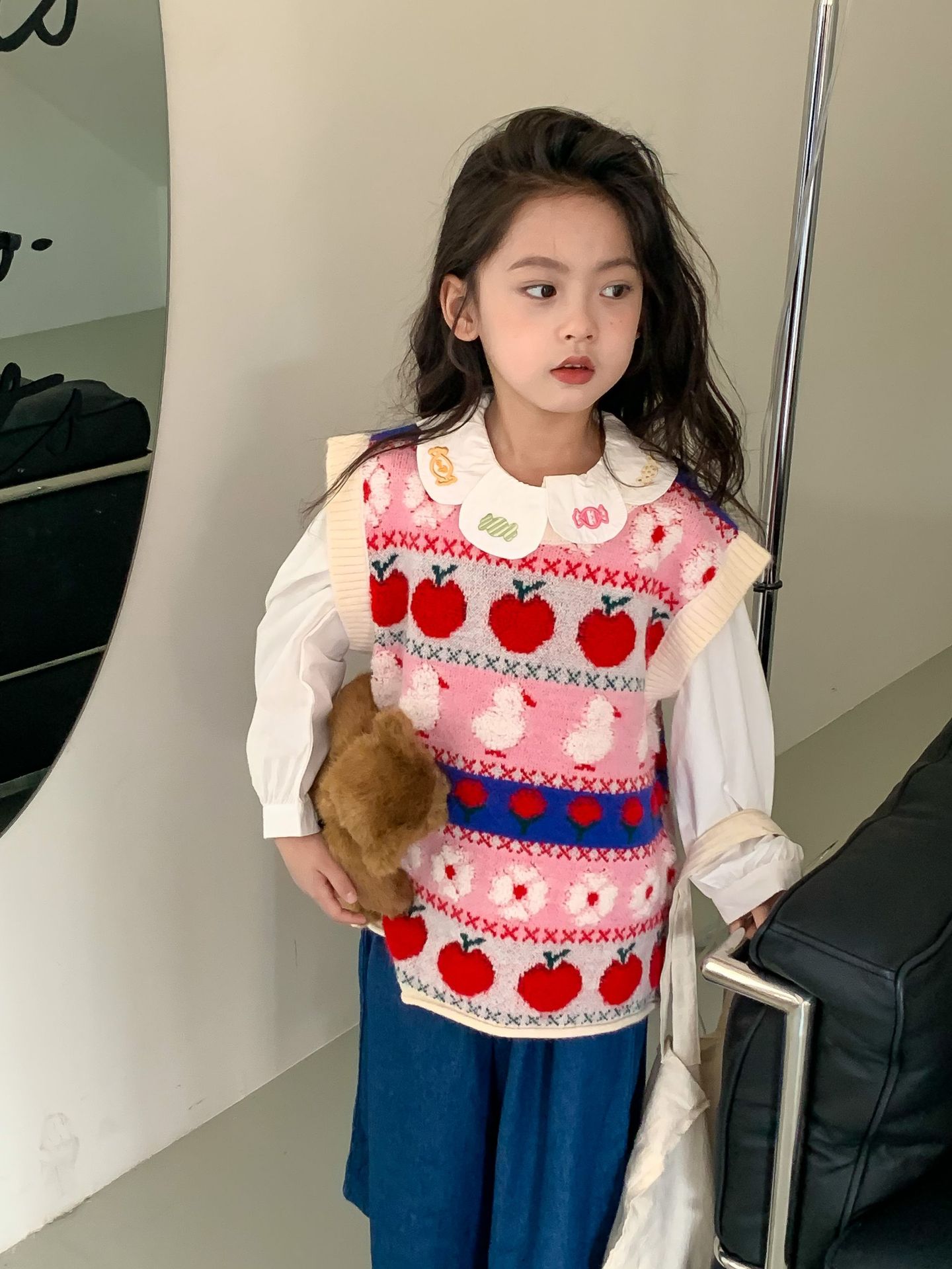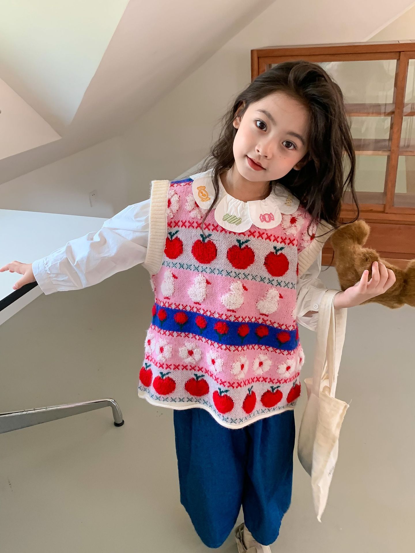 어린이 세트 한국식 아동복 2023 가을 소녀의 양모 조끼 만화 꽃 칼라 셔츠 와이드 레그 팬츠 3 종 세트스토어 가기