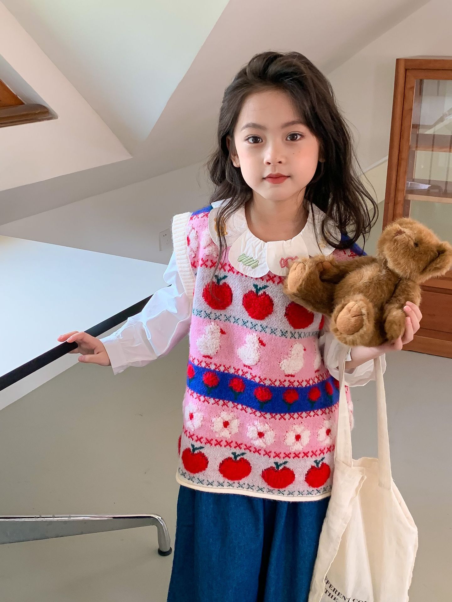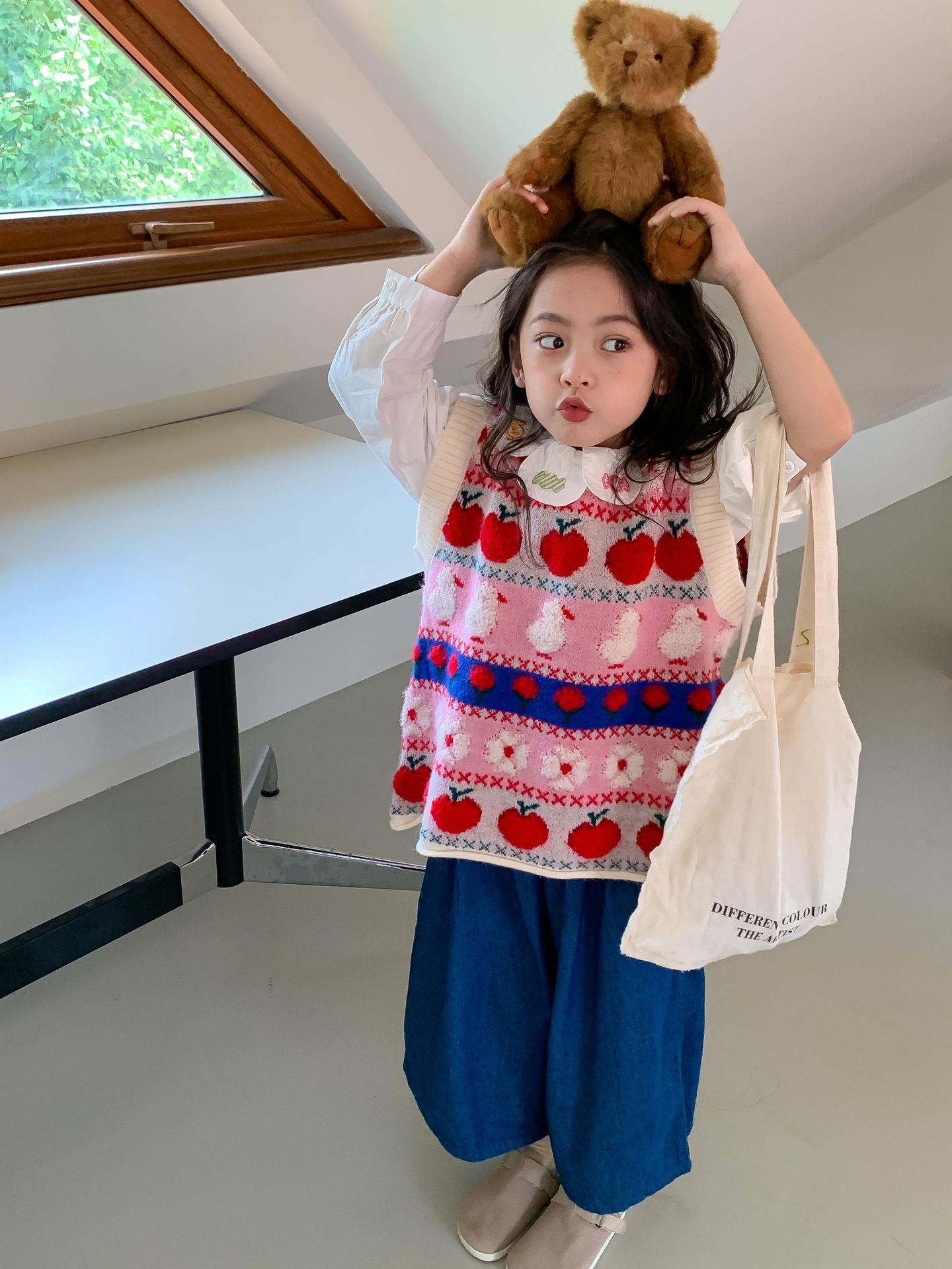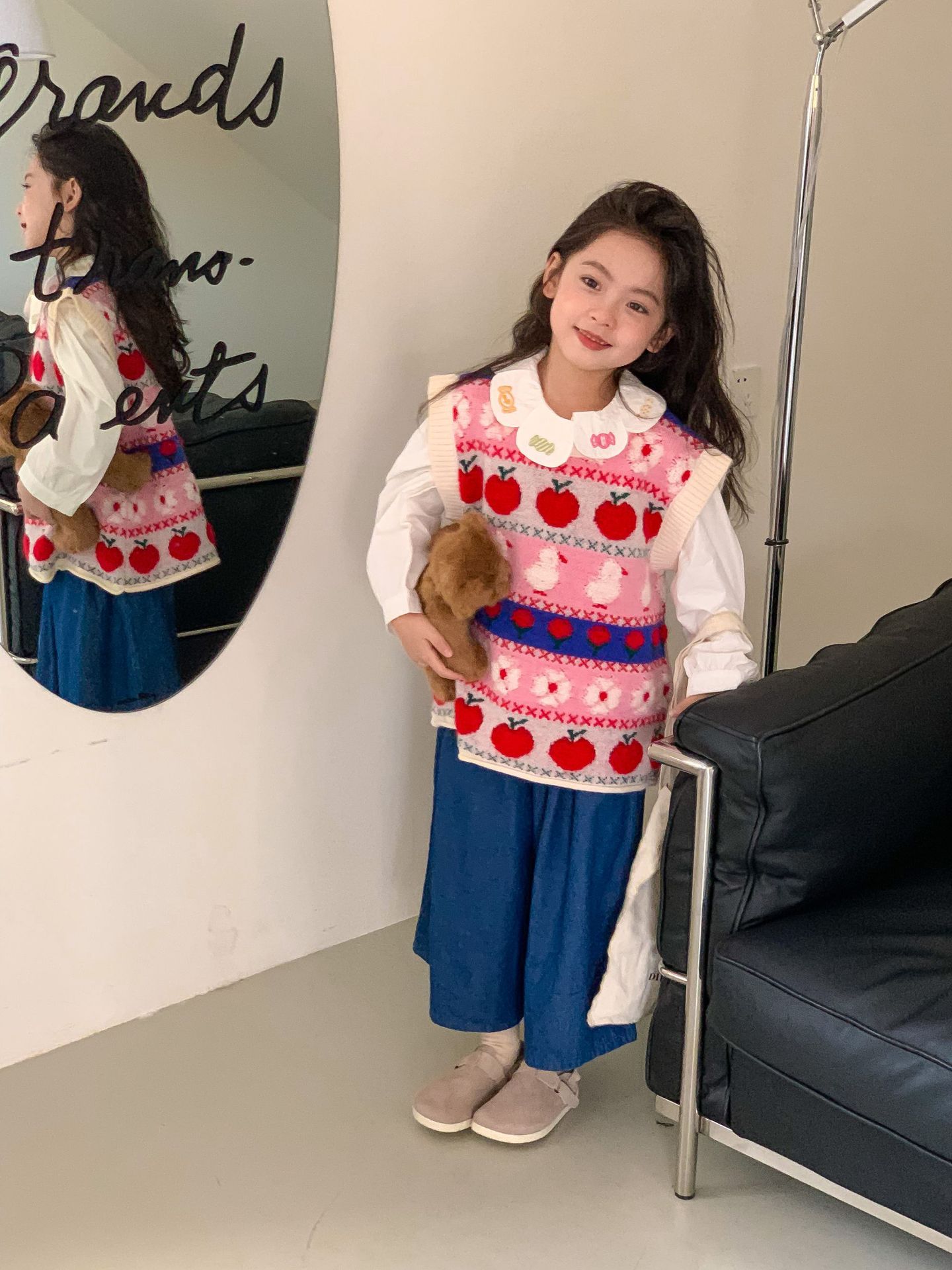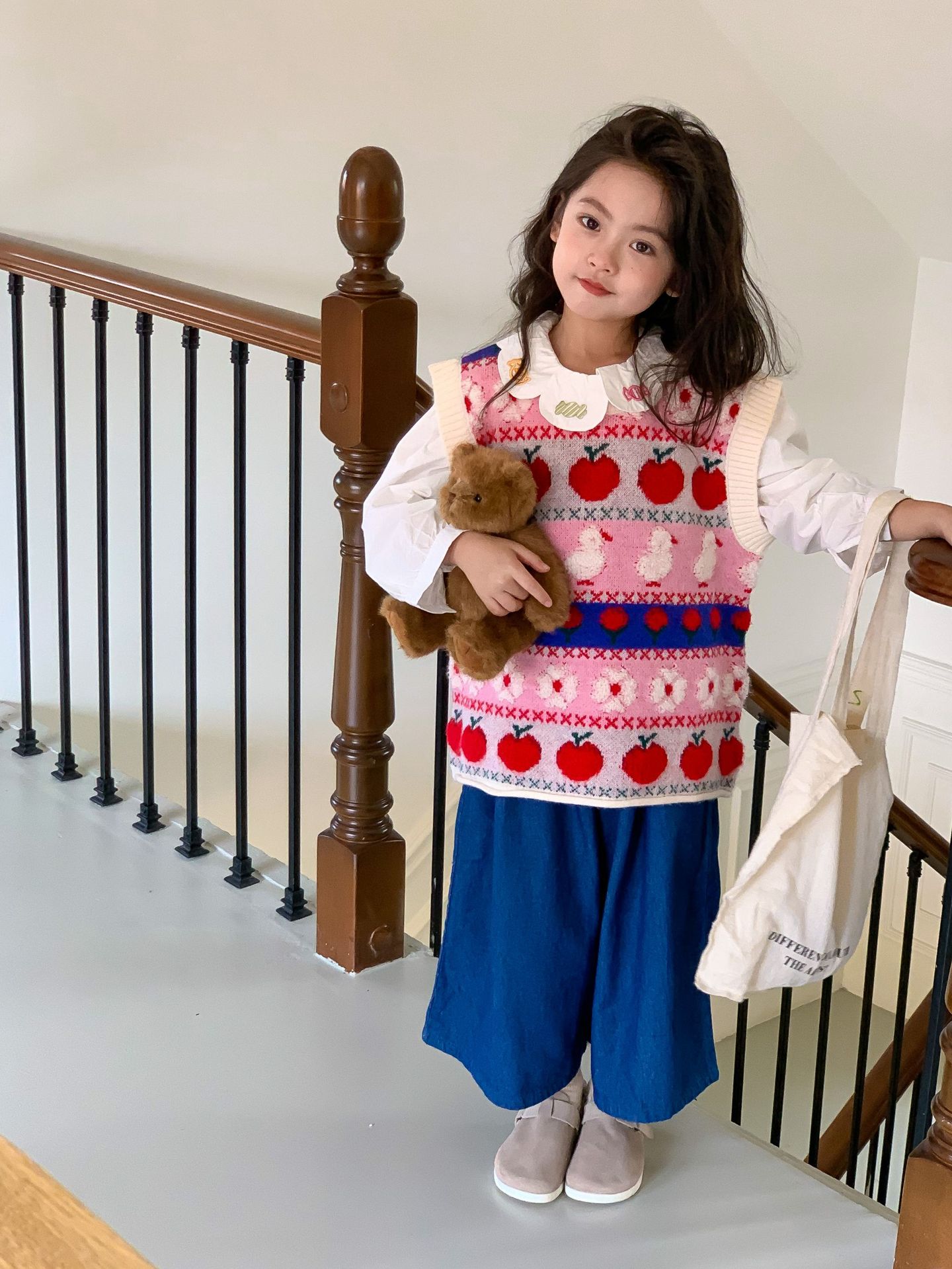 어린이 세트 한국식 아동복 2023 가을 소녀의 양모 조끼 만화 꽃 칼라 셔츠 와이드 레그 팬츠 3 종 세트스토어 가기