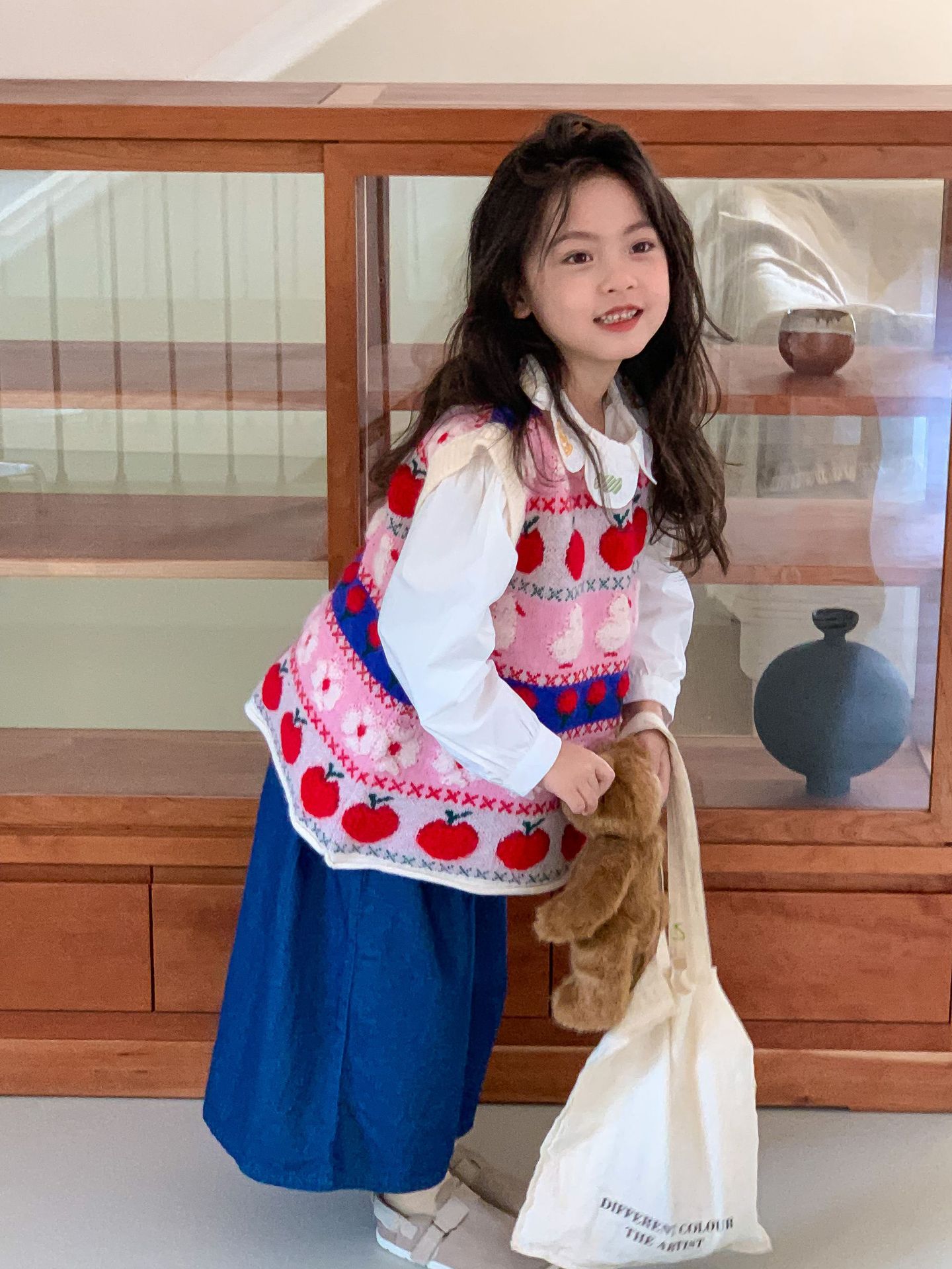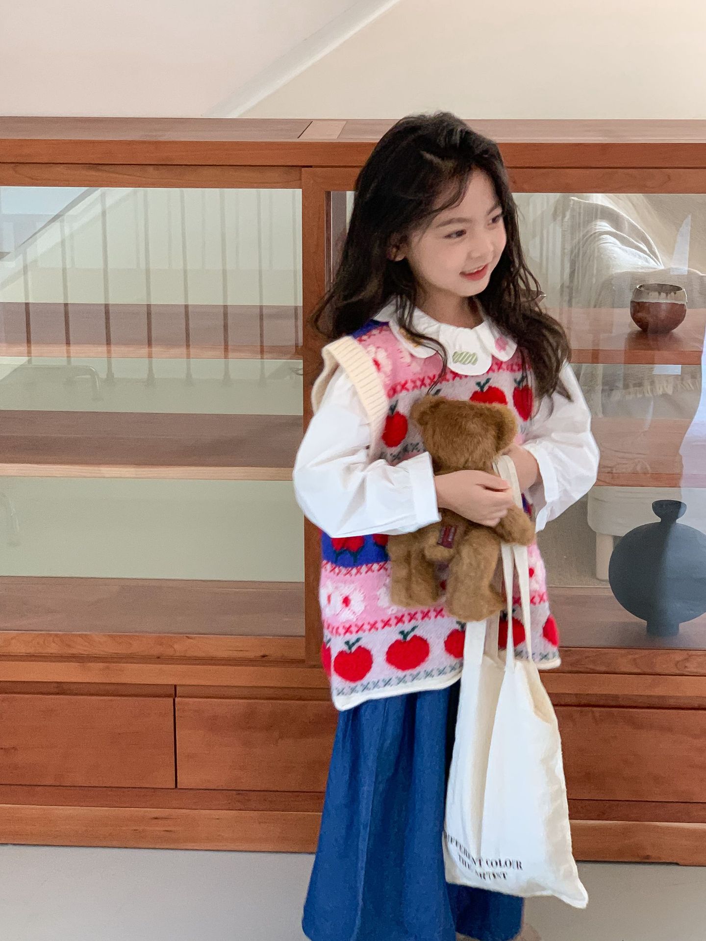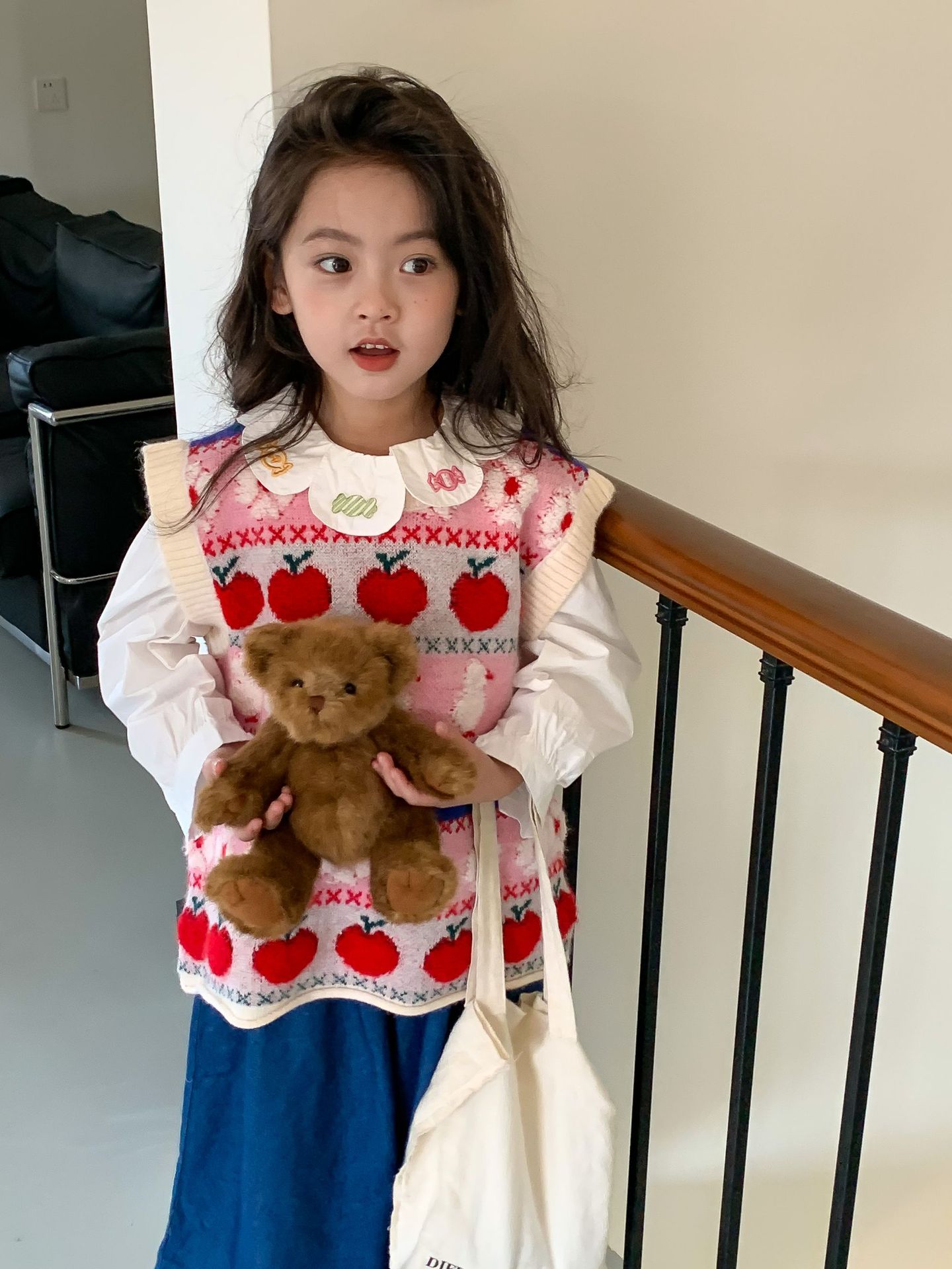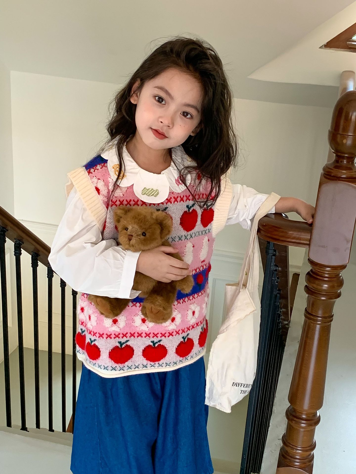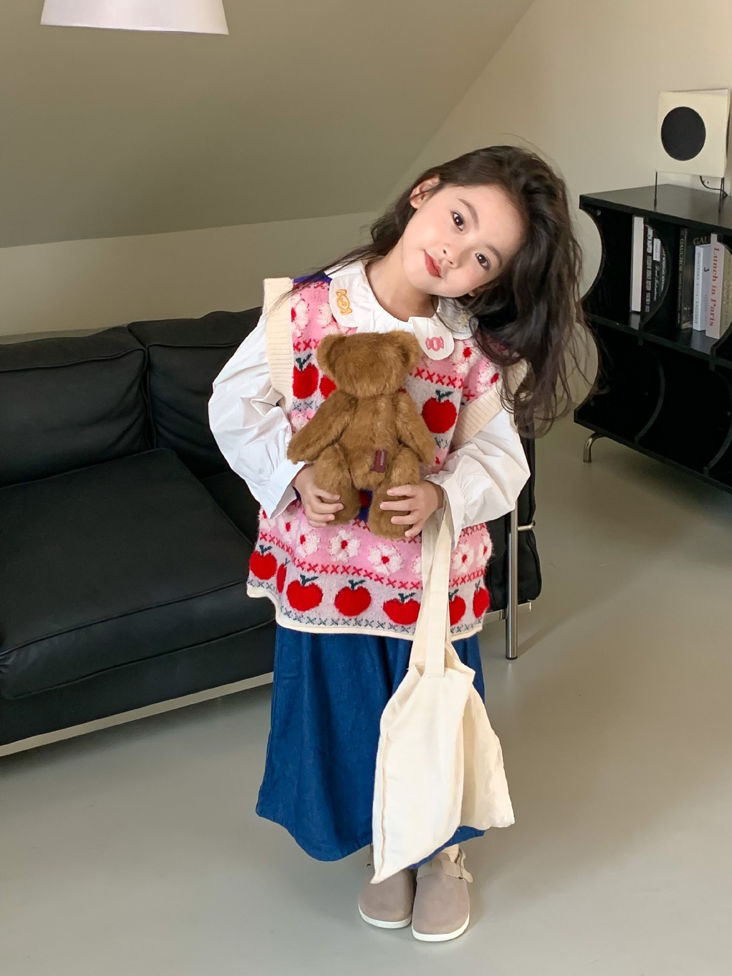 어린이 세트 한국식 아동복 2023 가을 소녀의 양모 조끼 만화 꽃 칼라 셔츠 와이드 레그 팬츠 3 종 세트스토어 가기