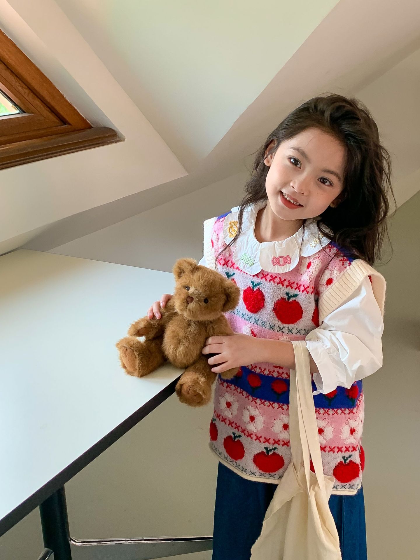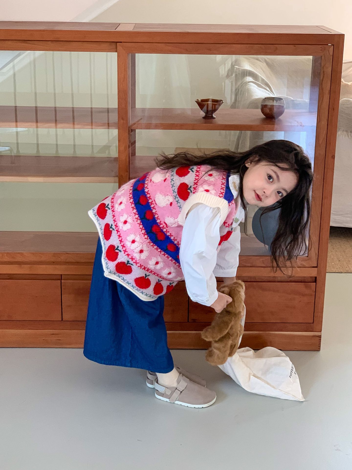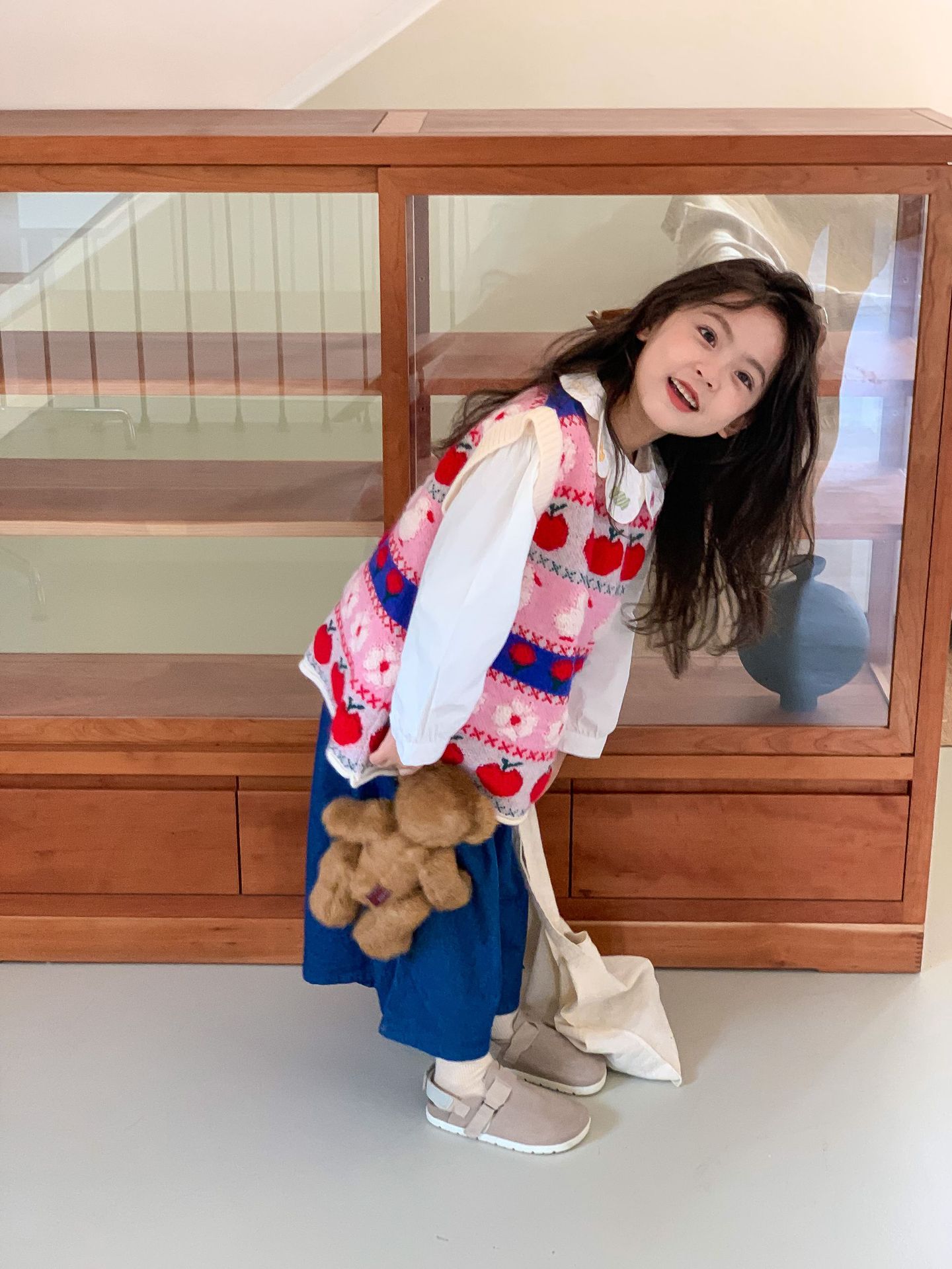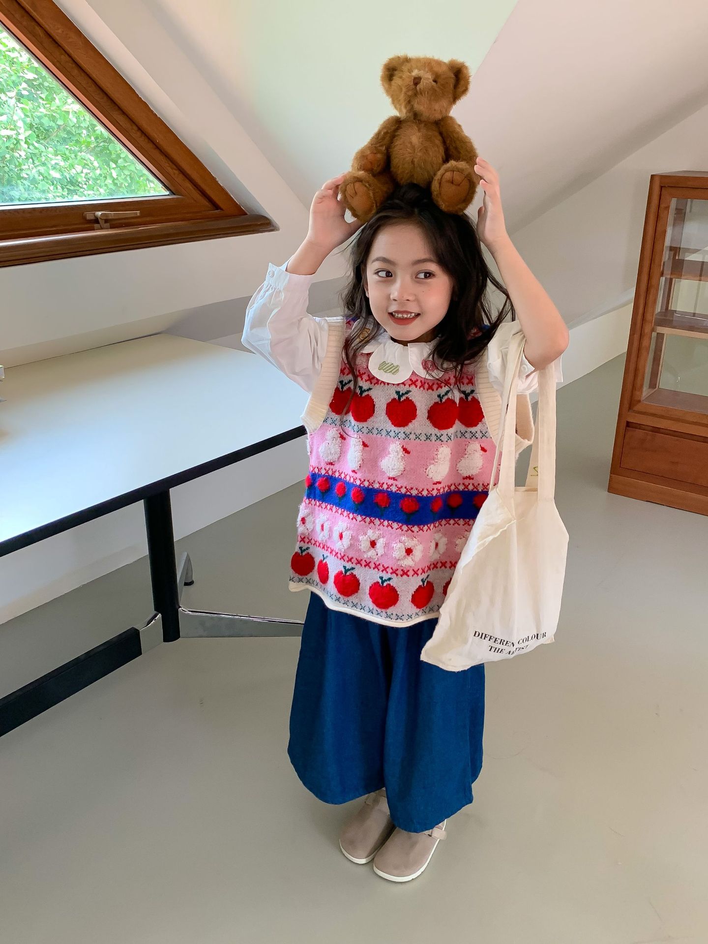 어린이 세트 한국식 아동복 2023 가을 소녀의 양모 조끼 만화 꽃 칼라 셔츠 와이드 레그 팬츠 3 종 세트스토어 가기