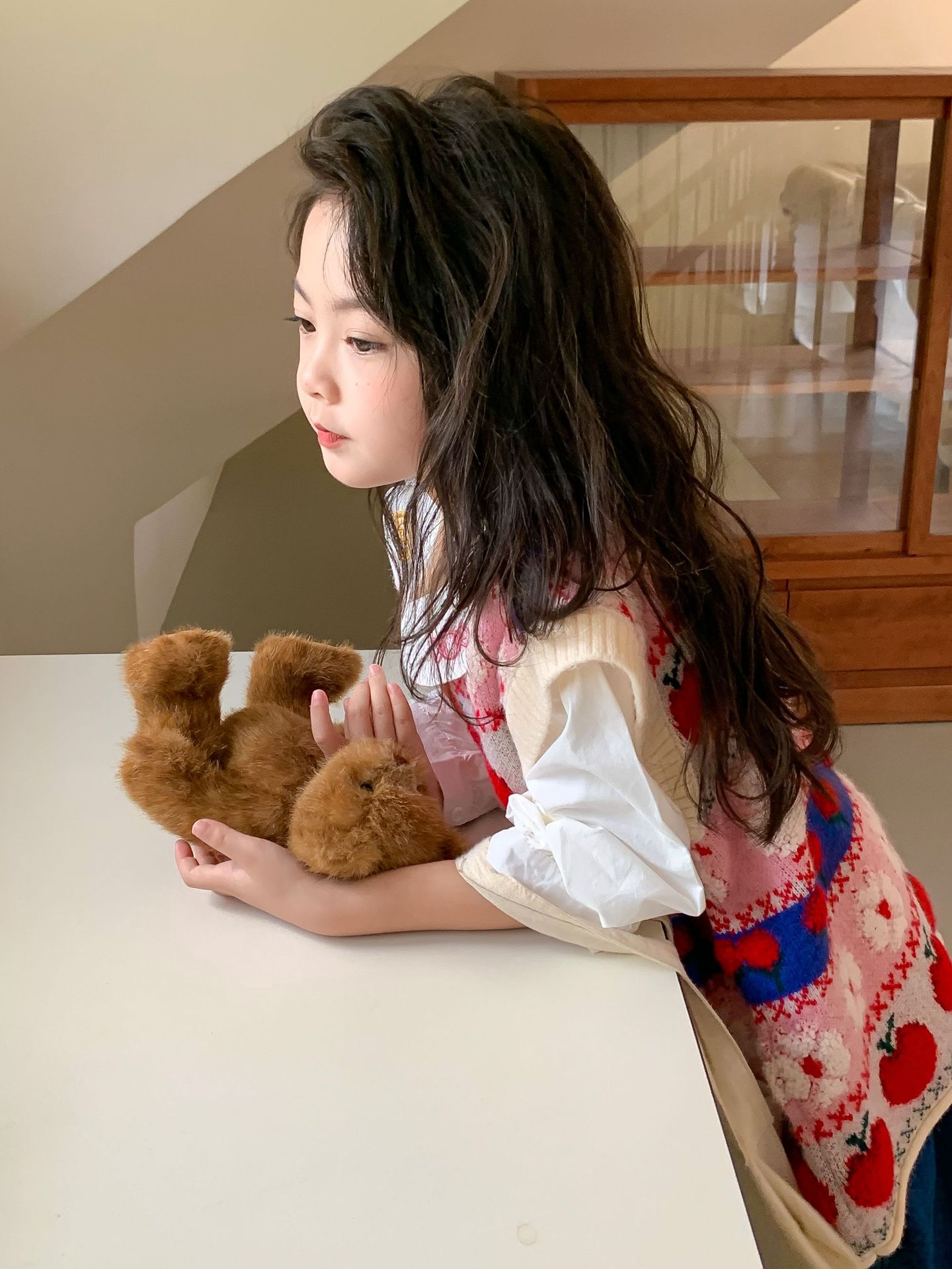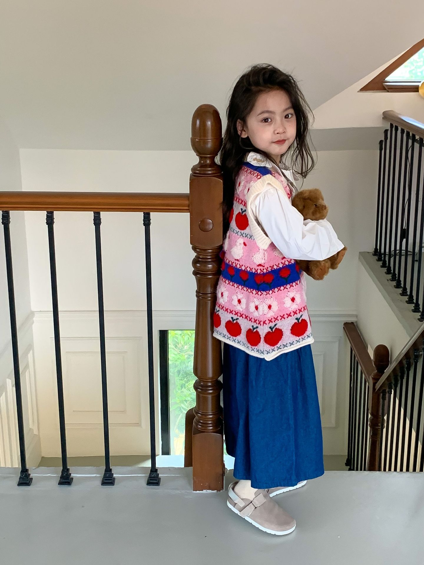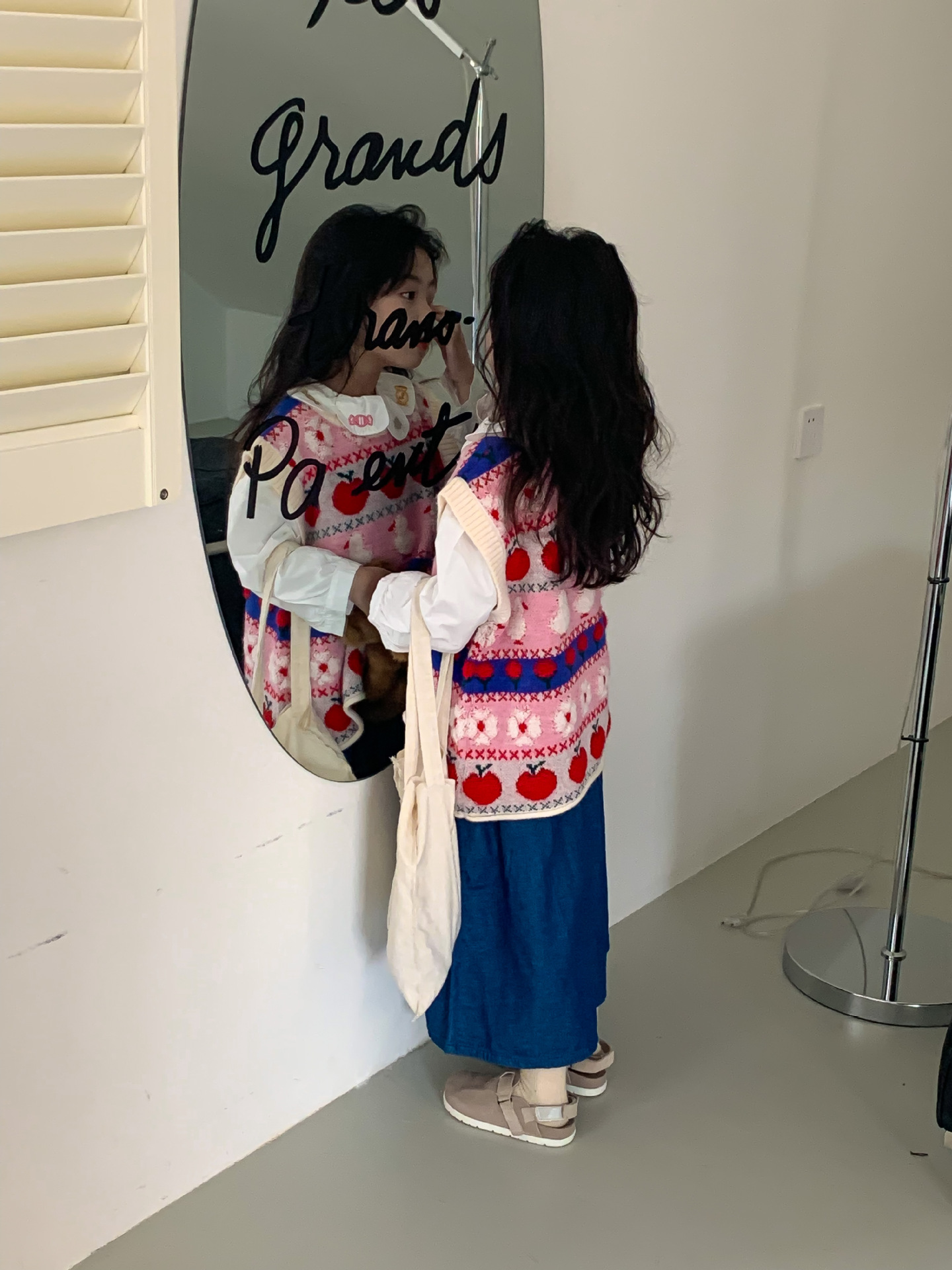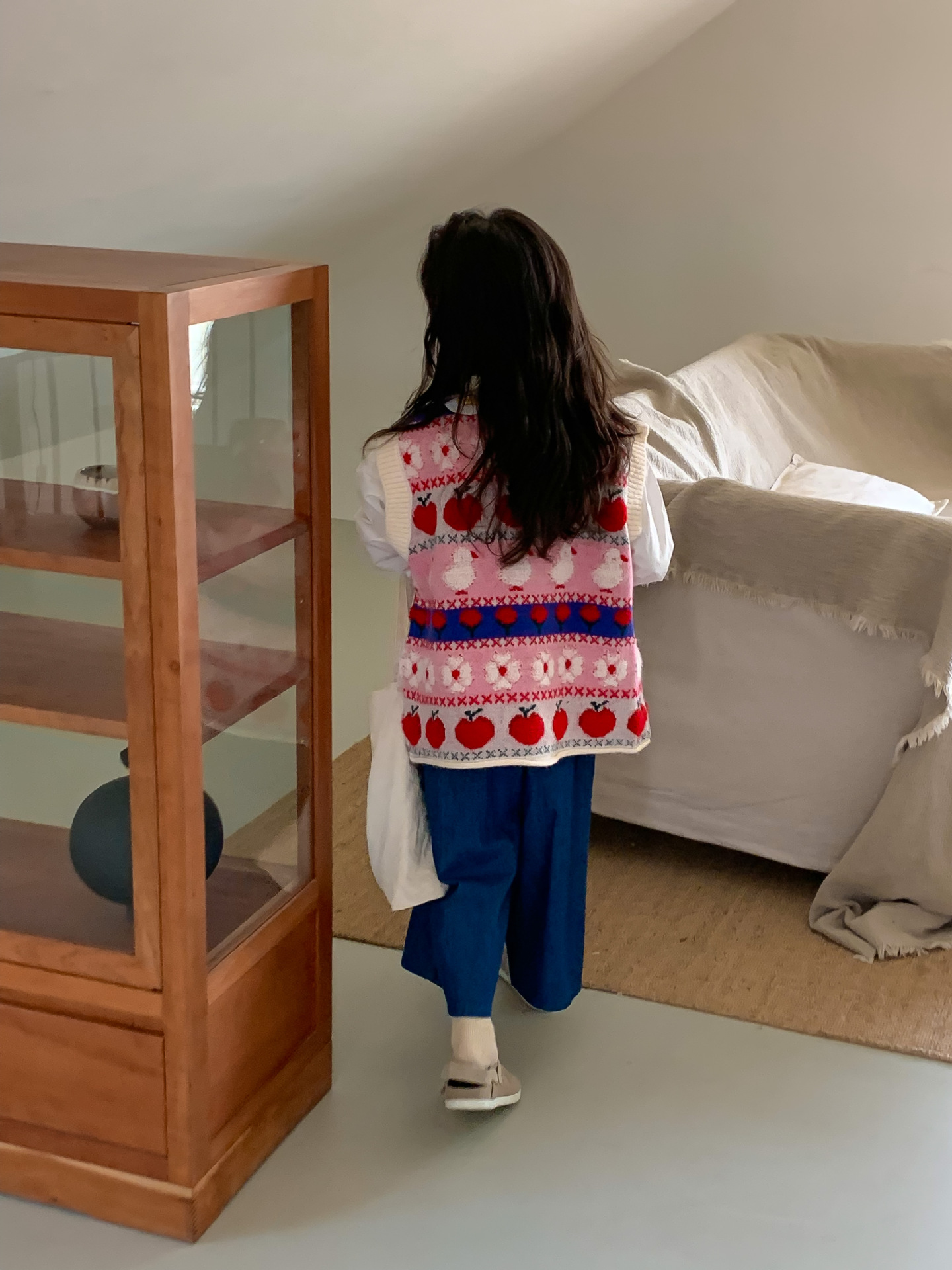 어린이 세트 한국식 아동복 2023 가을 소녀의 양모 조끼 만화 꽃 칼라 셔츠 와이드 레그 팬츠 3 종 세트스토어 가기