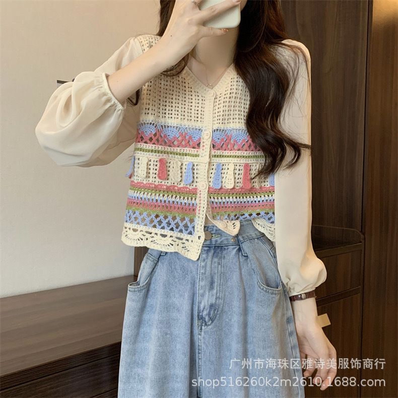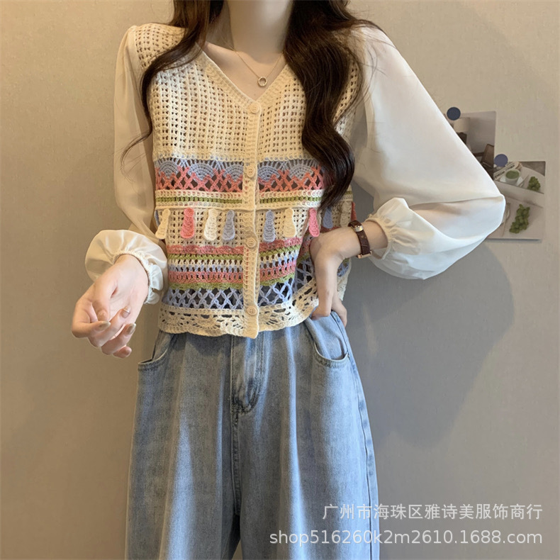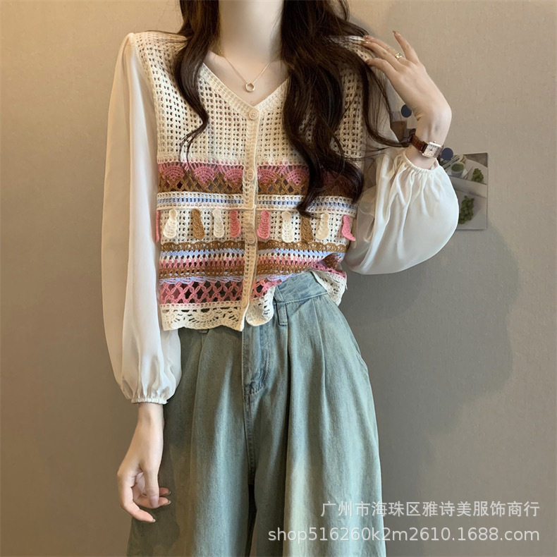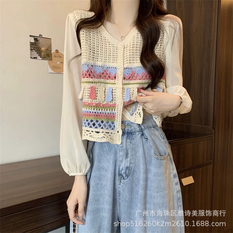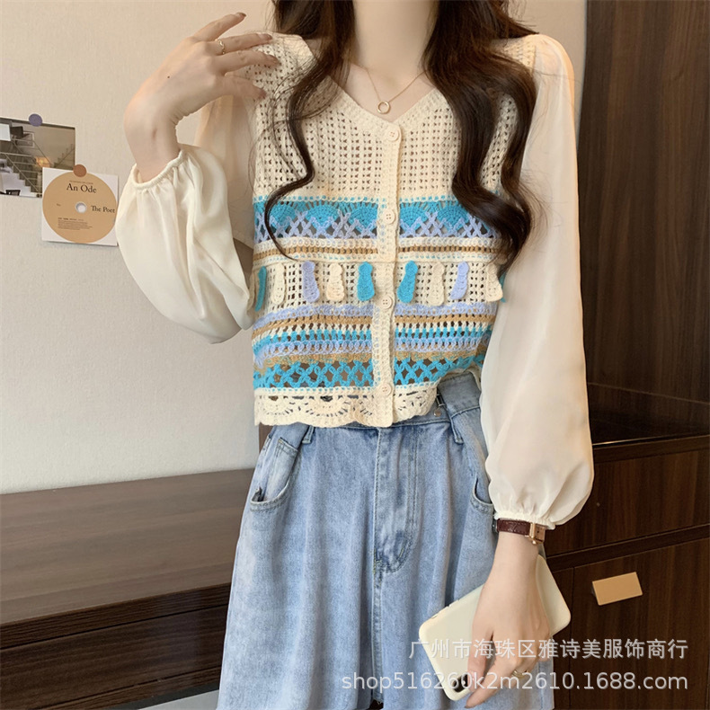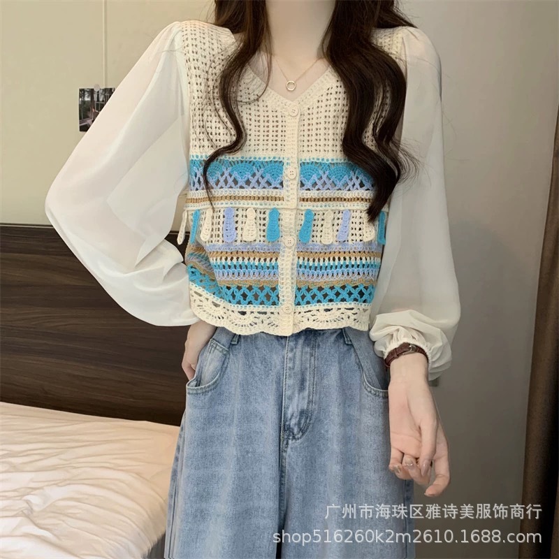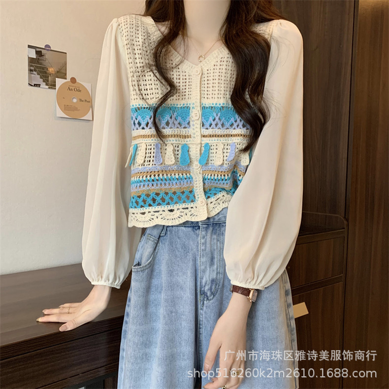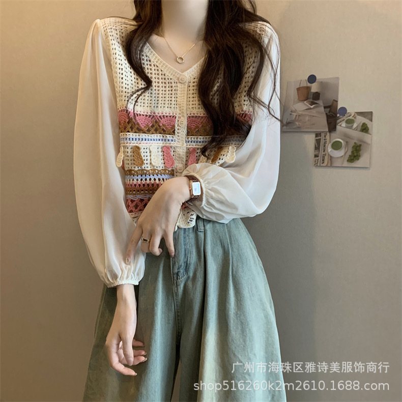 한국 스타일 세련된 틈새 독특한 쉬폰 셔츠 여성의 가을 V-넥 스티칭 중공 디자인 짧은 탑