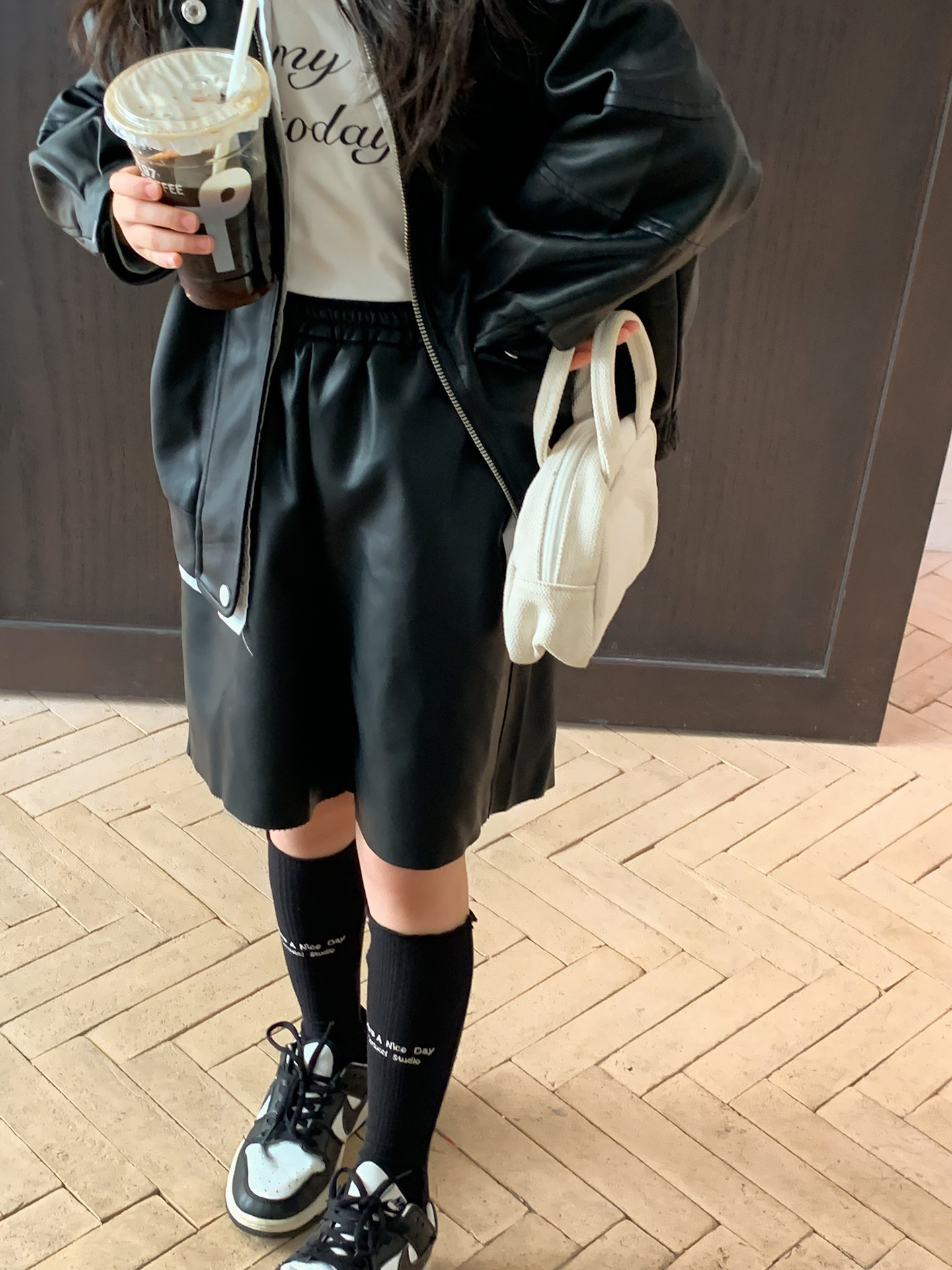 아동 가죽 팬츠, 큰 아동 5부 팬츠, Cong Xiaomei 2025 가을 스타일 여아 패셔너블 가죽 반바지, 단색 PU 캐주얼 미드팬츠