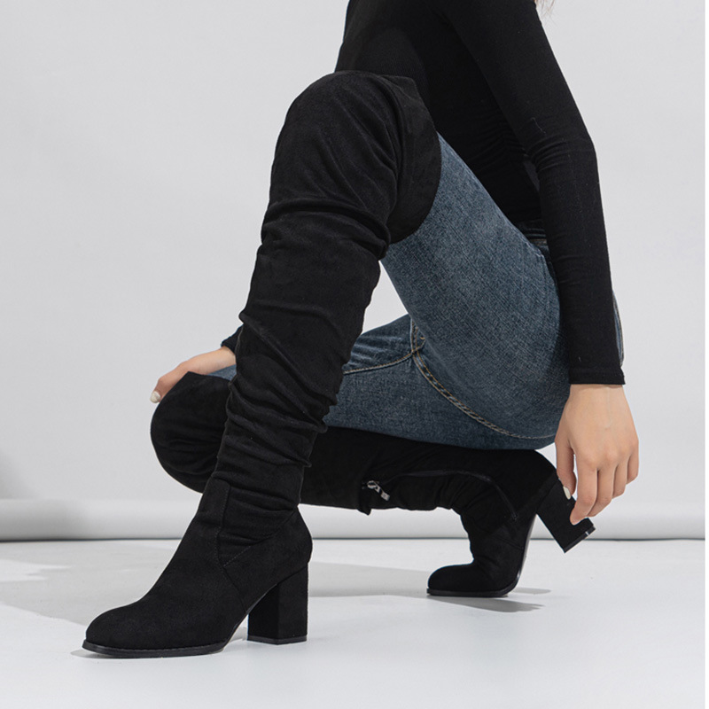 부츠 여성용 롱 부츠 높은 굽 2024 대외 무역 새로운 스웨이드 여성 프로스트 T-스테이지 두꺼운 굽 스트레치 오버 더-무릎 부츠