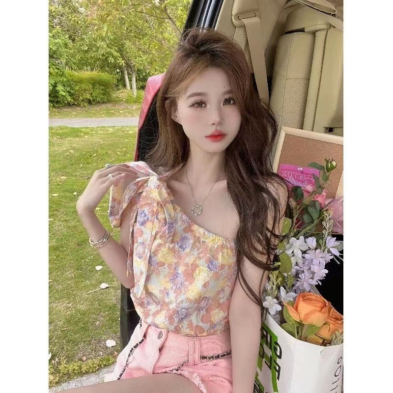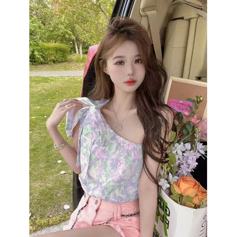 2024 유럽 및 미국 크로스보더 디자인 감성 휴가 스타일 유화풍 여성 여름 니치 오프숄더 끈 묶음 비대칭 어깨 디자인 여성복스토어 가기