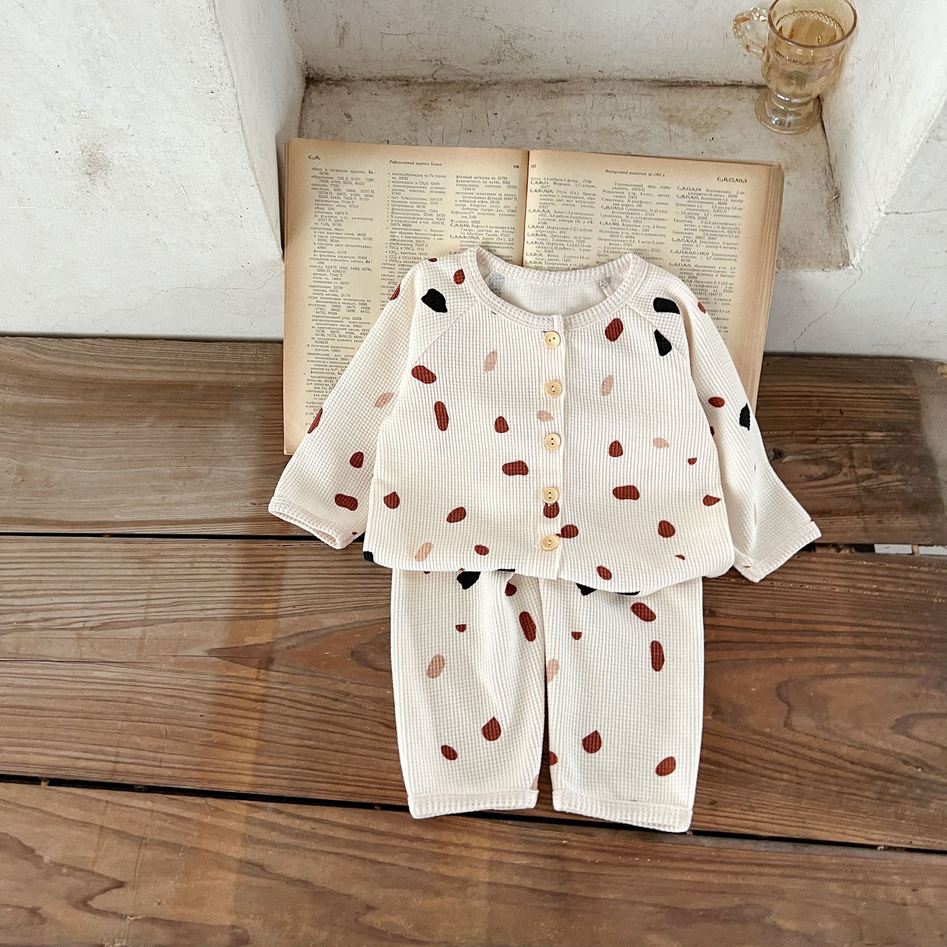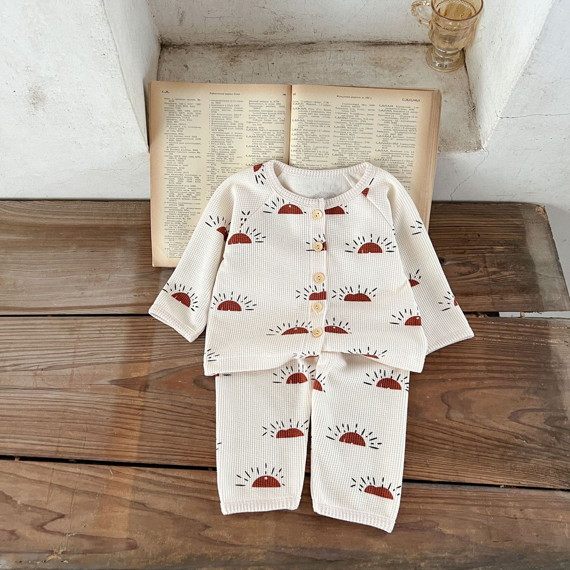 소년과 소녀를위한 한국 스타일 가을 아기 아기 덴마크 스타일 인쇄 가정 옷 세트 아기 면 와플 세트스토어 가기