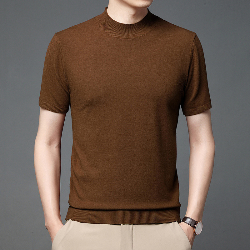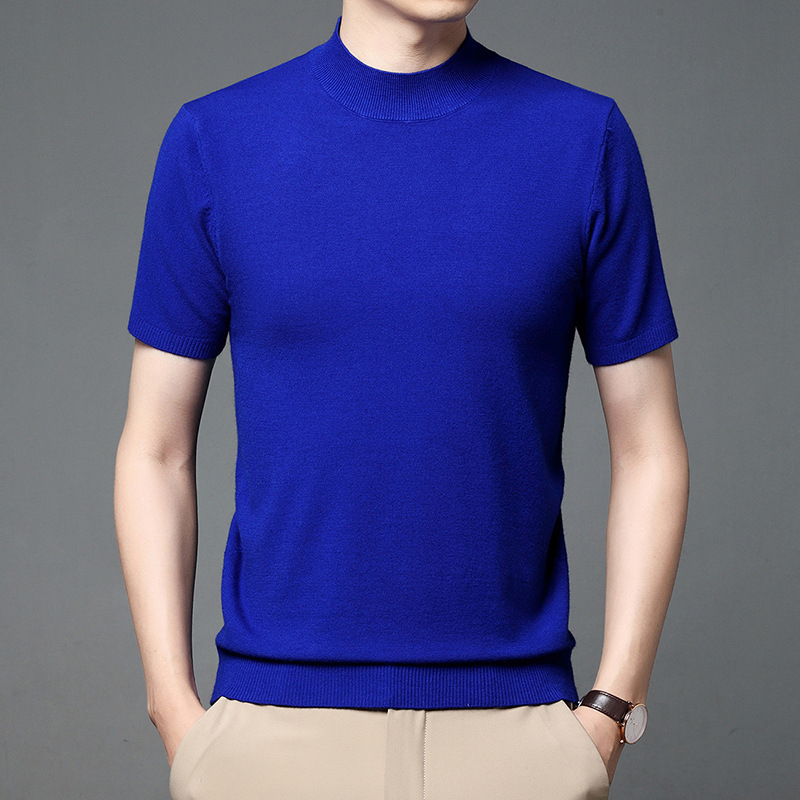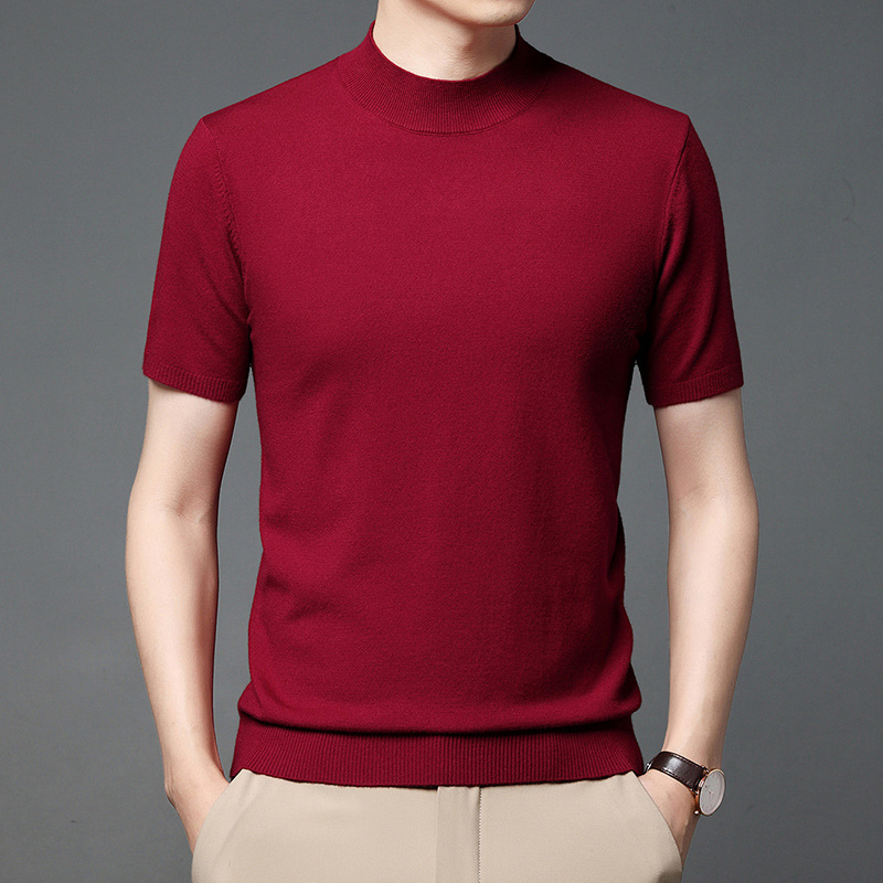 남성용 반 터틀넥 니트 반팔 스웨터 2023 봄과 여름 새로운 중년 및 젊은 남성용 단색 캐주얼 베이스 셔츠