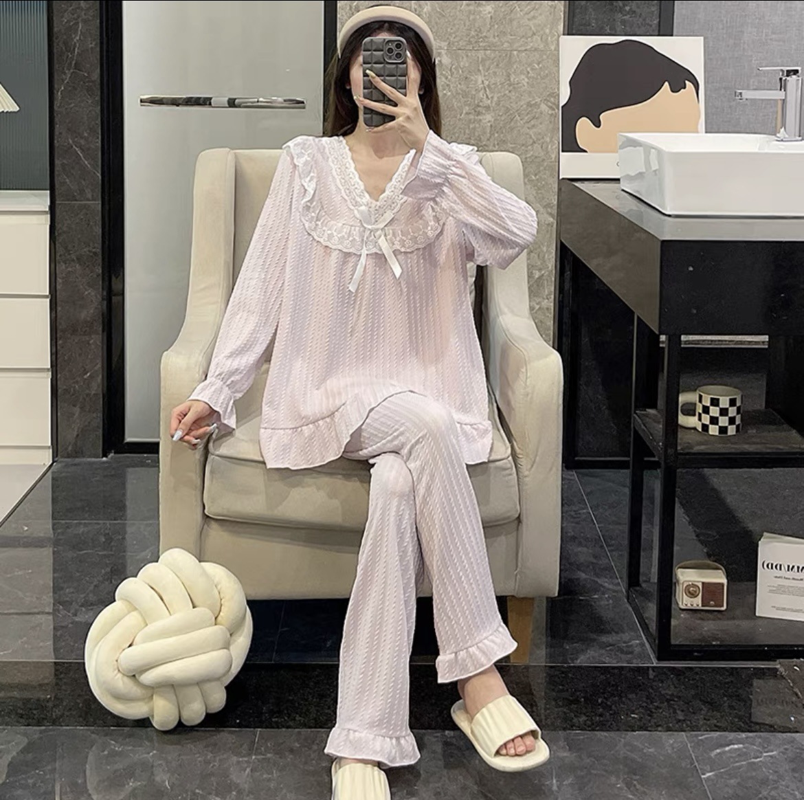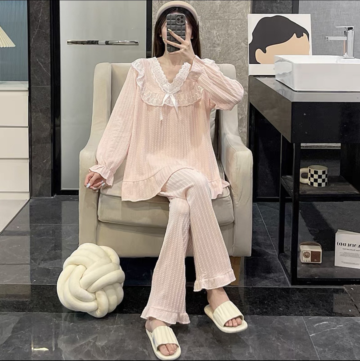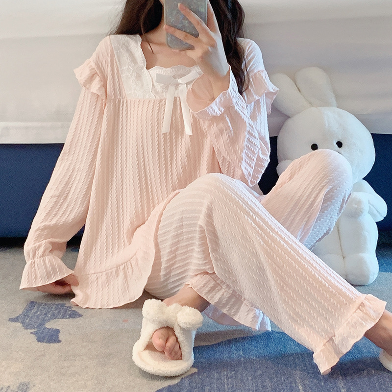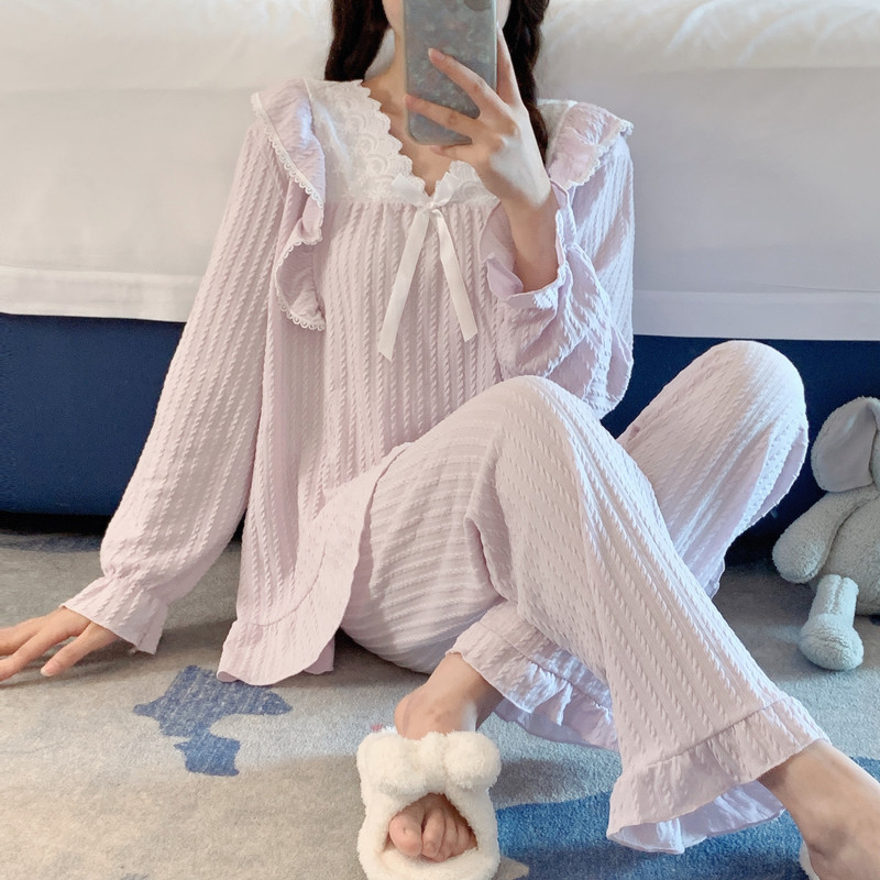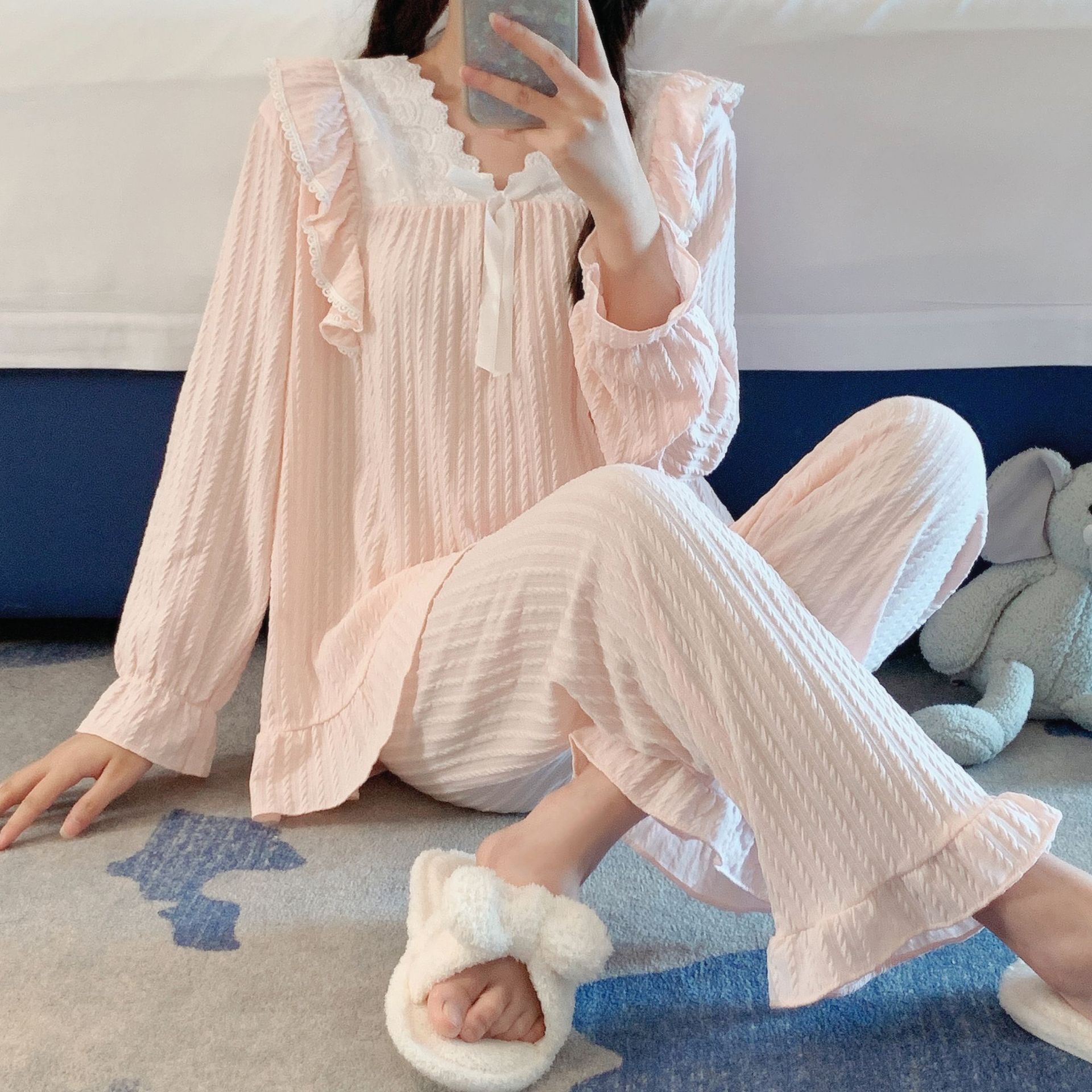 가을 새로운 잠옷 여자의 풀오버 자카드 면 달콤한 공주 스타일 긴 소매 바지 세트 편안한 가정 의류스토어 가기