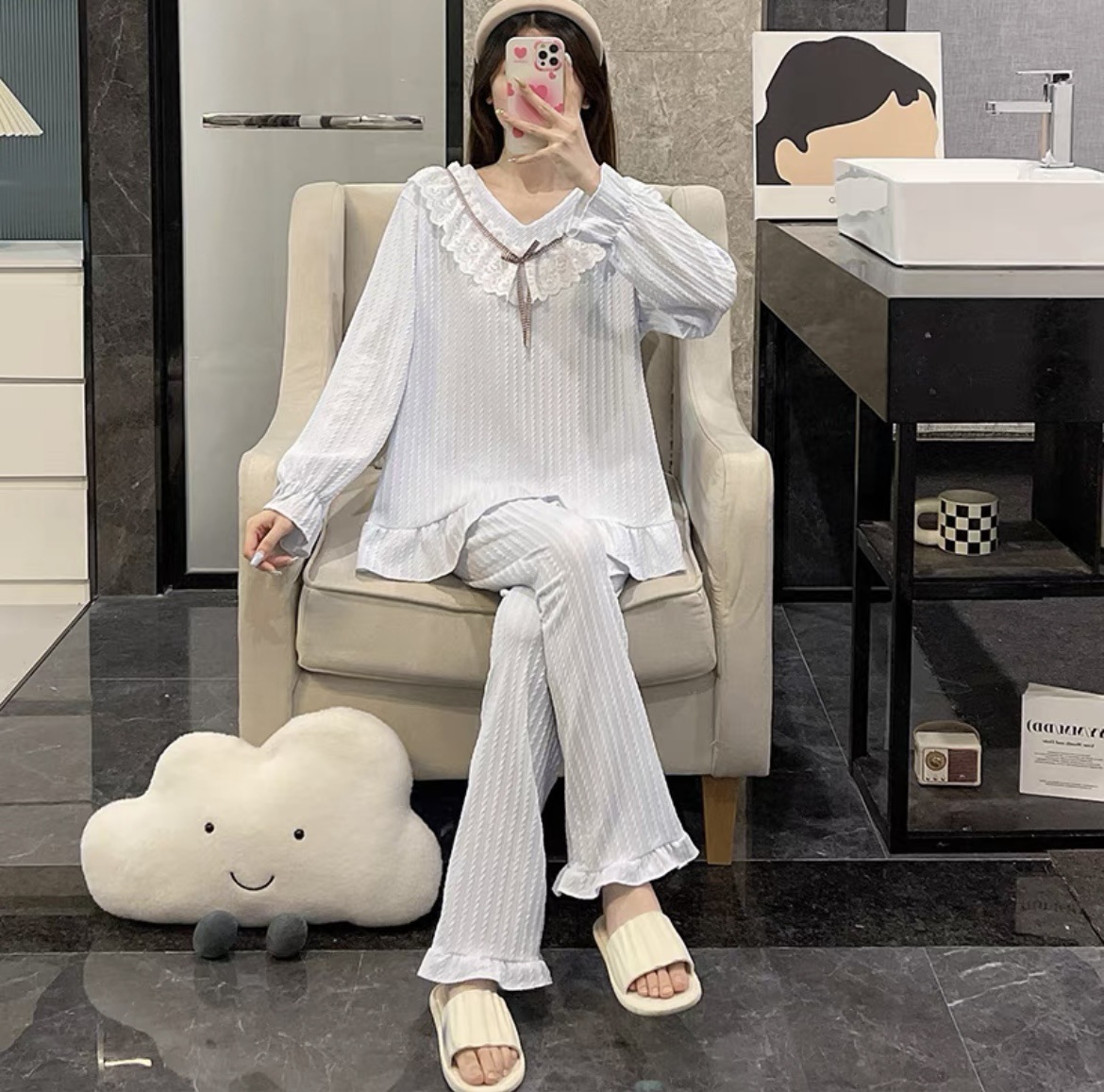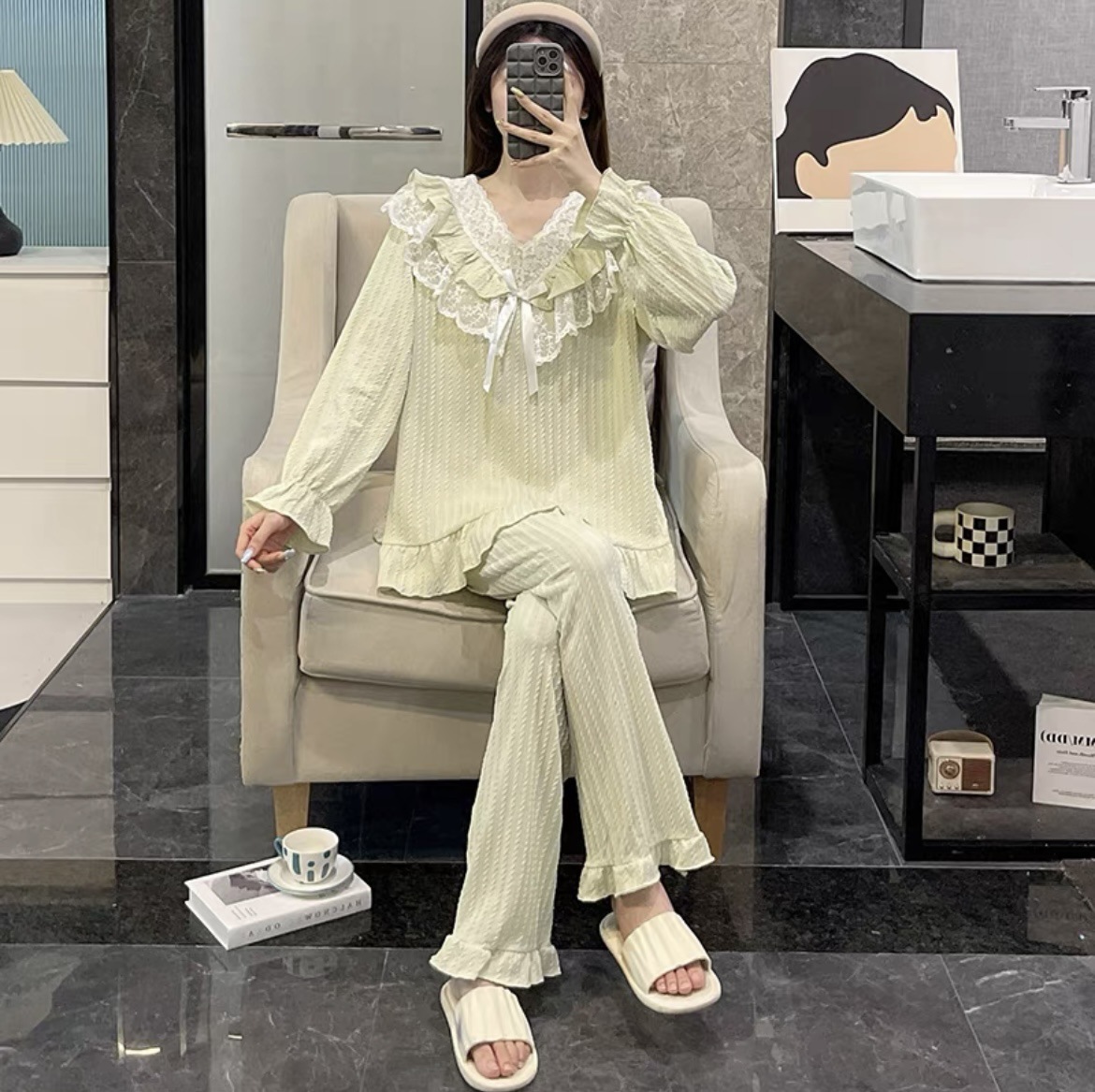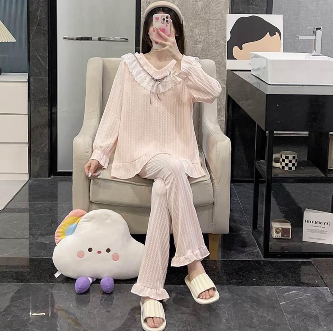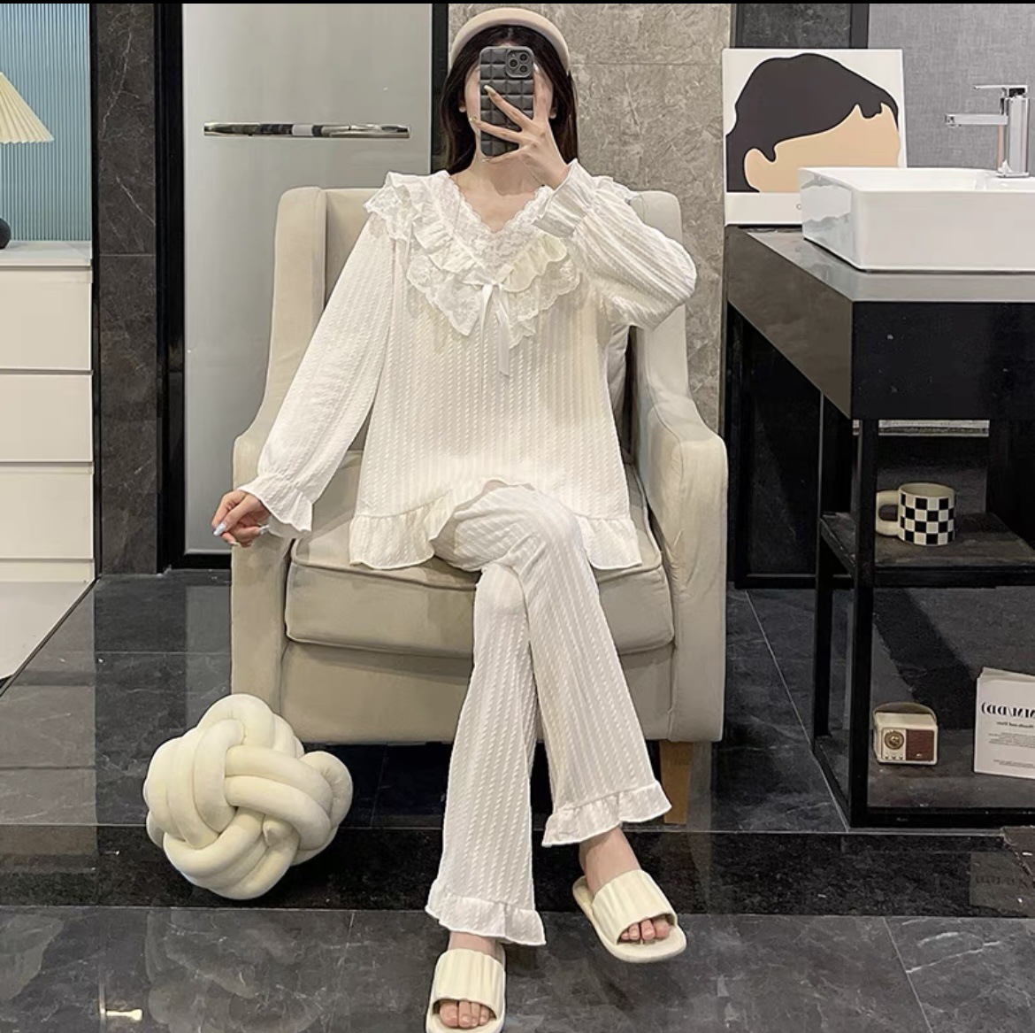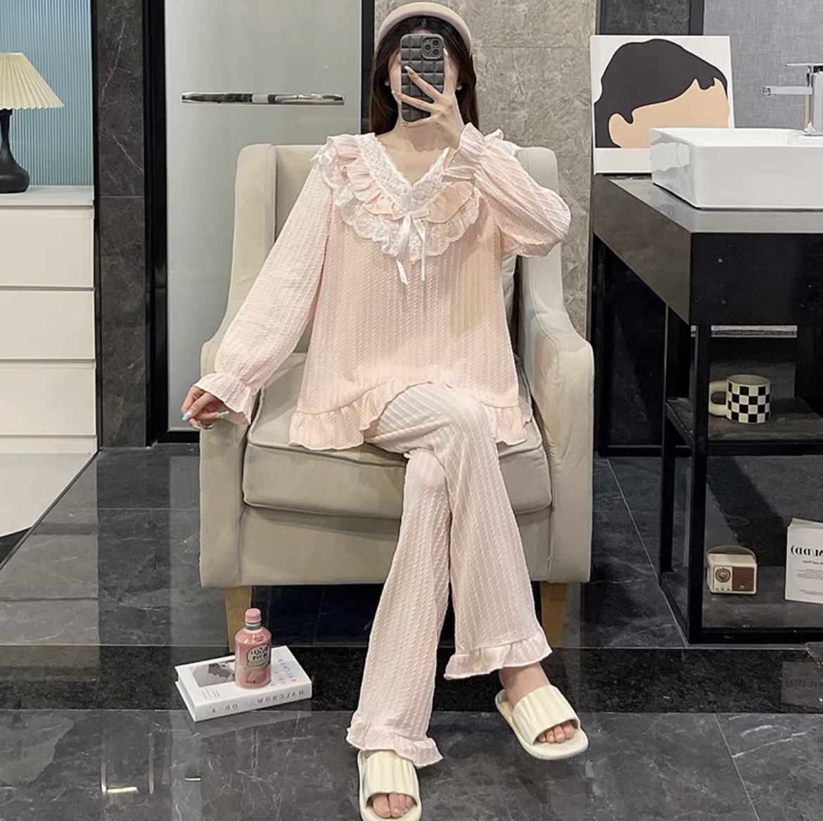 가을 새로운 잠옷 여자의 풀오버 자카드 면 달콤한 공주 스타일 긴 소매 바지 세트 편안한 가정 의류스토어 가기