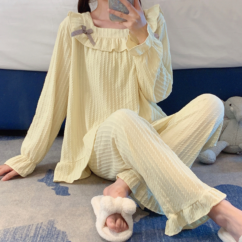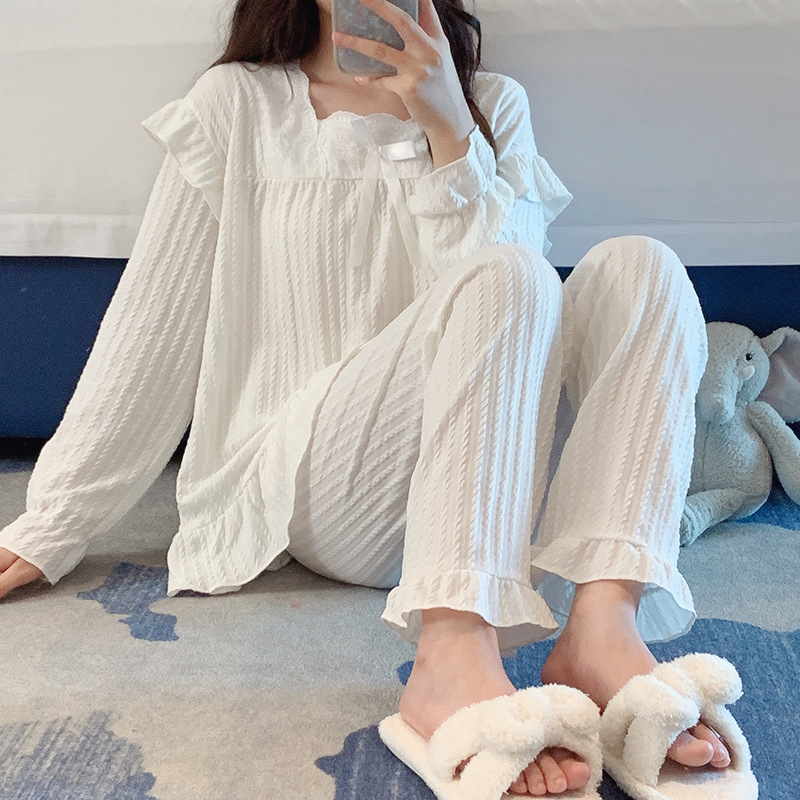 가을 새로운 잠옷 여자의 풀오버 자카드 면 달콤한 공주 스타일 긴 소매 바지 세트 편안한 가정 의류