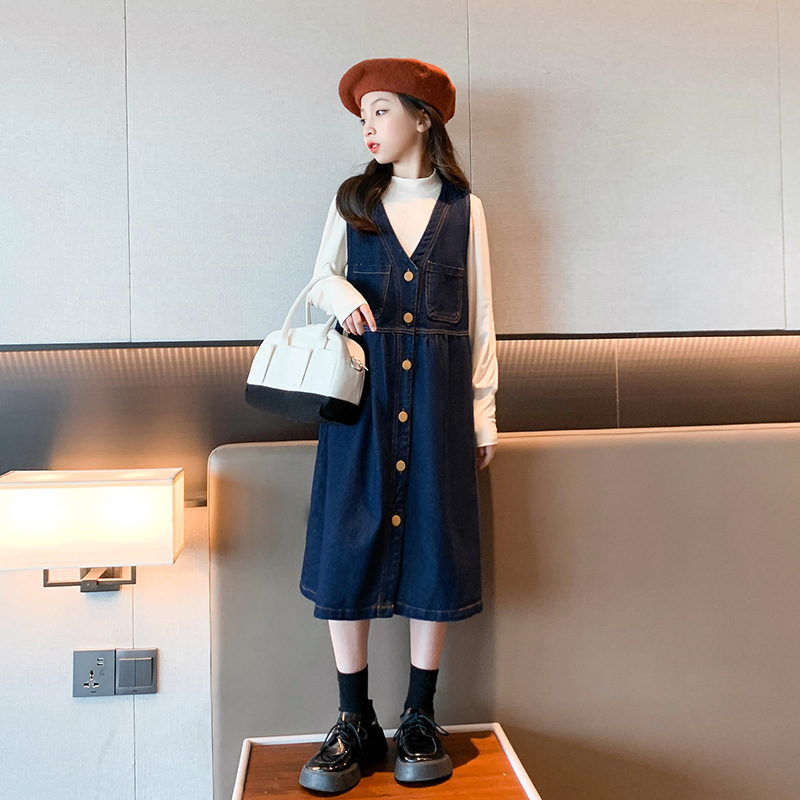 여아 드레스 봄, 가을 2024 새로운 어린이 가을 스타일 스커트 큰 어린이 가을 데님 서스펜더 스커트 정장스토어 가기