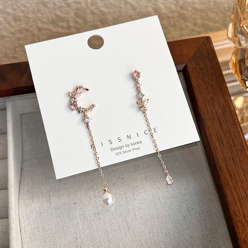 925 실버 바늘 비대칭 컬러 스타 문 지르콘 귀걸이 인터넷 연예인 요정 나비 꽃 진주 술 귀걸이