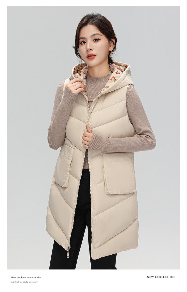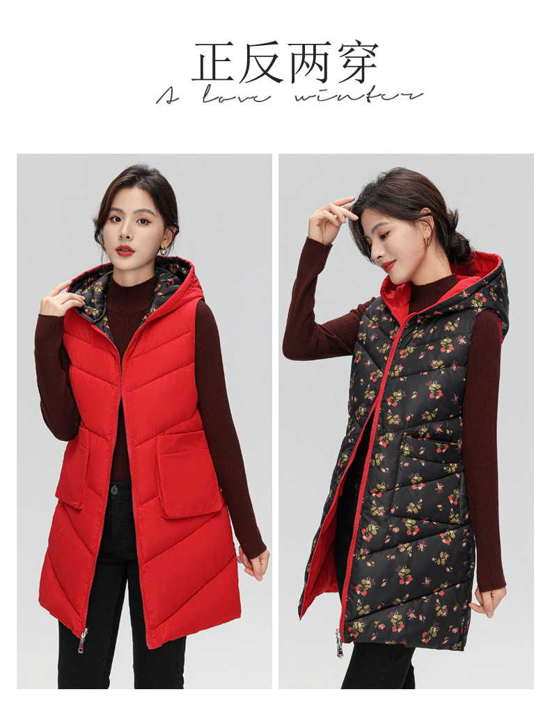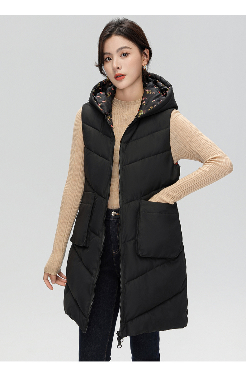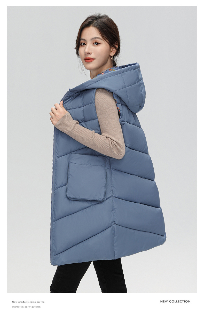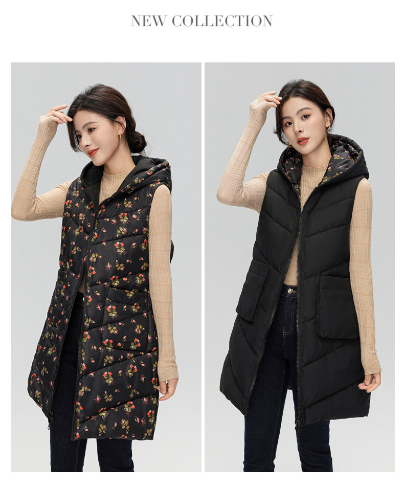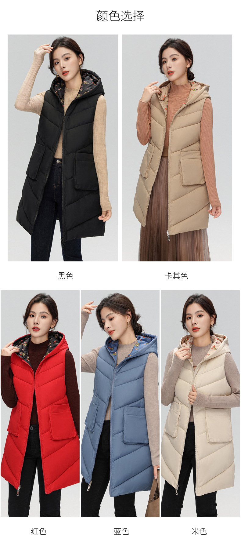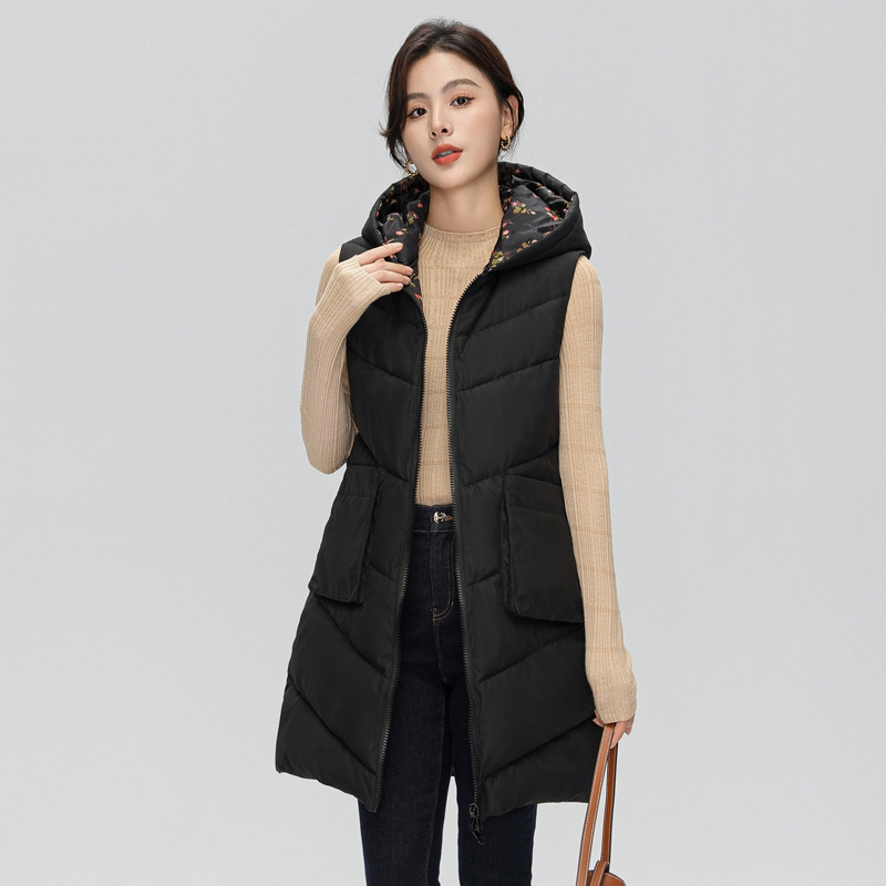 양면 착용 가능한 후드 면 조끼, 따뜻한 가을 겨울 여성용 중간 길이 2024 신상 한국 스타일 두꺼운 슬림핏 양면 착용 가능한 재킷