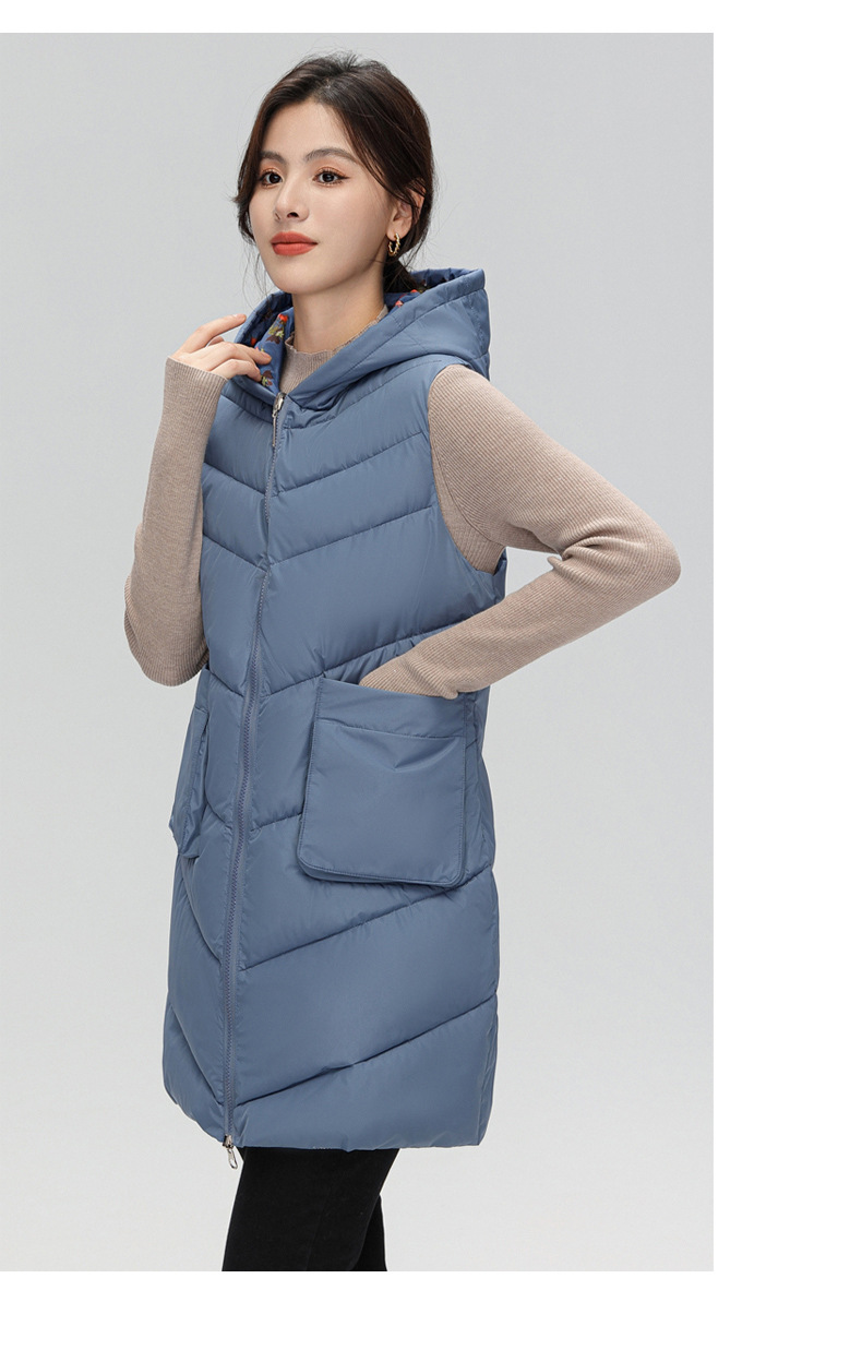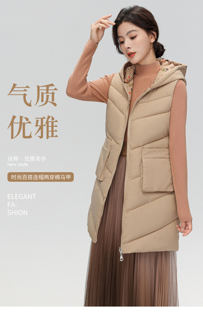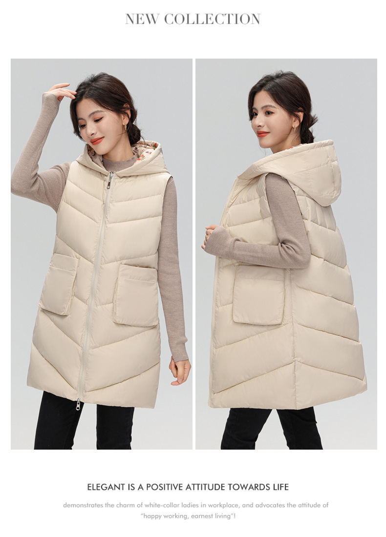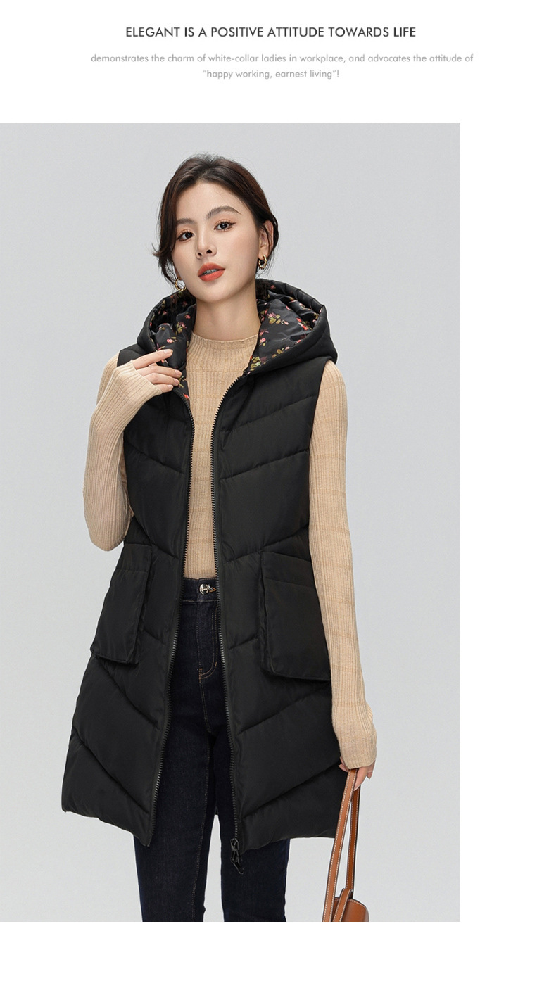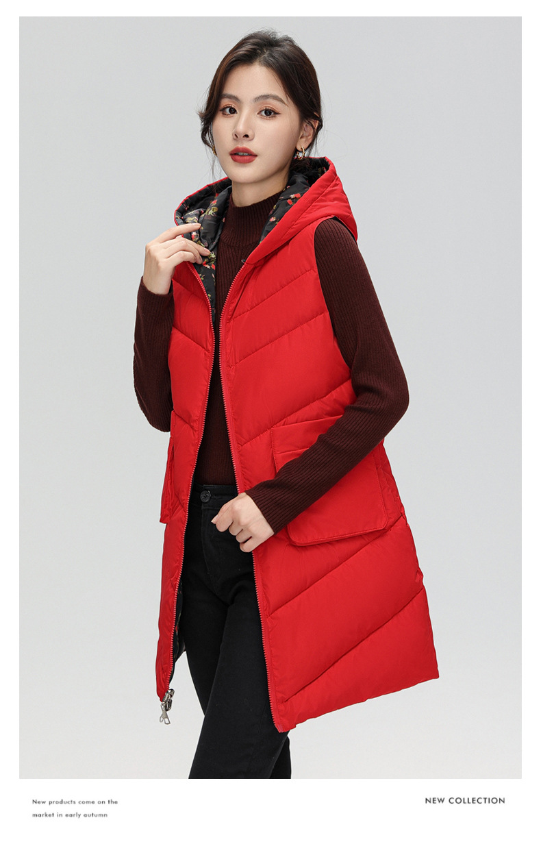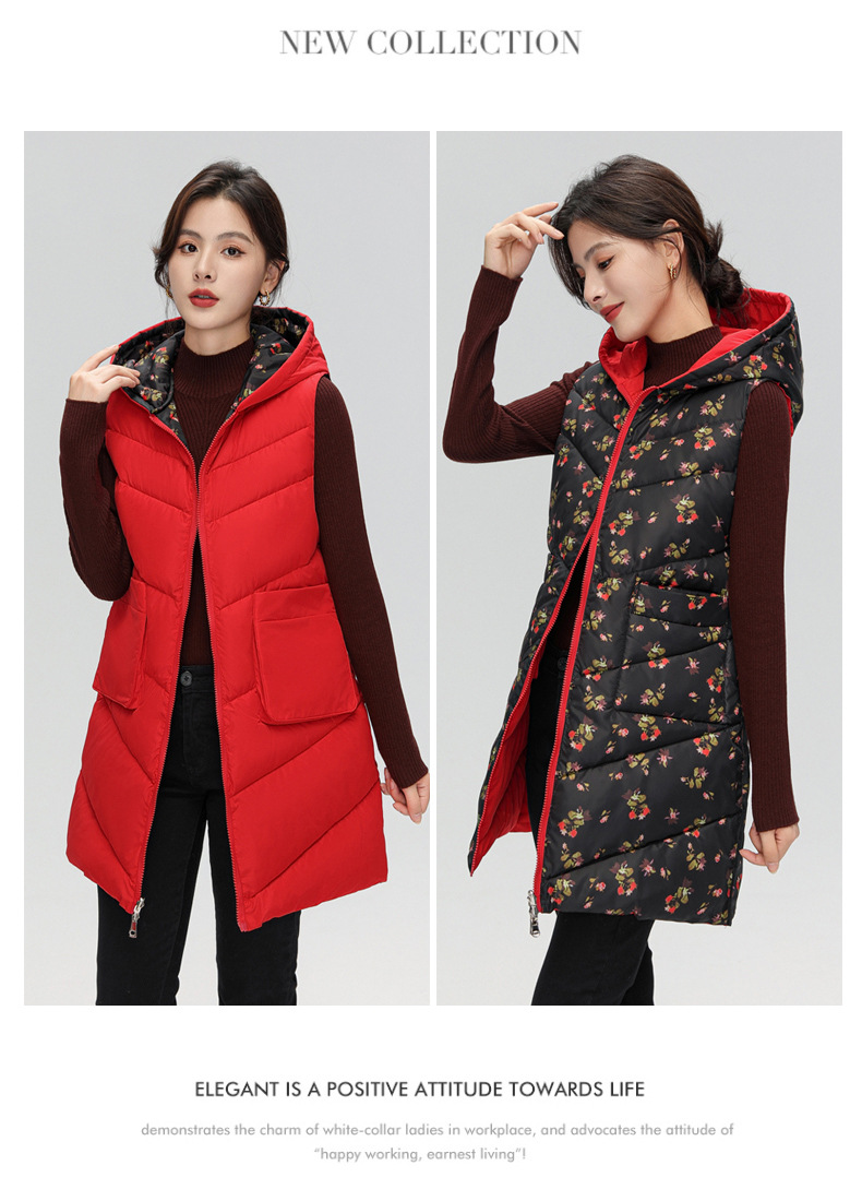 양면 착용 가능한 후드 면 조끼, 따뜻한 가을 겨울 여성용 중간 길이 2024 신상 한국 스타일 두꺼운 슬림핏 양면 착용 가능한 재킷