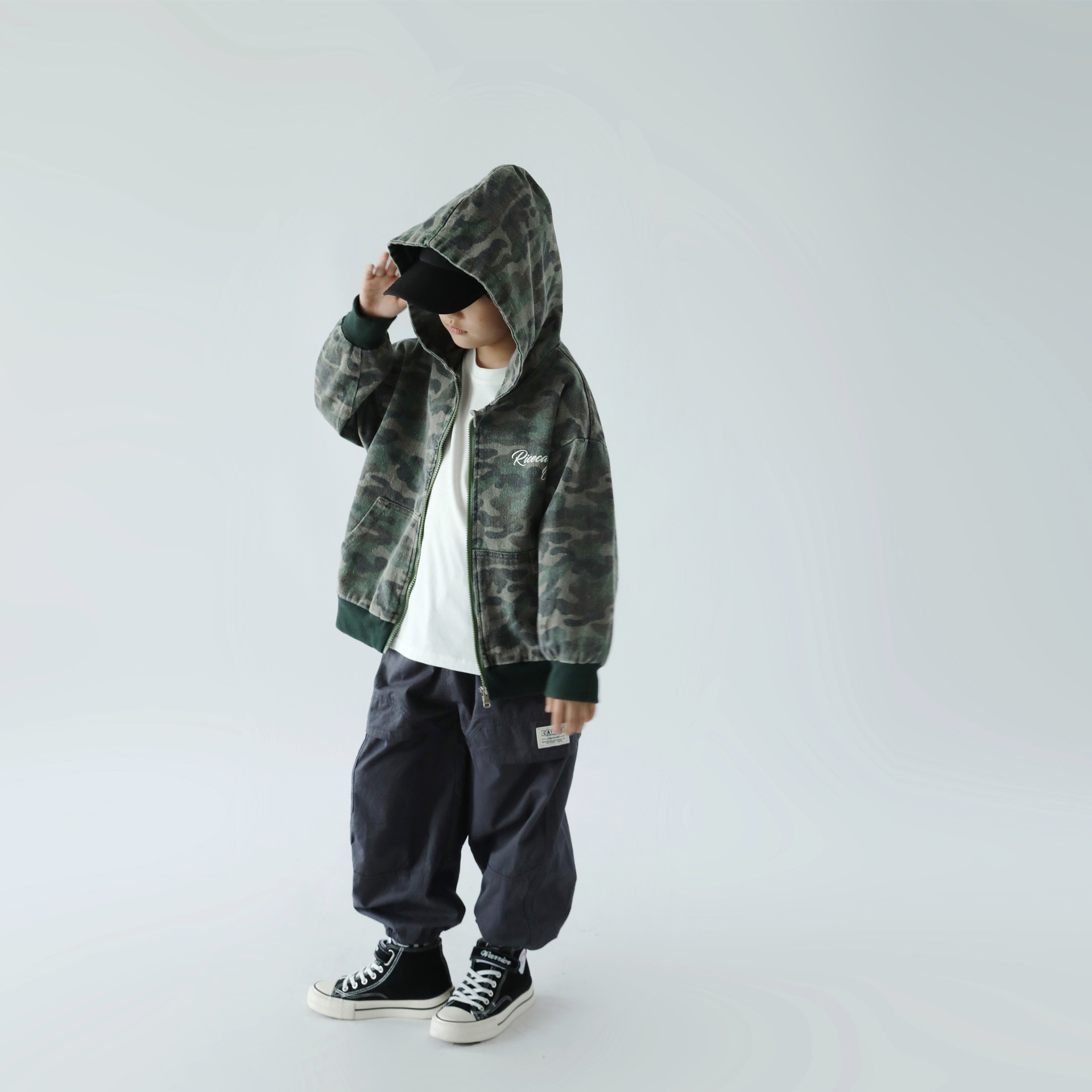 가을 2023 새로운 소년 캐주얼 잘 생긴 후드 탑 빅 키즈 패션 위장 재킷 트렌디 한 어린이 재킷스토어 가기