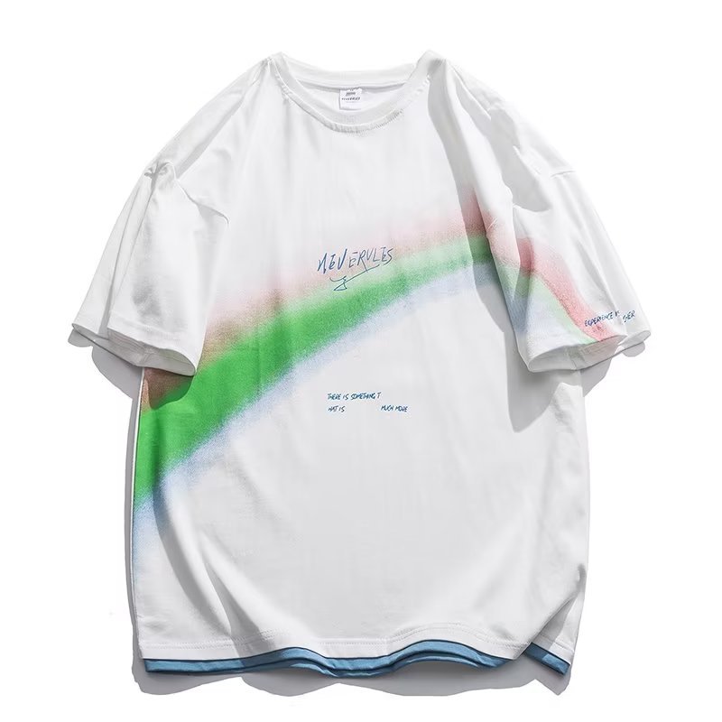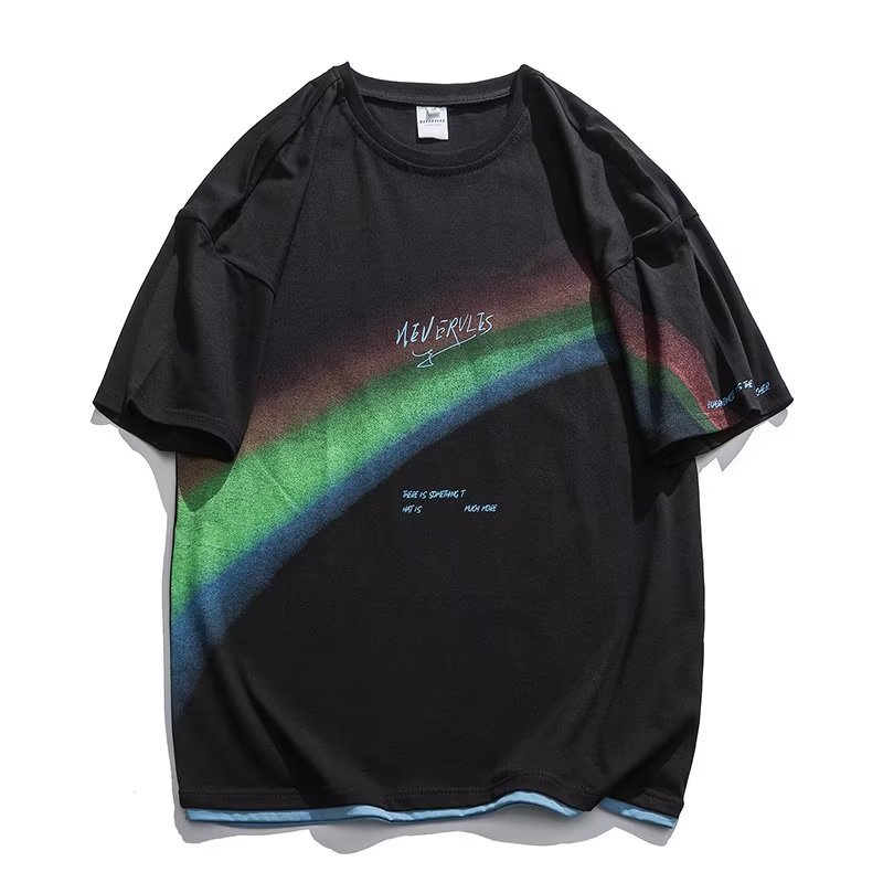 (면) 레인보우 레터 프린팅 반팔 티셔츠 남성용 라운드 넥 루즈한 캐주얼 틈새 십대를위한 모든 매치 커플 의류