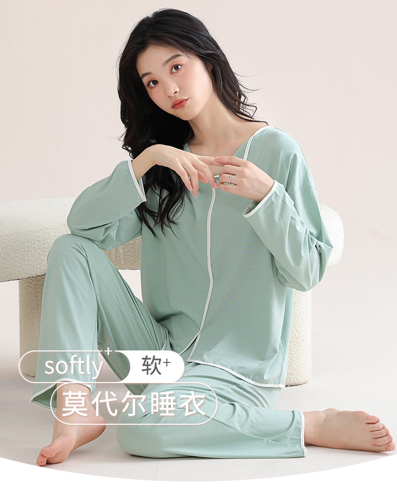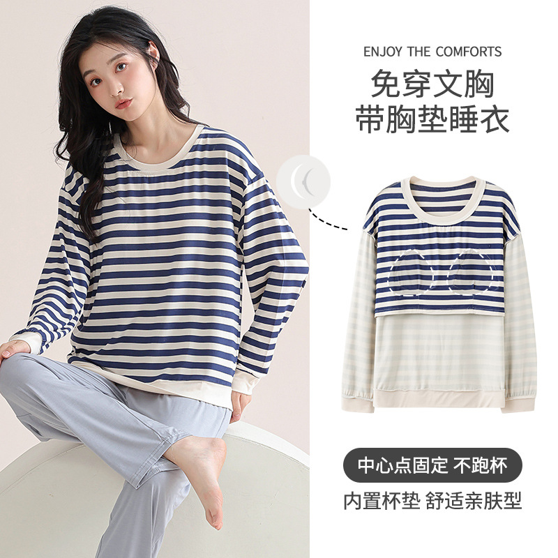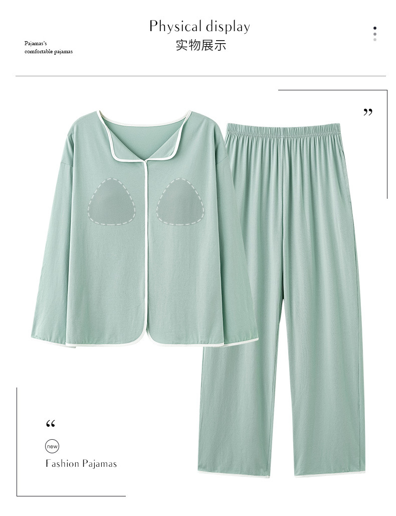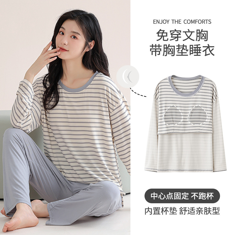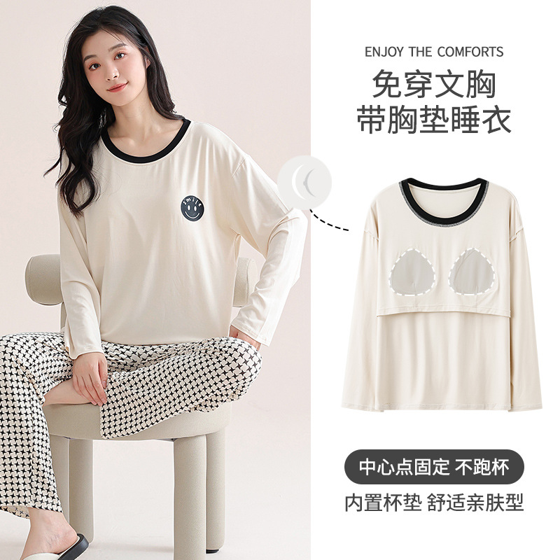 여성 잠옷 가을 새로운 모달 가슴 패드 긴 소매 바지는 Homewear 세트 Dropshipping 외부 착용 가능