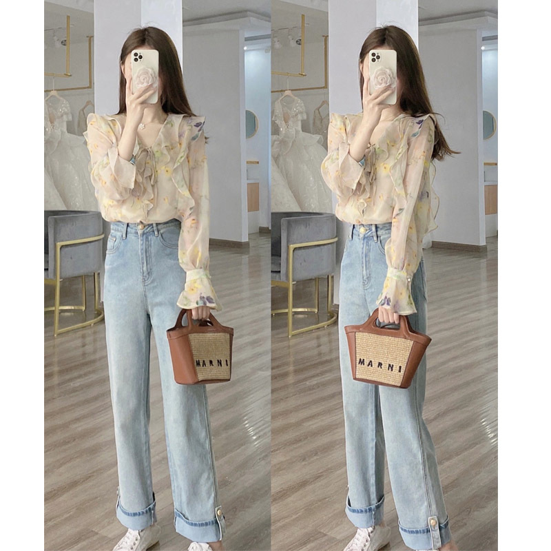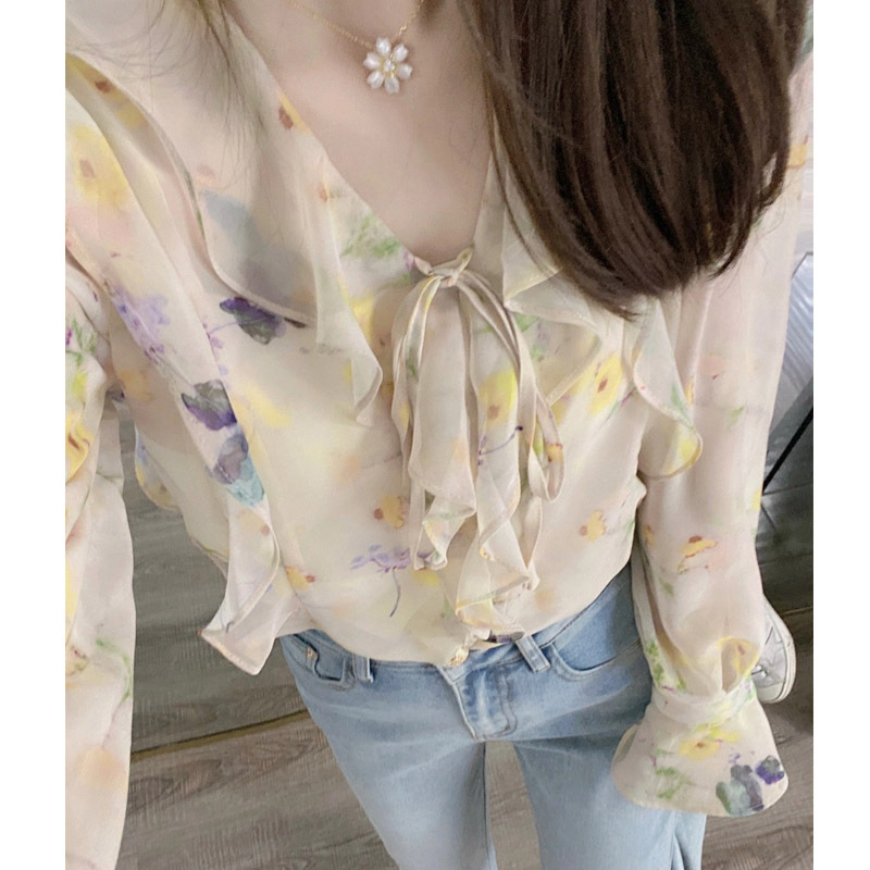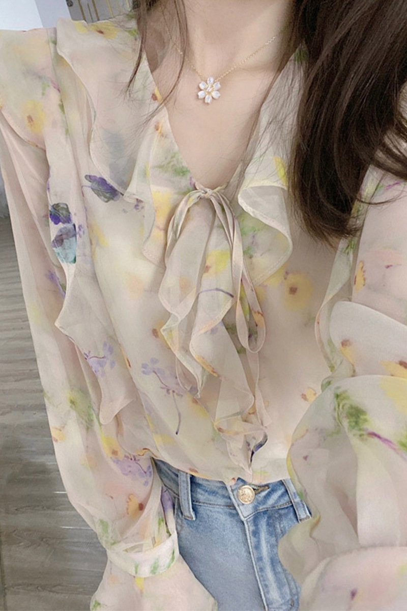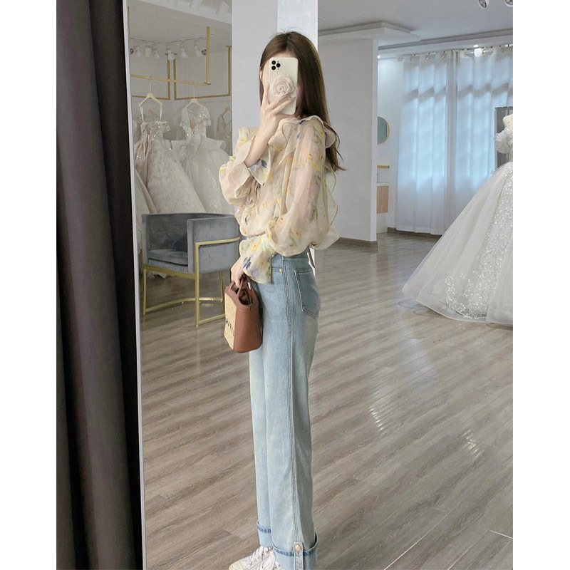 여성용 자외선 차단 꽃무늬 셔츠, 여름 프렌치 니치 디자인, 기질이 있는 작은 셔츠, 얇은 긴팔 쉬폰 탑스토어 가기