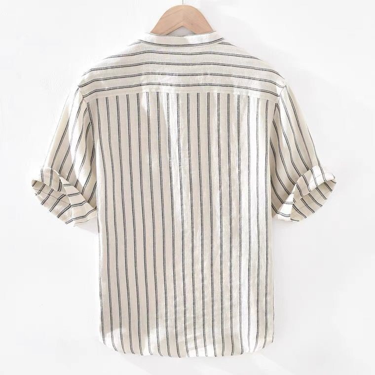 日系条纹亚麻短袖衬衫男潮夏季宽松薄款立领套头麻布半袖衬衣t恤