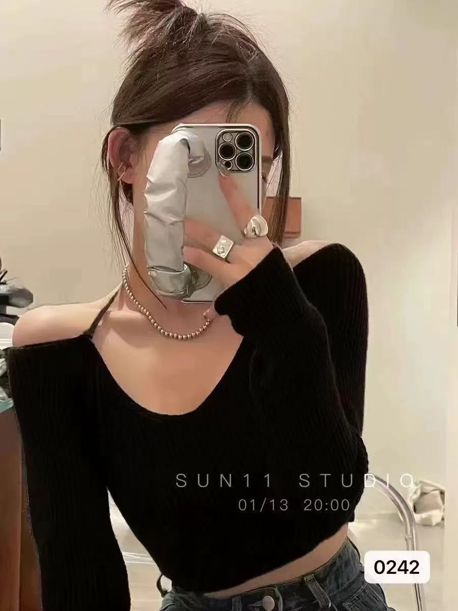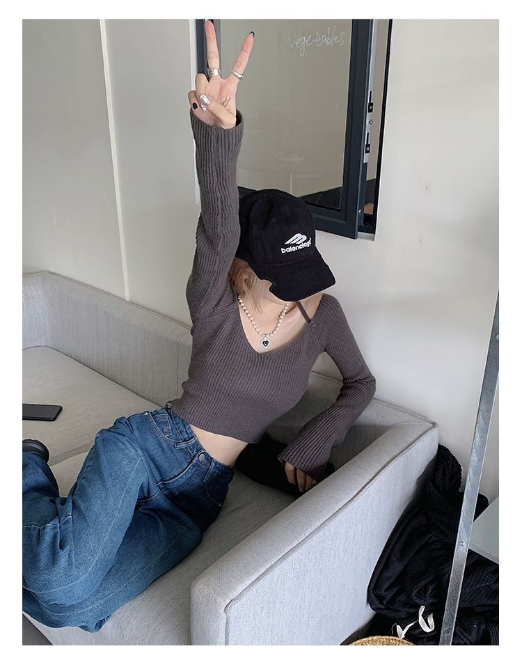 한국 스타일 이른 가을 짧은 탑 여자의 섹시한 뜨거운 소녀 내부베이스 셔츠 배꼽 하이 웨이스트 짧은 시크 니트 셔츠스토어 가기