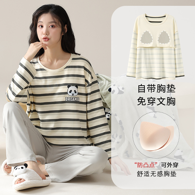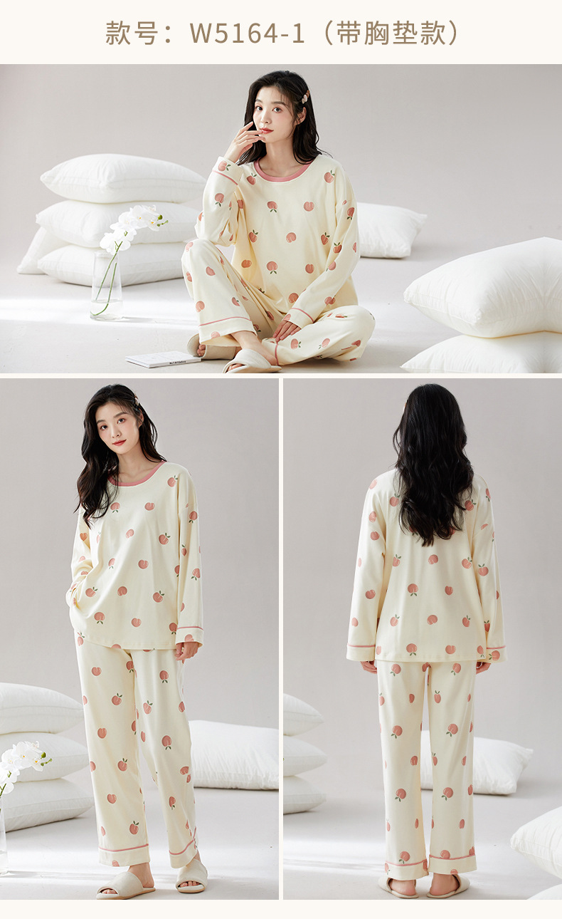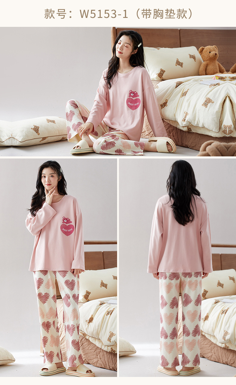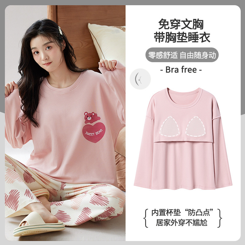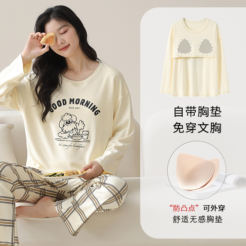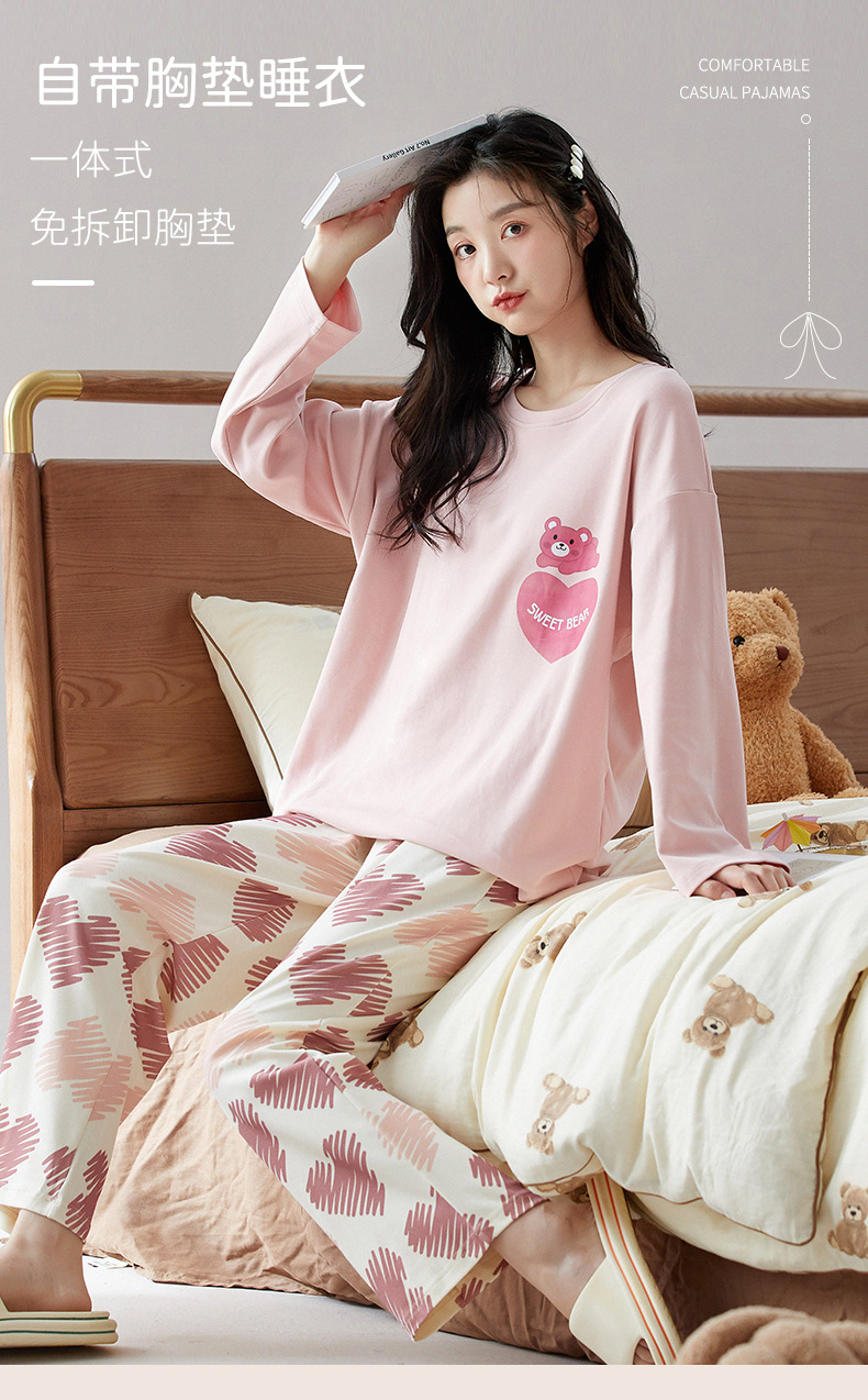 가슴 패드가 있는 도매 순면 긴팔 잠옷, 여성용 라운드 넥 슈트, 달콤하고 캐주얼하며 외부에서 착용 가능, 가을 겨울용 볼록 방지 가정복스토어 가기