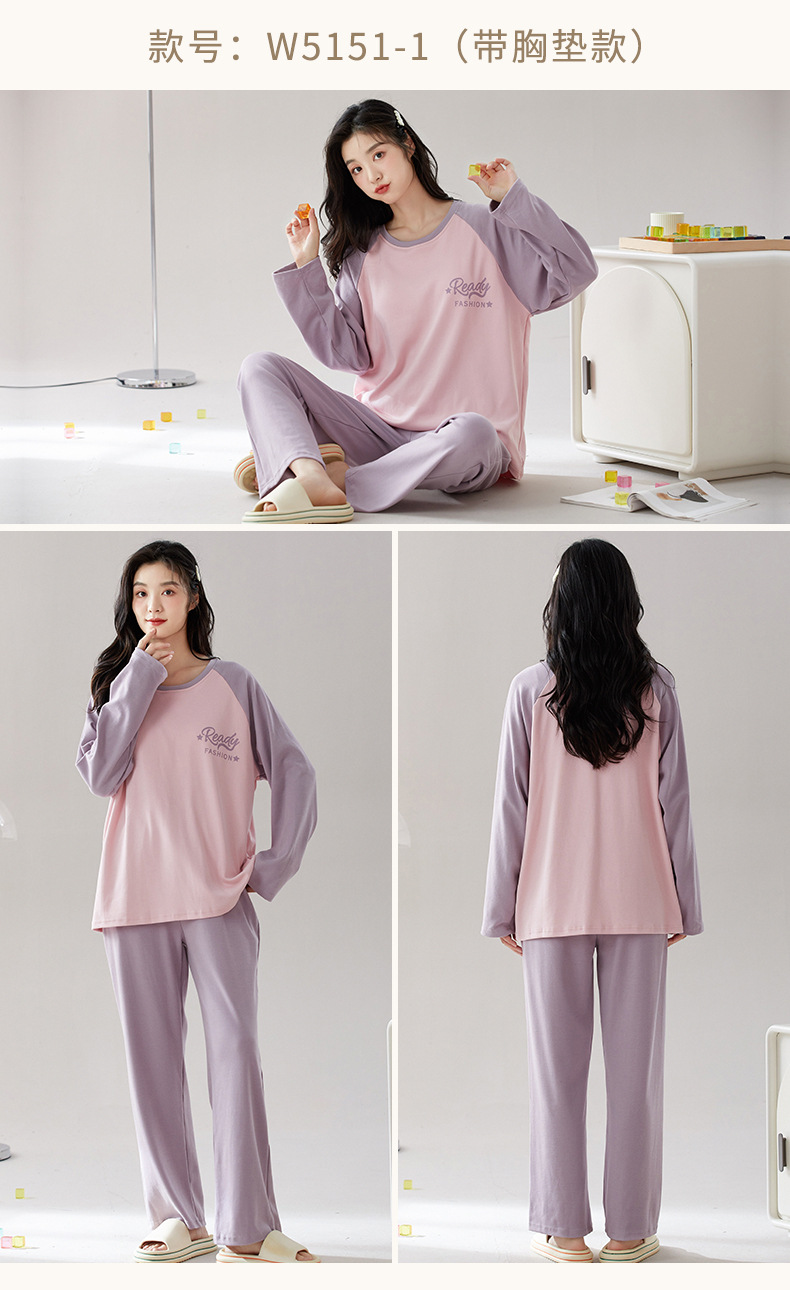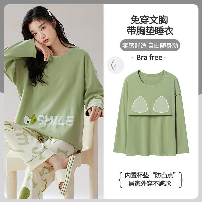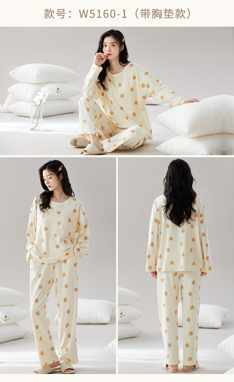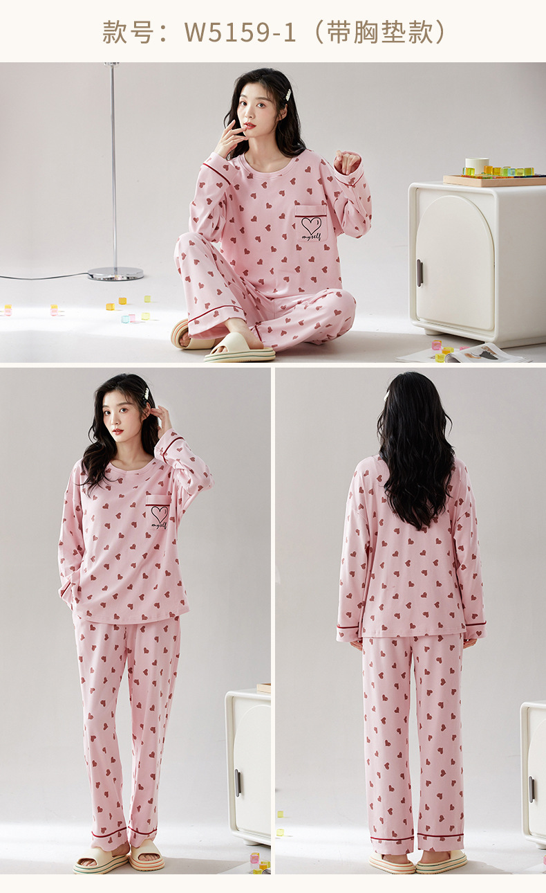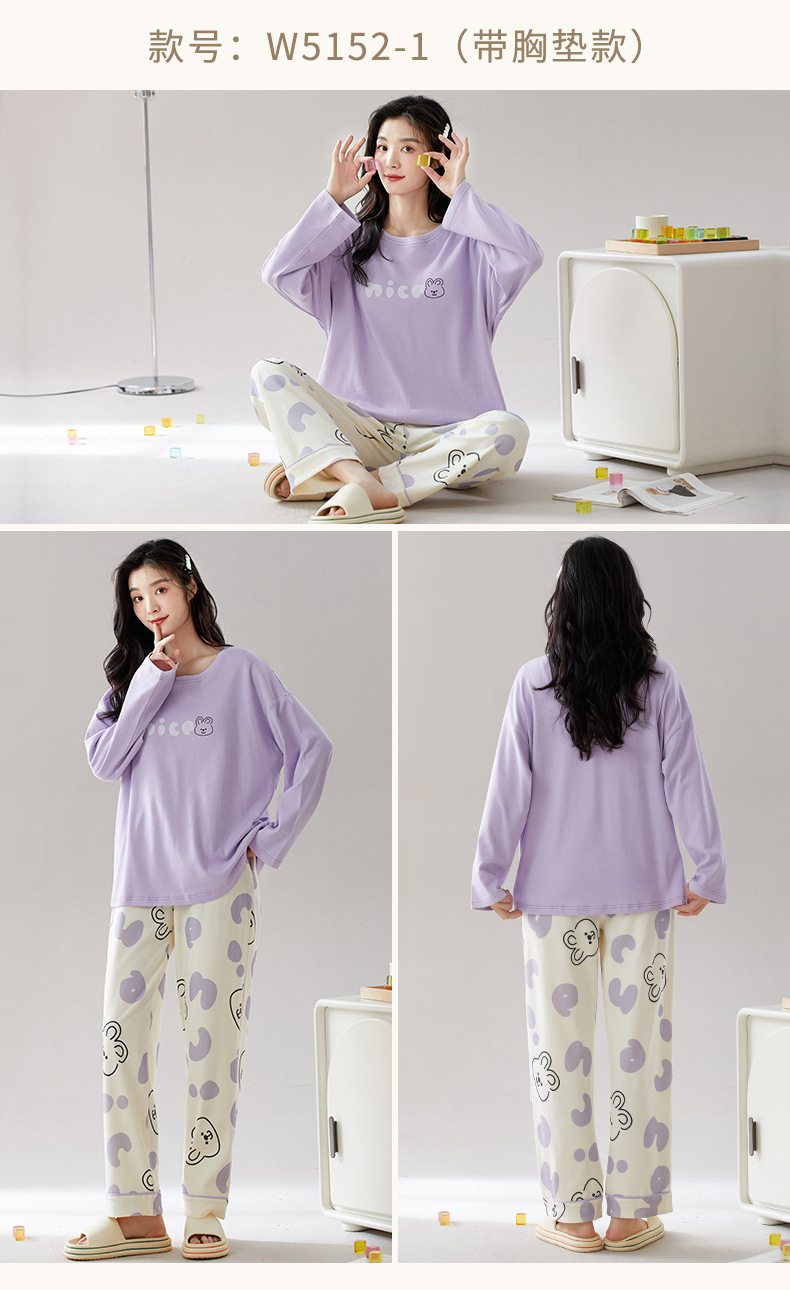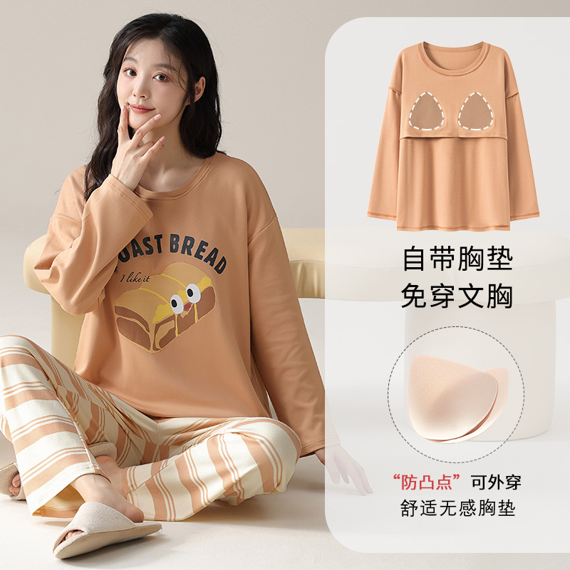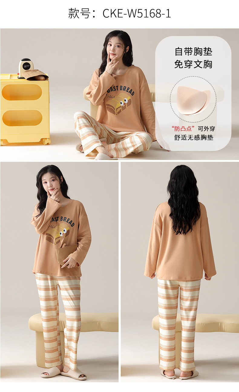 가슴 패드가 있는 도매 순면 긴팔 잠옷, 여성용 라운드 넥 슈트, 달콤하고 캐주얼하며 외부에서 착용 가능, 가을 겨울용 볼록 방지 가정복스토어 가기