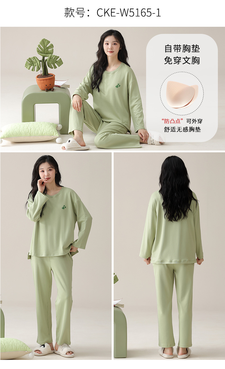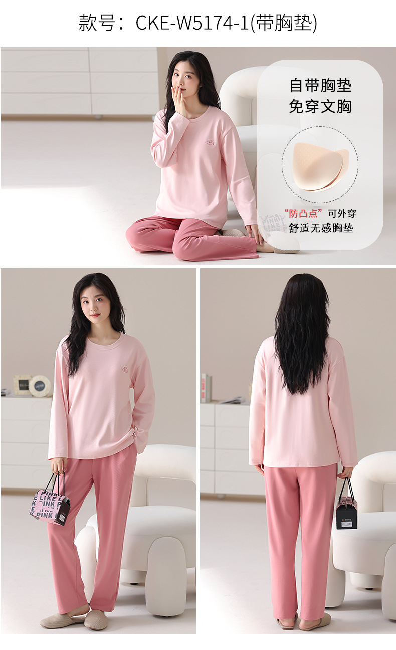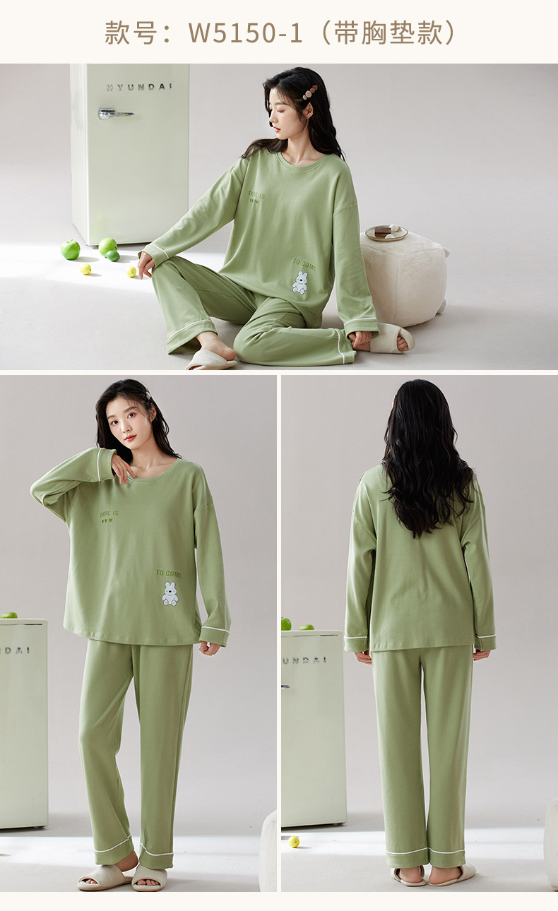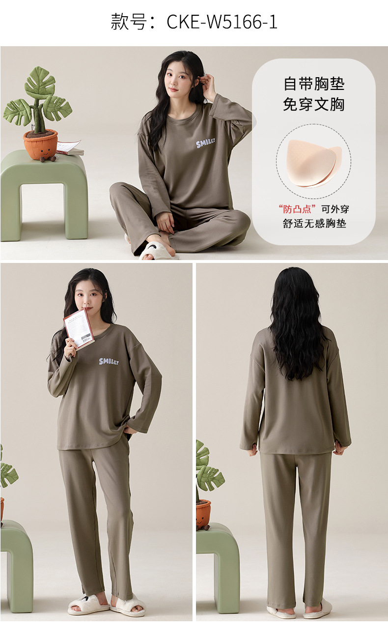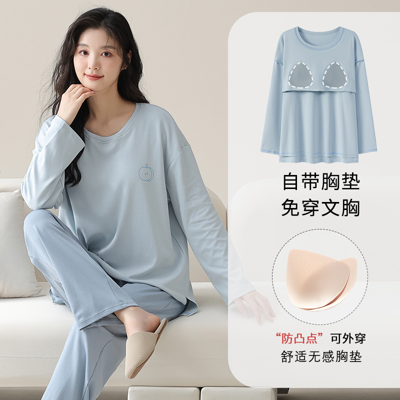 가슴 패드가 있는 도매 순면 긴팔 잠옷, 여성용 라운드 넥 슈트, 달콤하고 캐주얼하며 외부에서 착용 가능, 가을 겨울용 볼록 방지 가정복스토어 가기