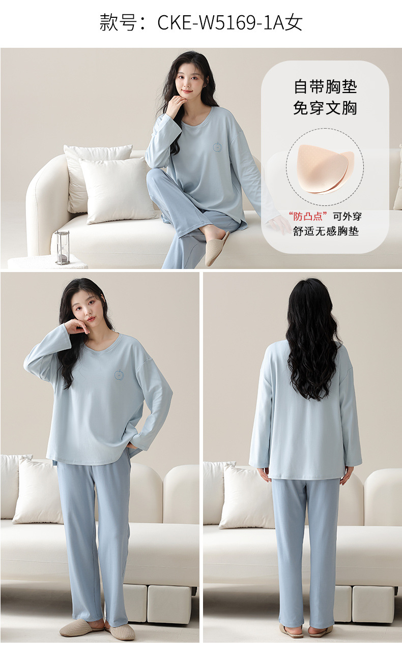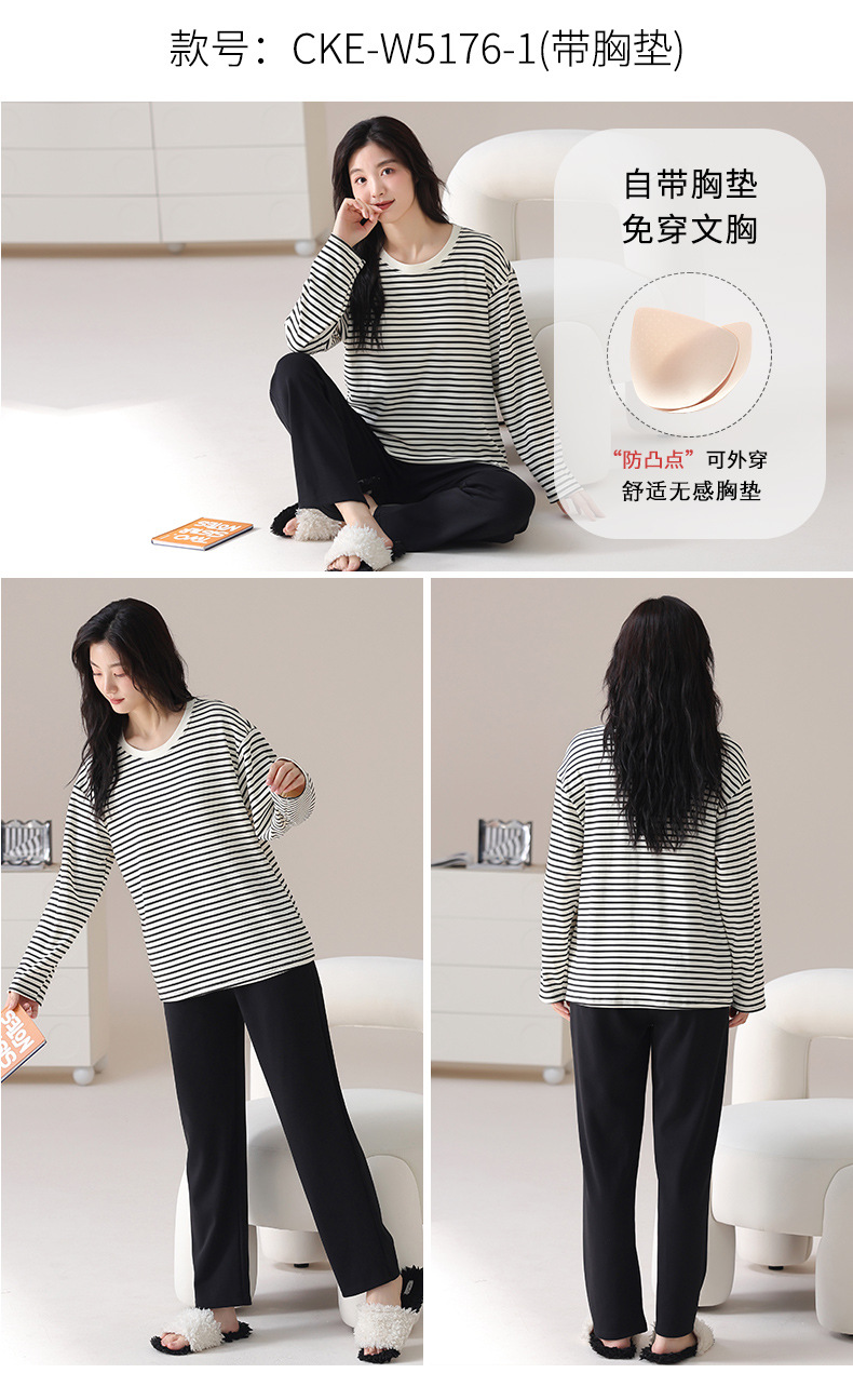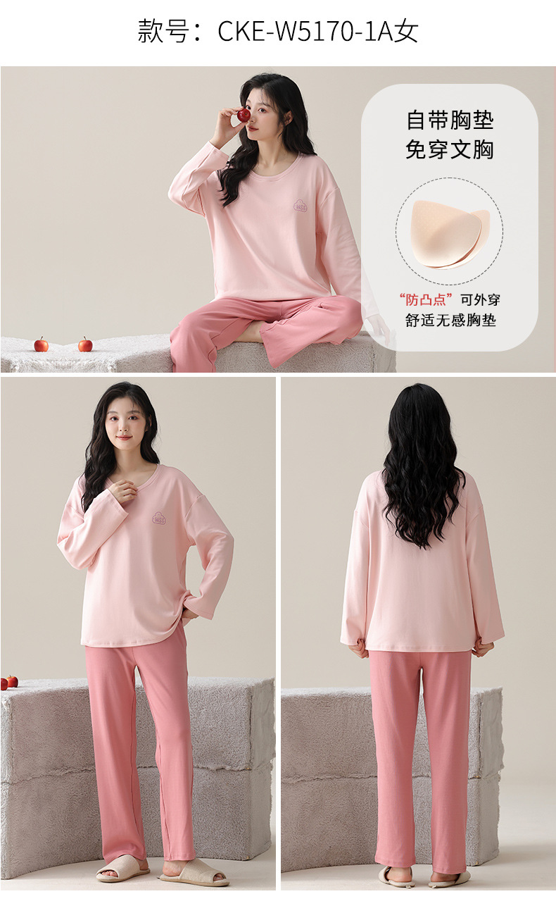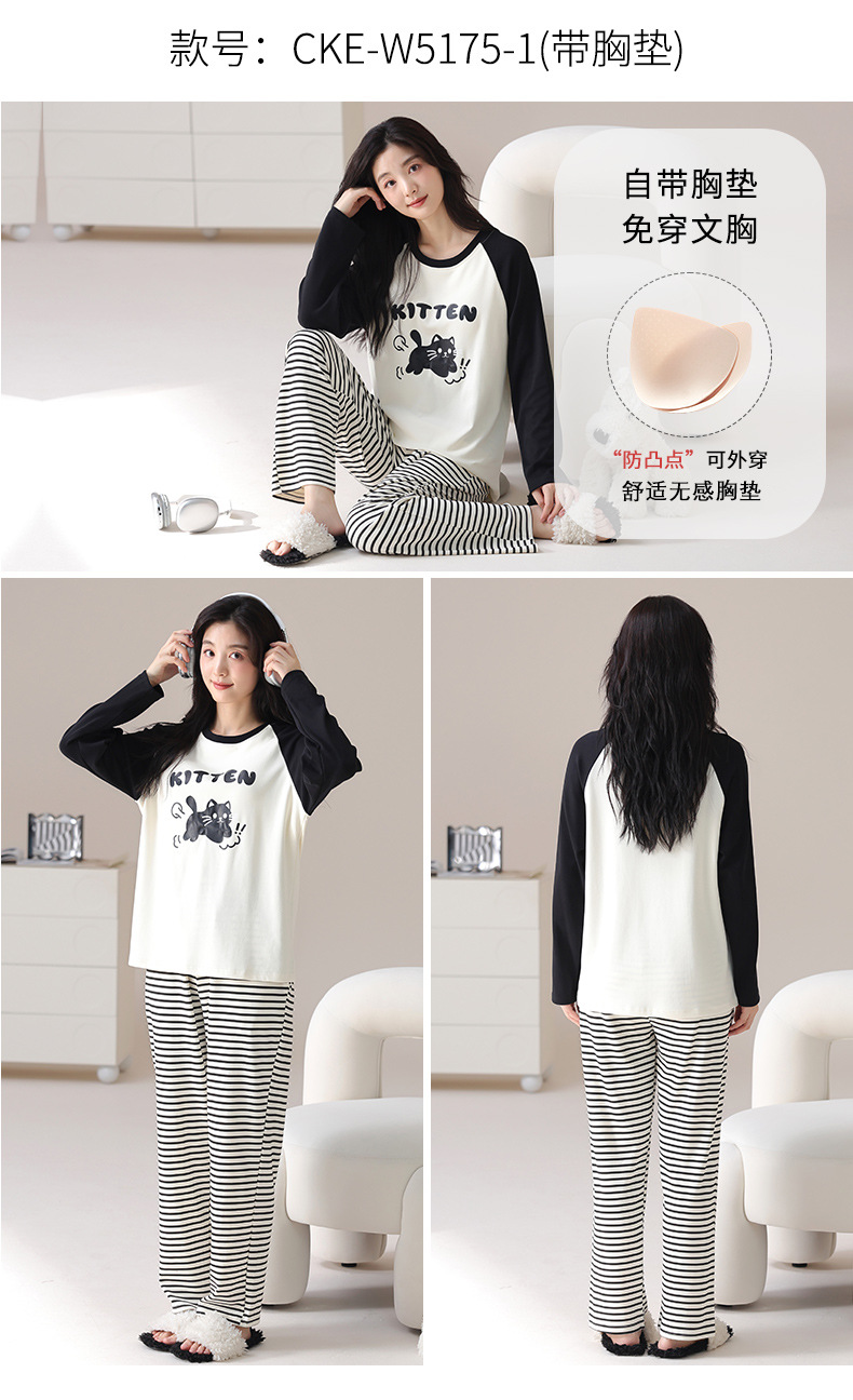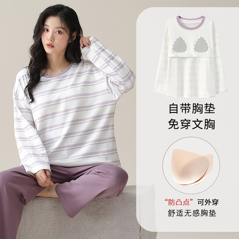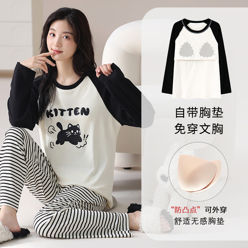 가슴 패드가 있는 도매 순면 긴팔 잠옷, 여성용 라운드 넥 슈트, 달콤하고 캐주얼하며 외부에서 착용 가능, 가을 겨울용 볼록 방지 가정복스토어 가기
