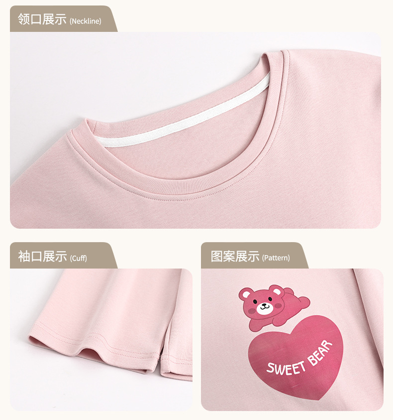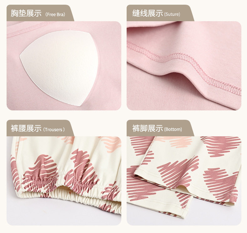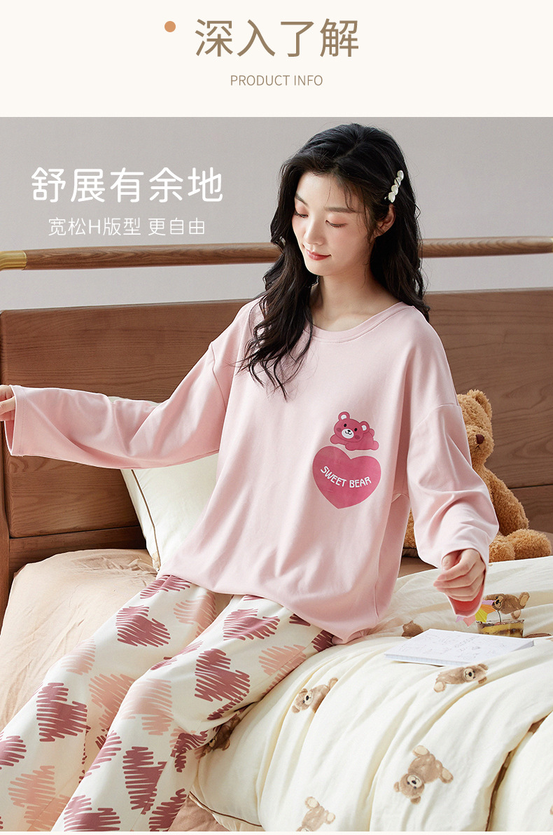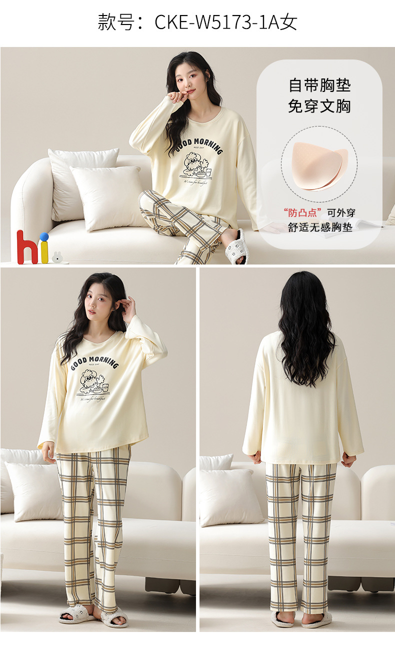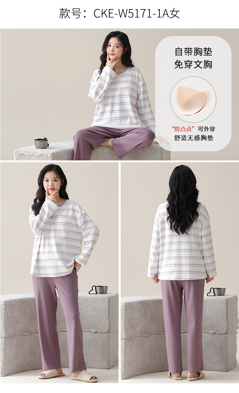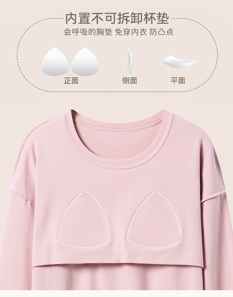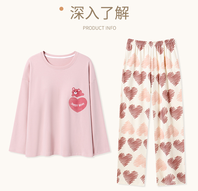 가슴 패드가 있는 도매 순면 긴팔 잠옷, 여성용 라운드 넥 슈트, 달콤하고 캐주얼하며 외부에서 착용 가능, 가을 겨울용 볼록 방지 가정복스토어 가기