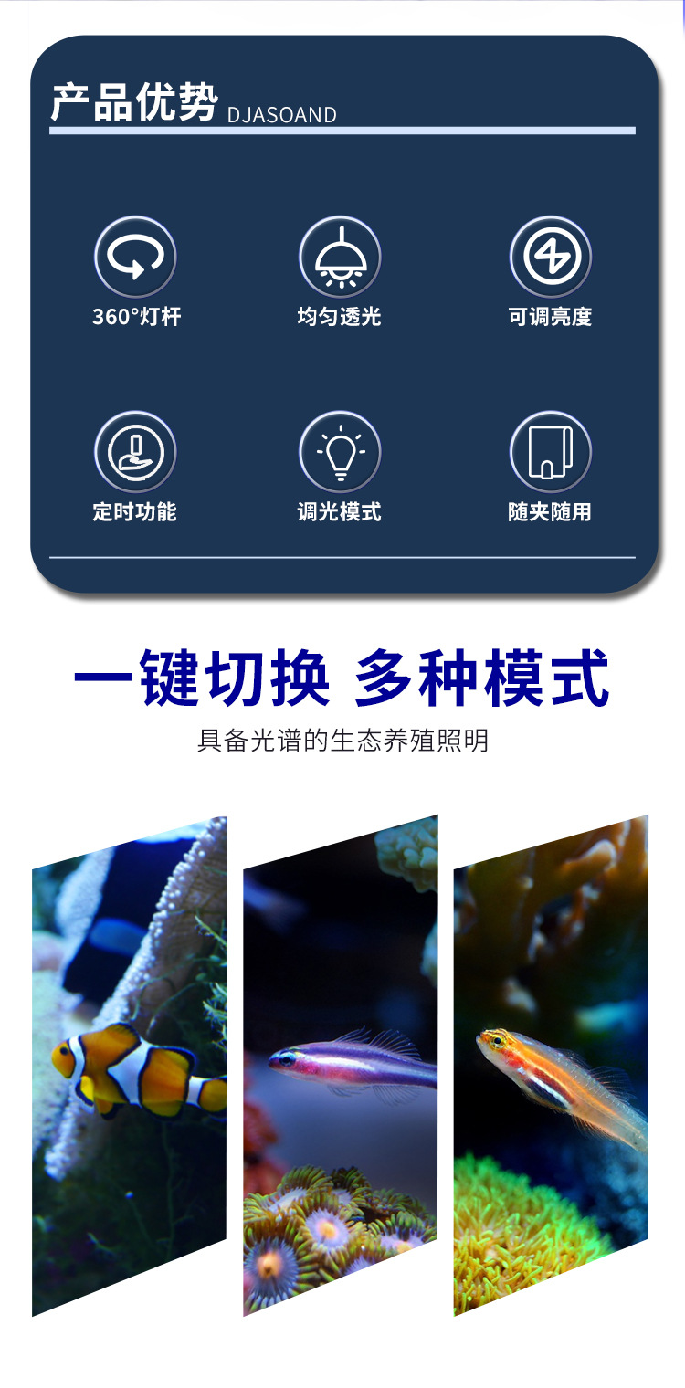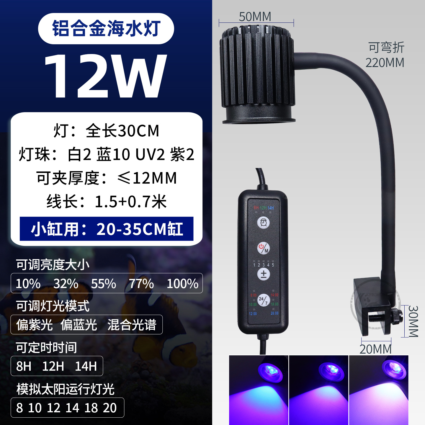 해수 어항 조명, 흰동가리 산호 조명, 디밍 및 타이머 기능, 블루 화이트 클립 조명, LED 해수 어항 조명, 블루 라이트 강화