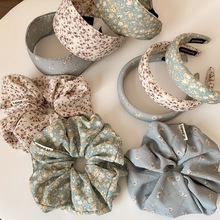 法式布艺花朵百搭大肠发圈高级感蓝色碎花发卡高颅顶压发头箍发饰