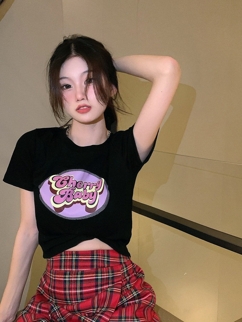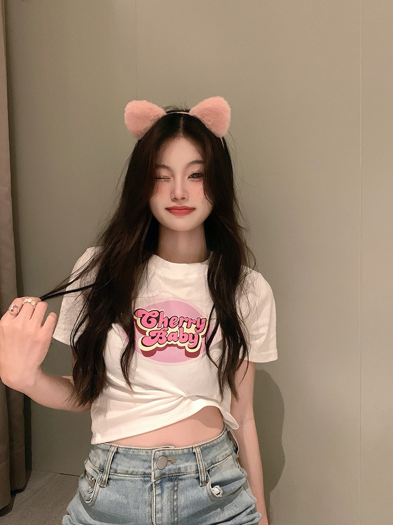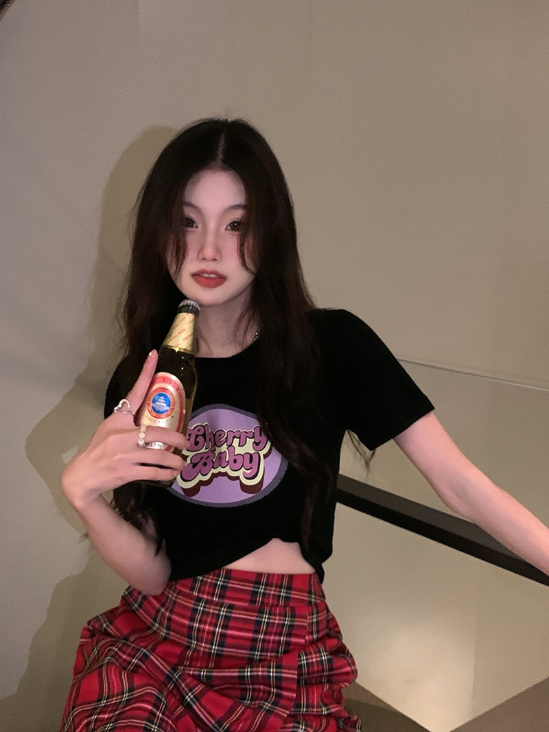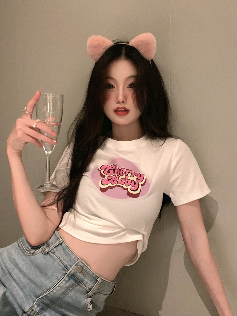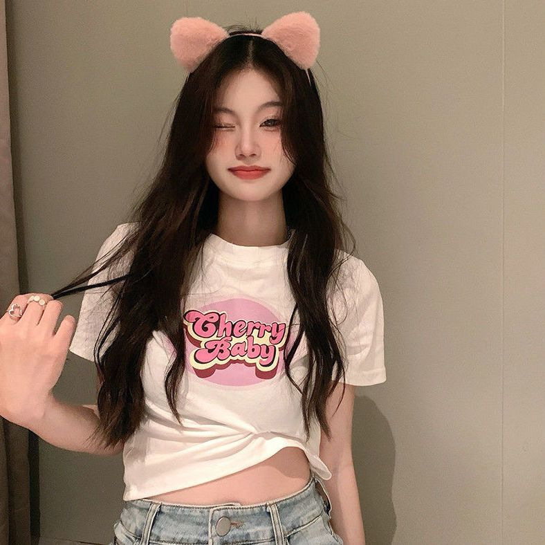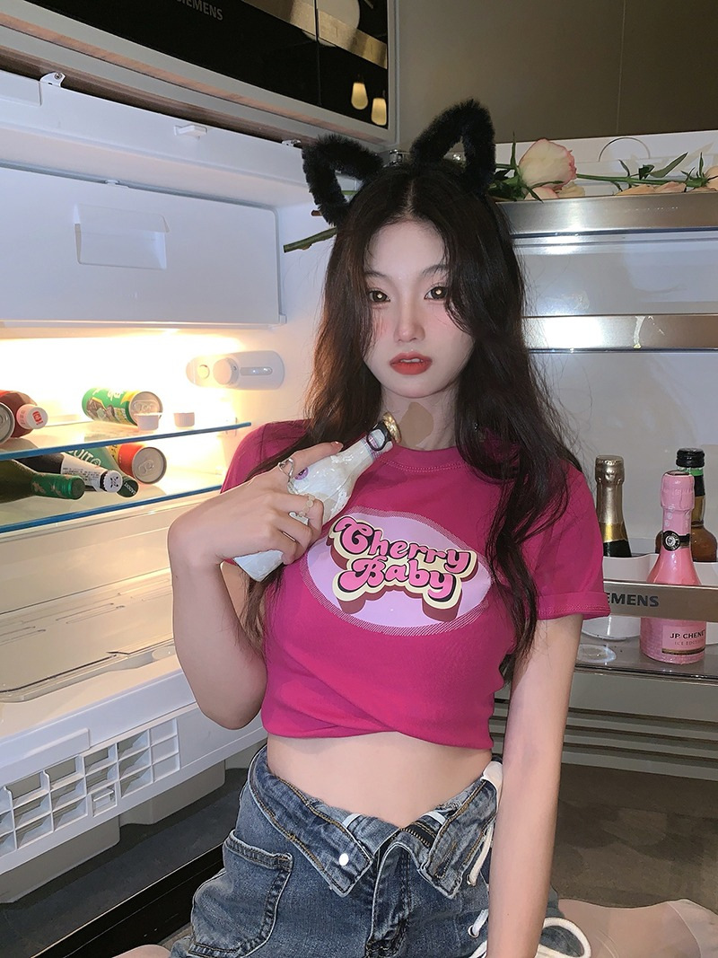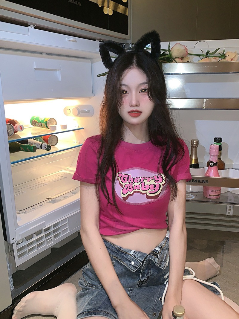 작은 짧은 티셔츠 여성용 로즈 레드 2022 새로운 순수 바람 짧은 소매 허리 슬림 핏 얇은 탑스토어 가기