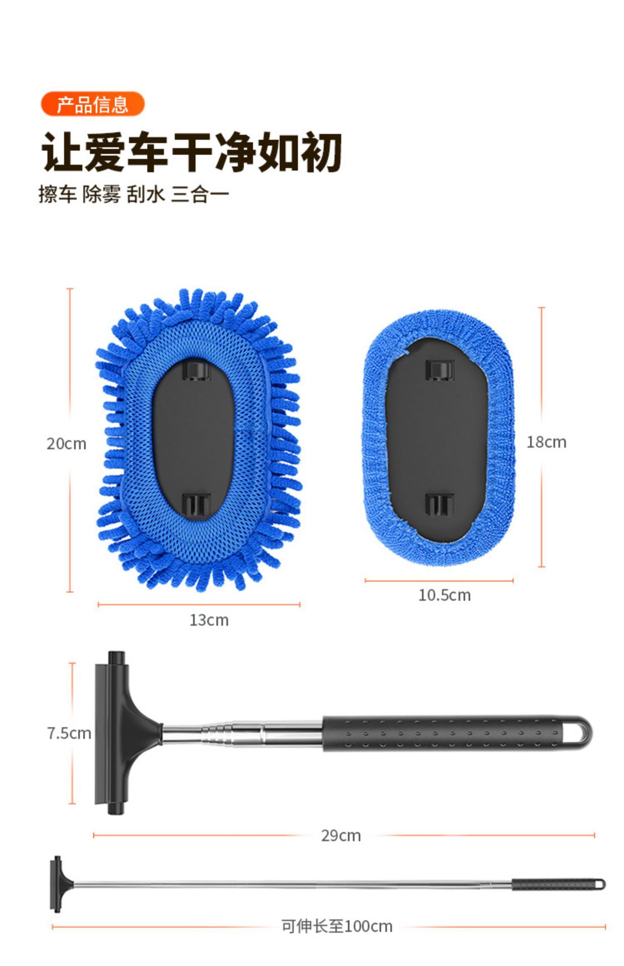 2、伸缩范围大,伸缩杆可伸长至101cm,车顶和另一侧后视镜都可以轻松擦洗。