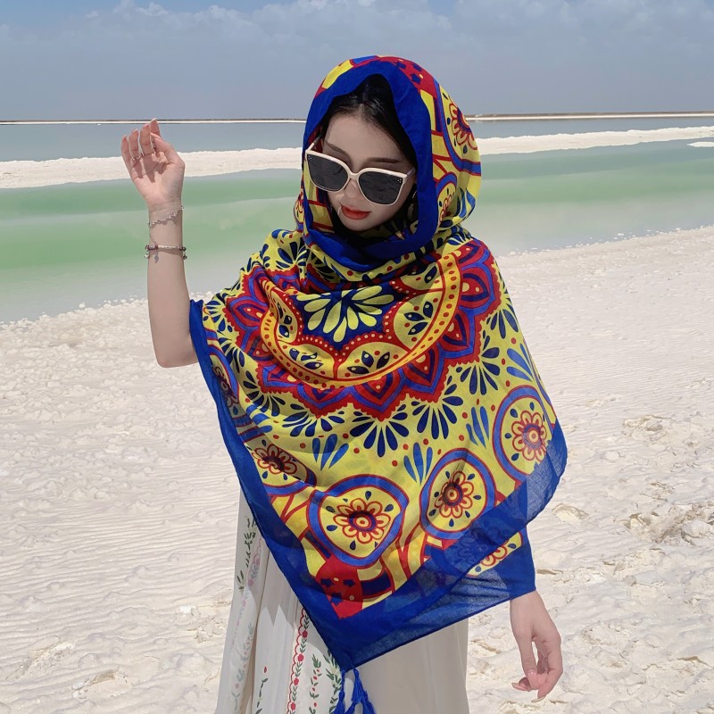 에스닉 스타일 파란색과 노란색 기하학적 스티치 인쇄 면화와 린넨 핸드 스카프 실크 스카프와 얇은 여행 선 스크린 비치 타월스토어 가기
