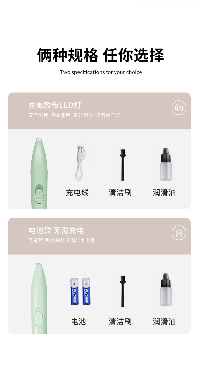 产品配件:包装盒、说明书、一根USB充电线(充电款)、2节7号干电池(电池款),一瓶润滑油(出口 不要请留言)、一只清洁刷