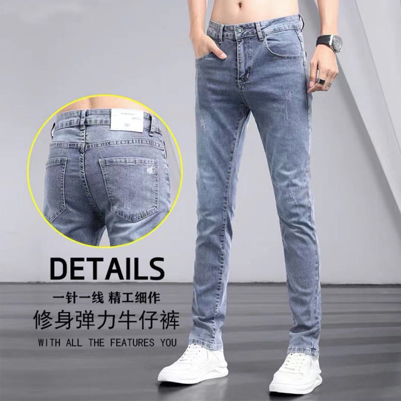 여름 찢어진 청바지 남성 한국 스타일 슬림핏 크롭 스키니 팬츠 트렌디 브랜드 라이트 컬러 봄과 가을 남성 바지스토어 가기