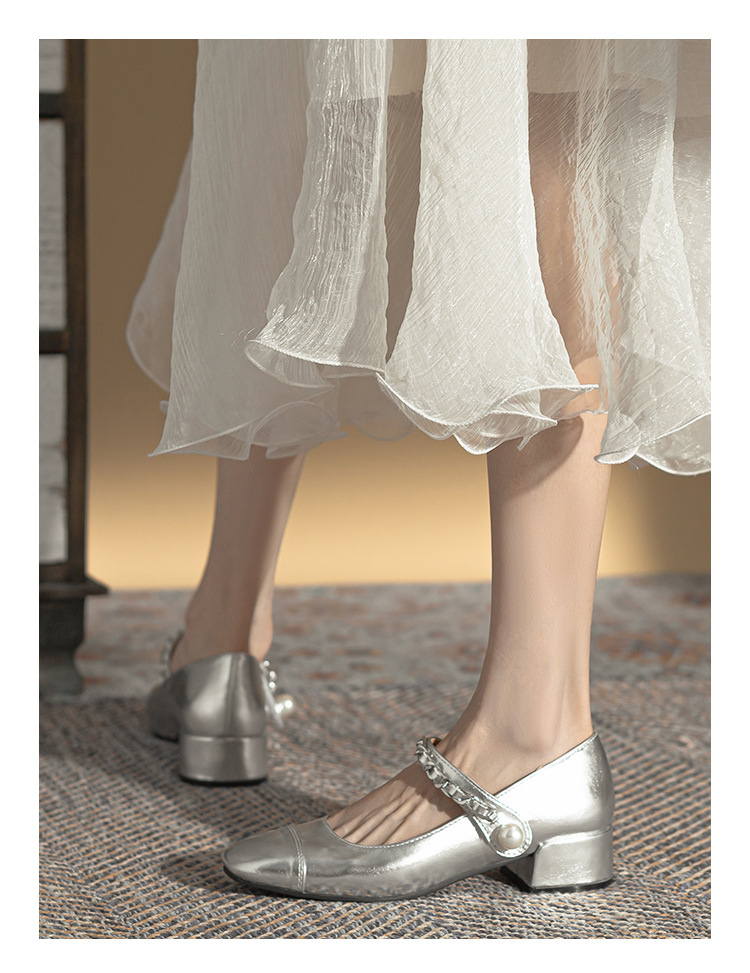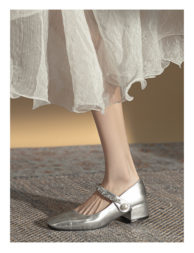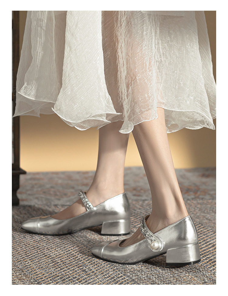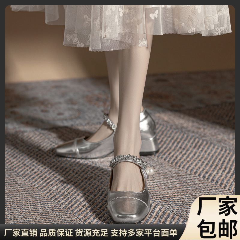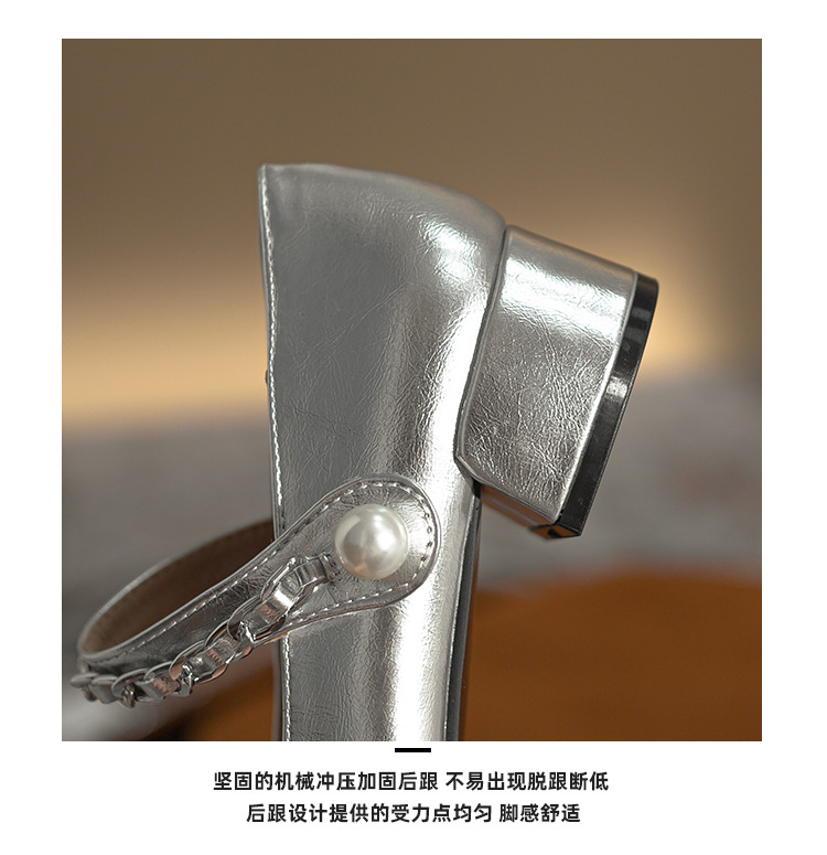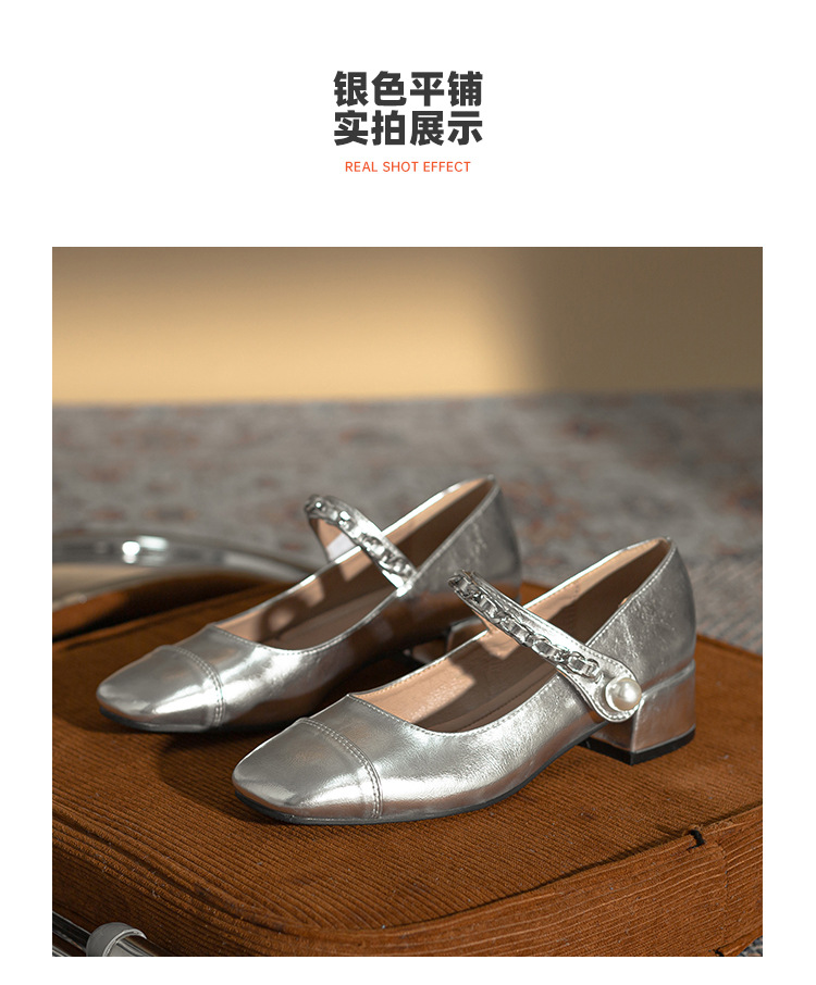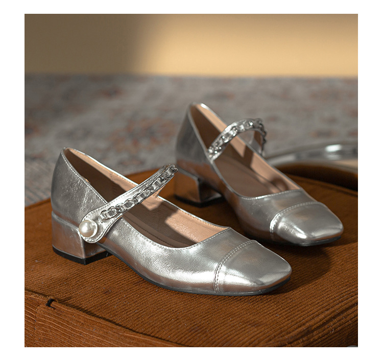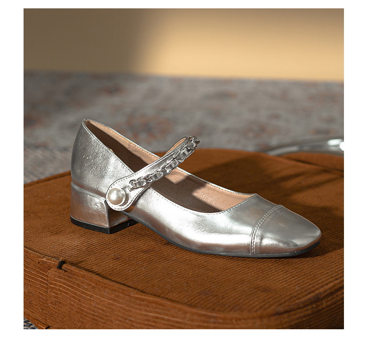 실버 두꺼운 굽 프렌치 스타일 라운드 토 메리제인 2024 가을 여성용 슈즈, 다용도 얕은 굽 싱글 슈즈, 레트로 가죽 슈즈스토어 가기