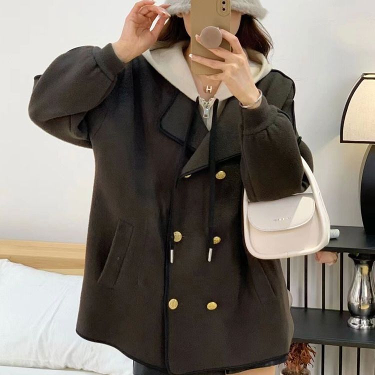 가짜 투피스 후드 울 같은 코트 여성용 2023 가을 새로운 니트 스티칭 디자인 감각 모조 양면 모직 코트스토어 가기