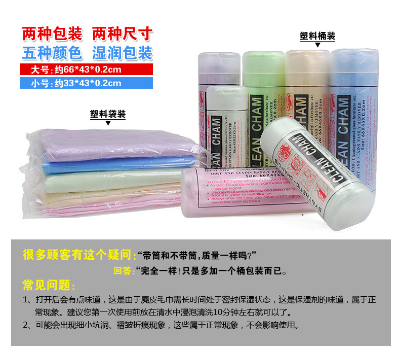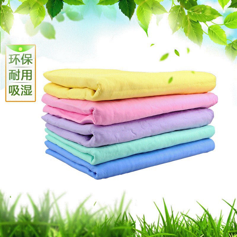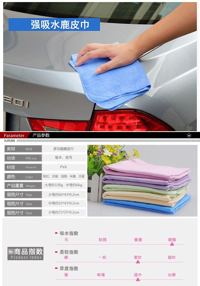 鹿皮巾解释:人体用仿鹿皮巾(Chamois Towel or Sport Towel)采用了PVA特殊防霉处理,质地柔软不掉棉絮,具有微细结构,利用毛细现象将物体表面的水迅速吸干,因而具有强大的吸水力,洗完头轻擦几下即可将头发擦干九成。成为科技时代新生活的日用必需品。本产品韧度强,能抗拉、抗撕裂;吸水性强;触感,柔软细腻,经久耐用;环保PVA材料制造,干燥时呈硬块状,以阻止病菌入侵和繁殖。