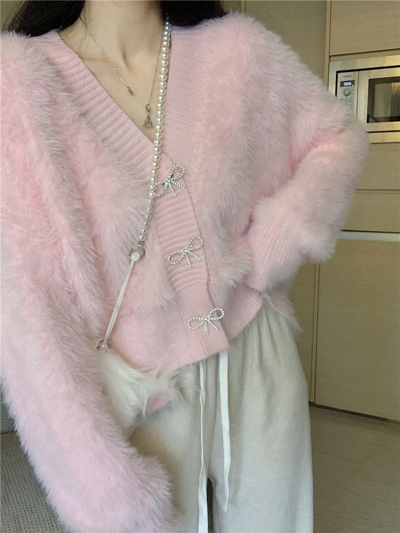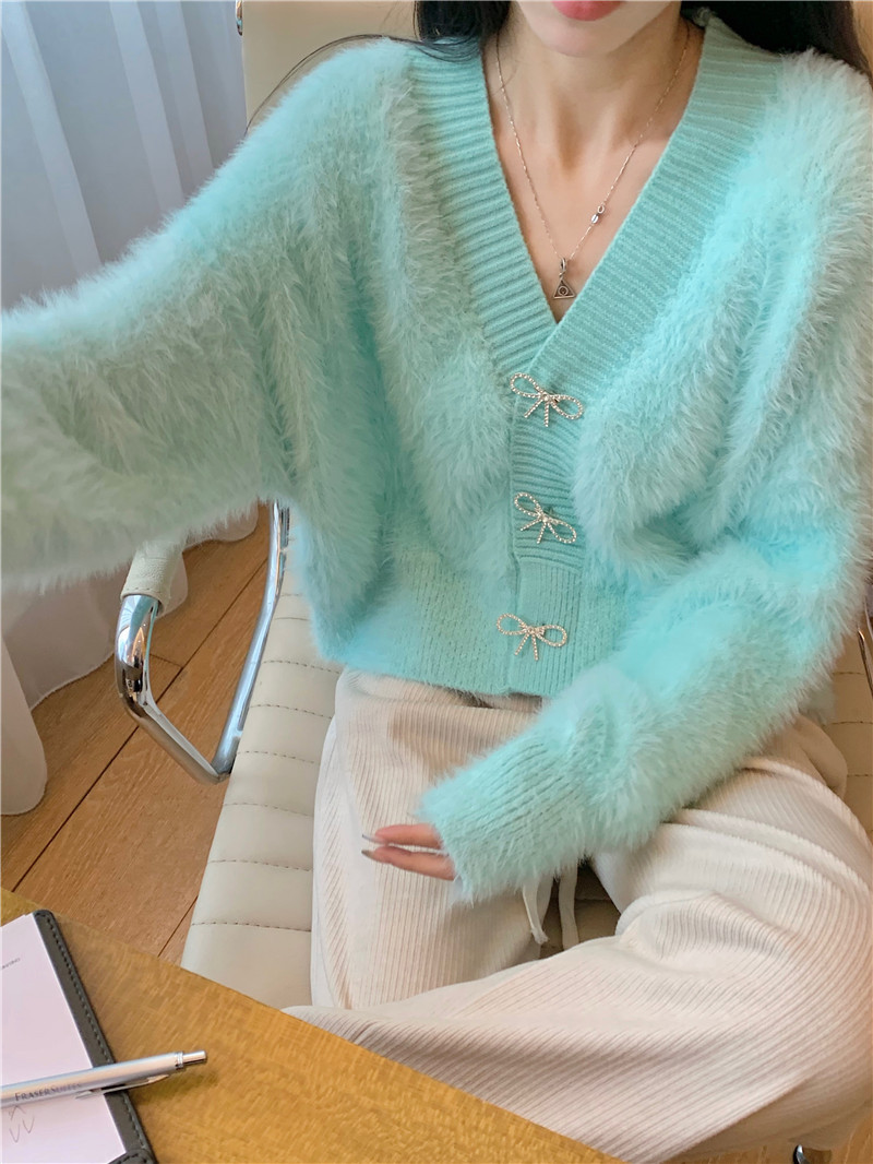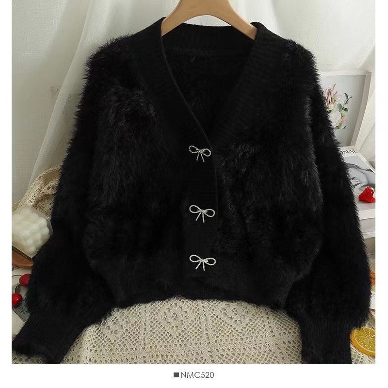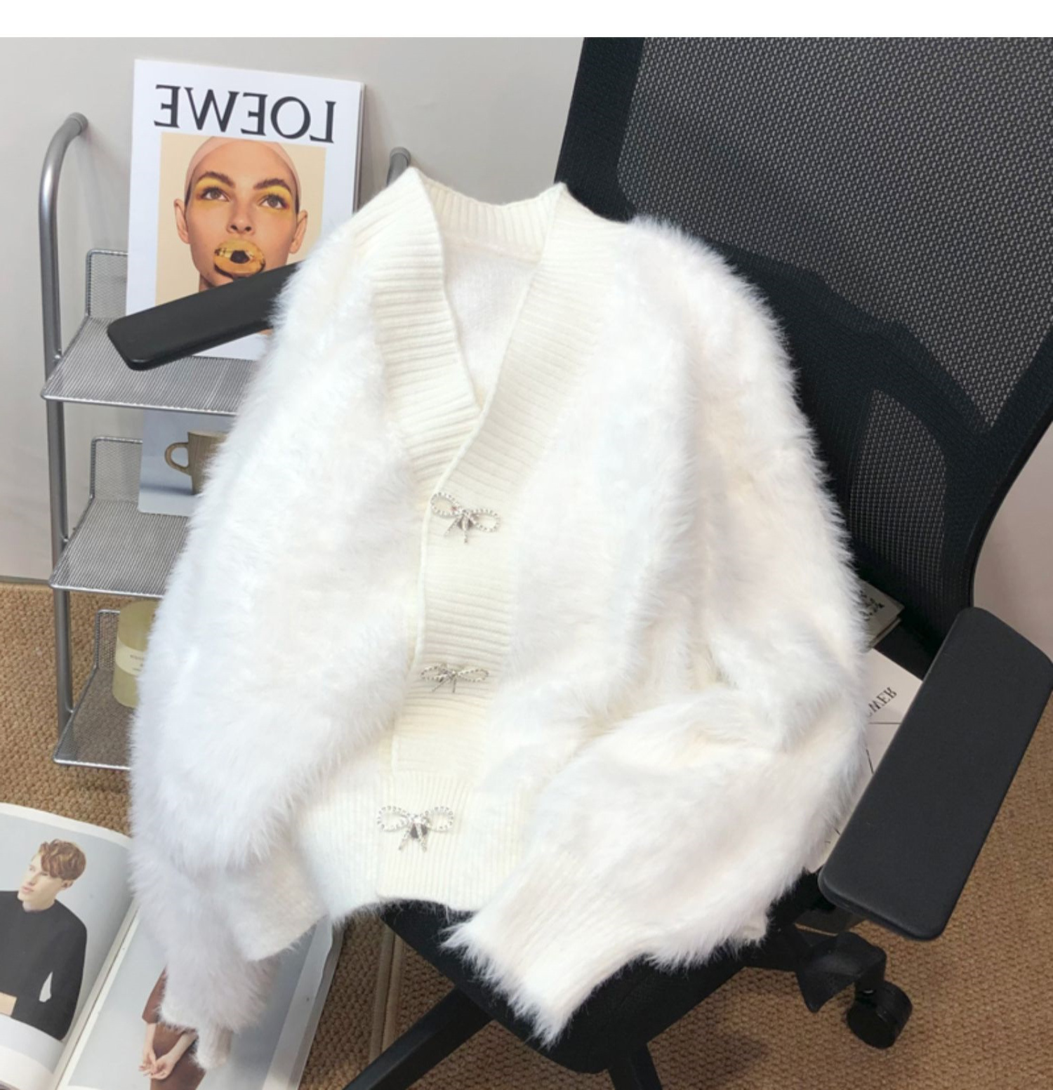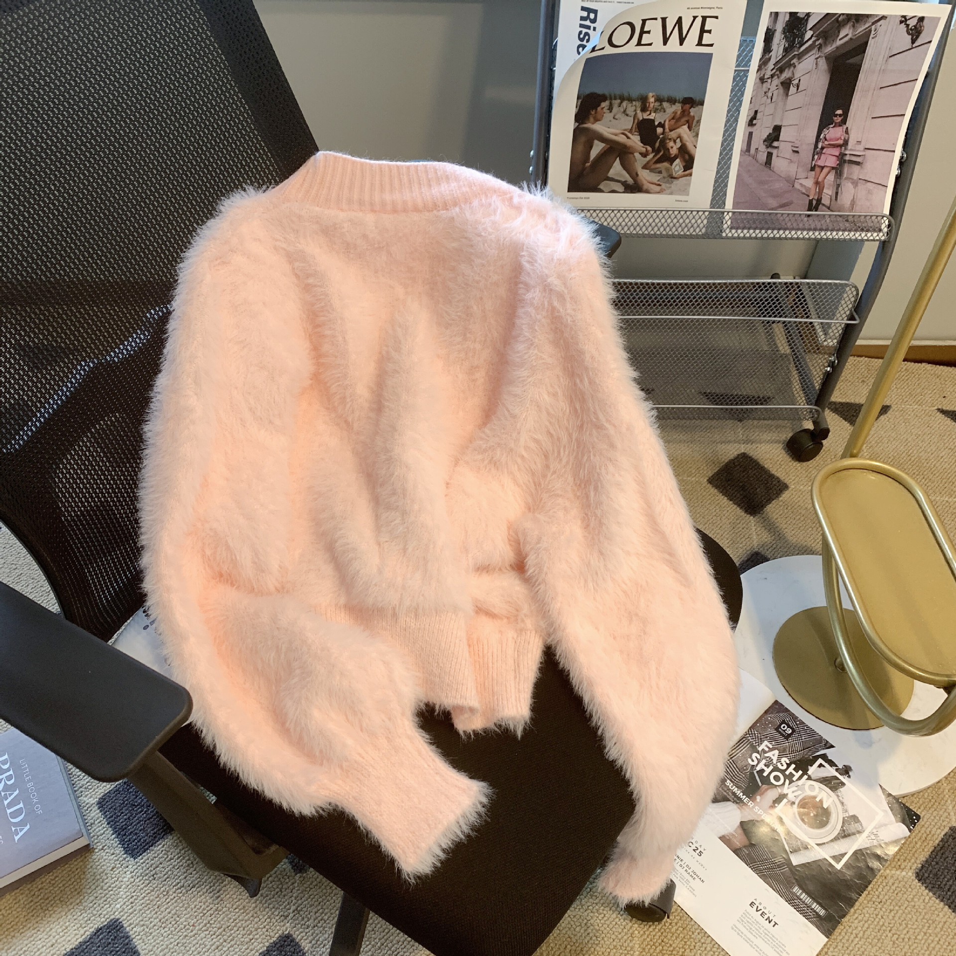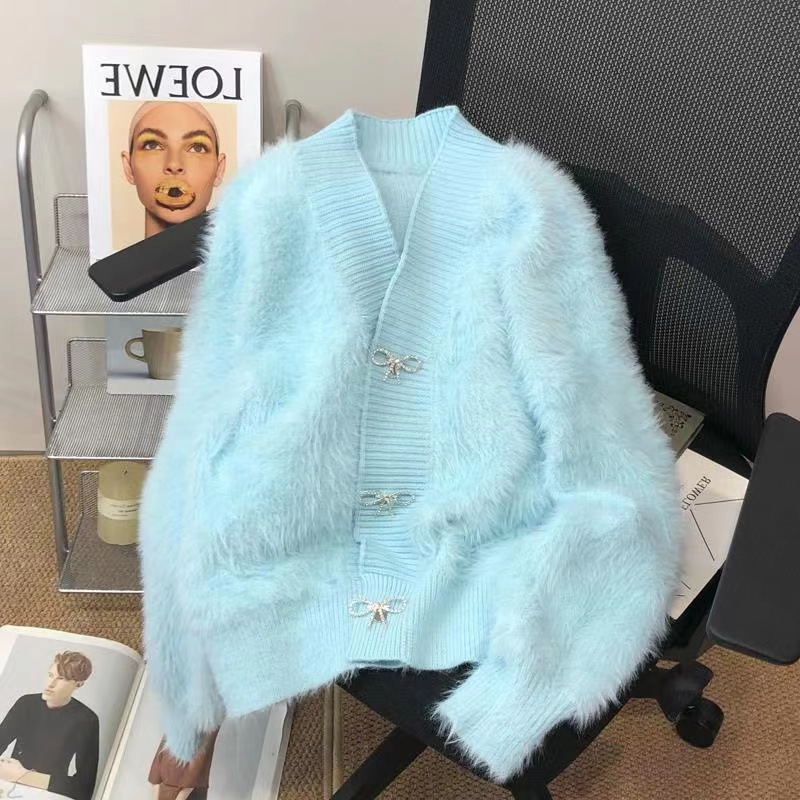 단색 모조 밍크 스웨터 재킷 2025 가을 스타일 배색 루즈핏 브이넥 독특한 디자인 니트 가디건스토어 가기