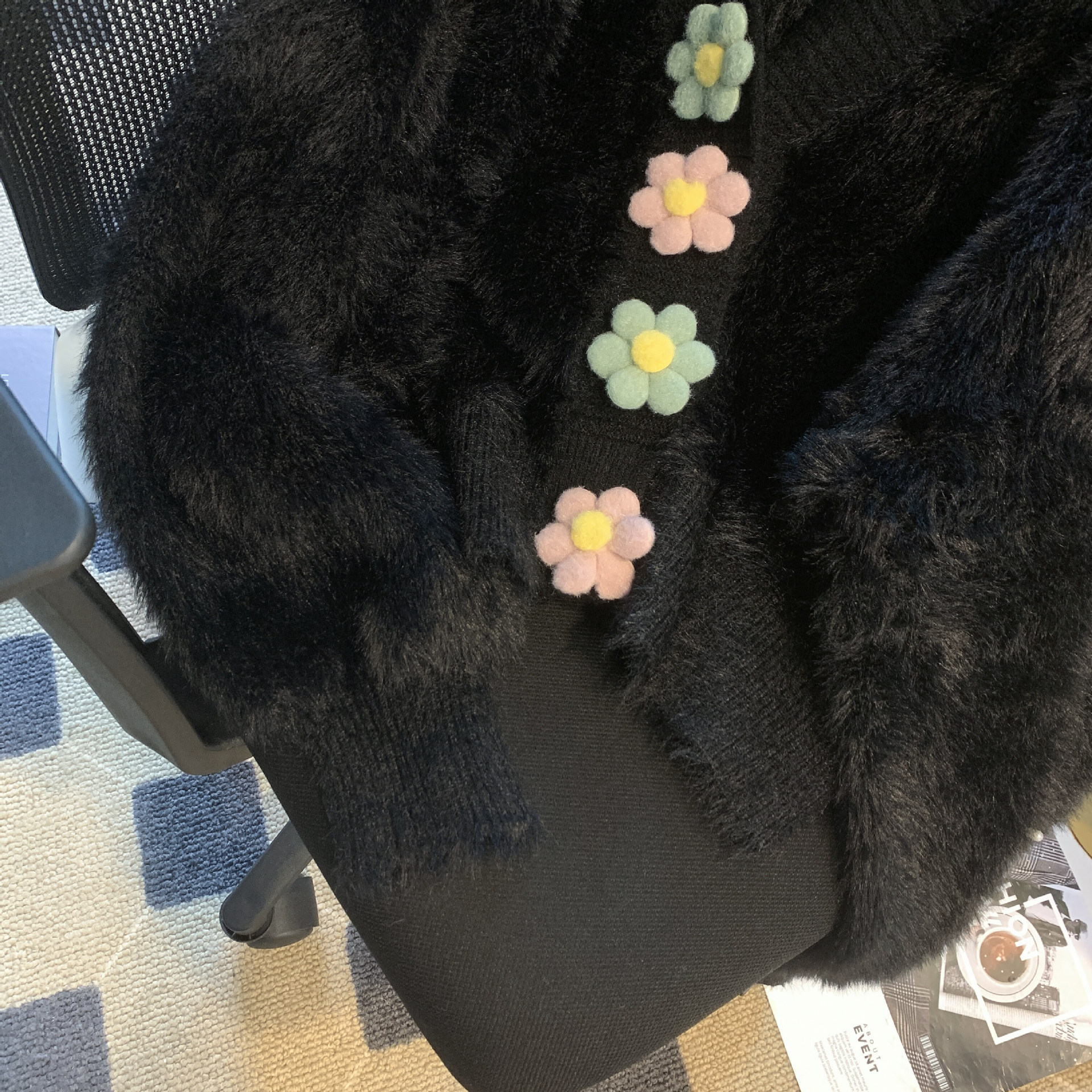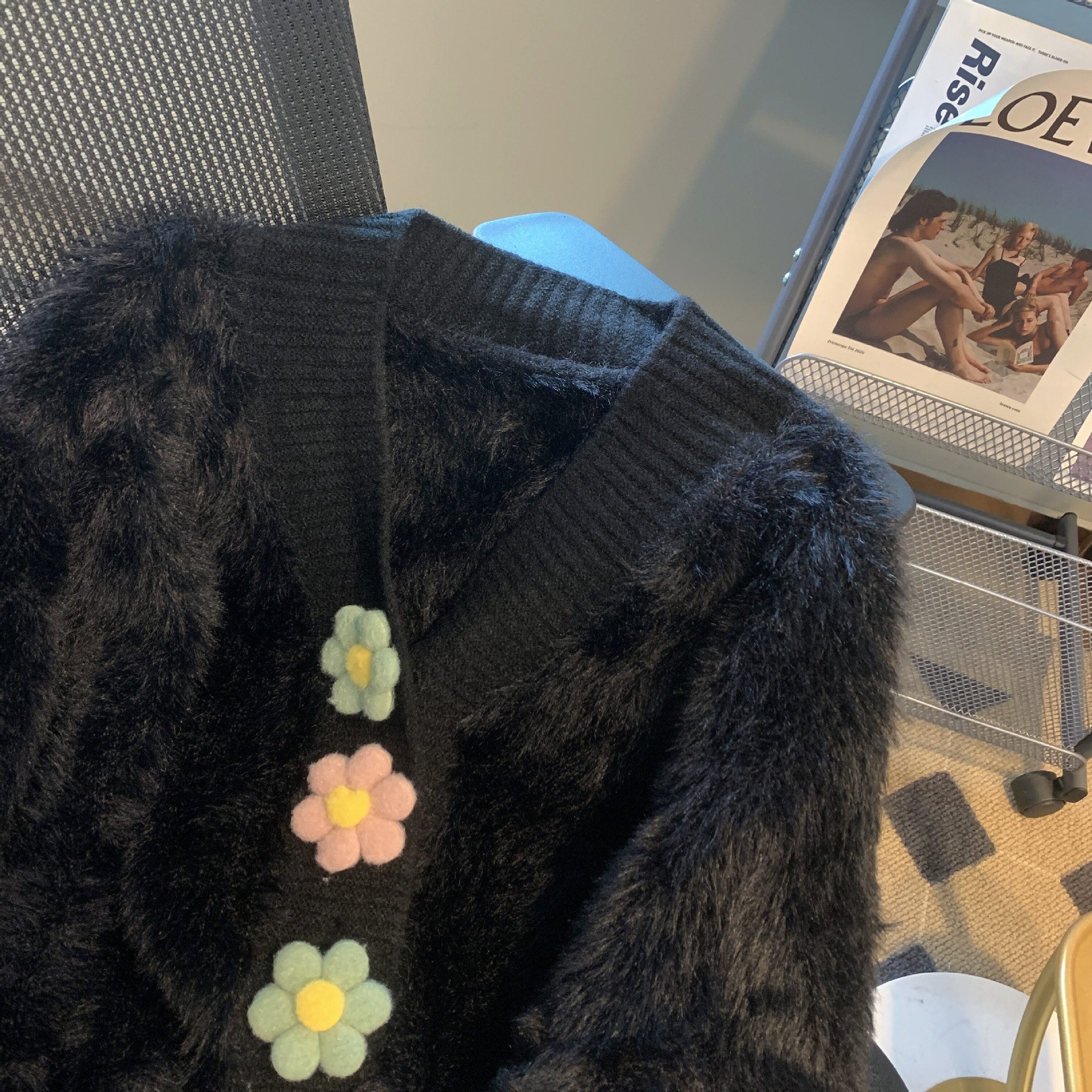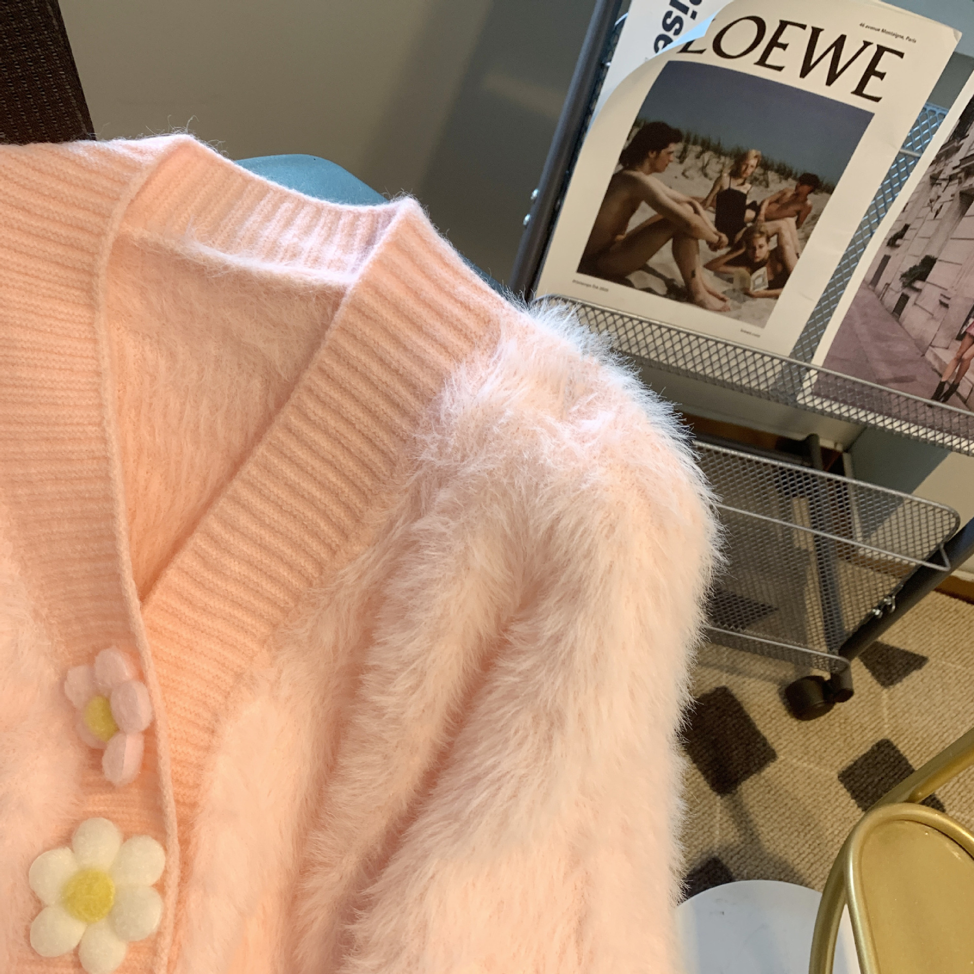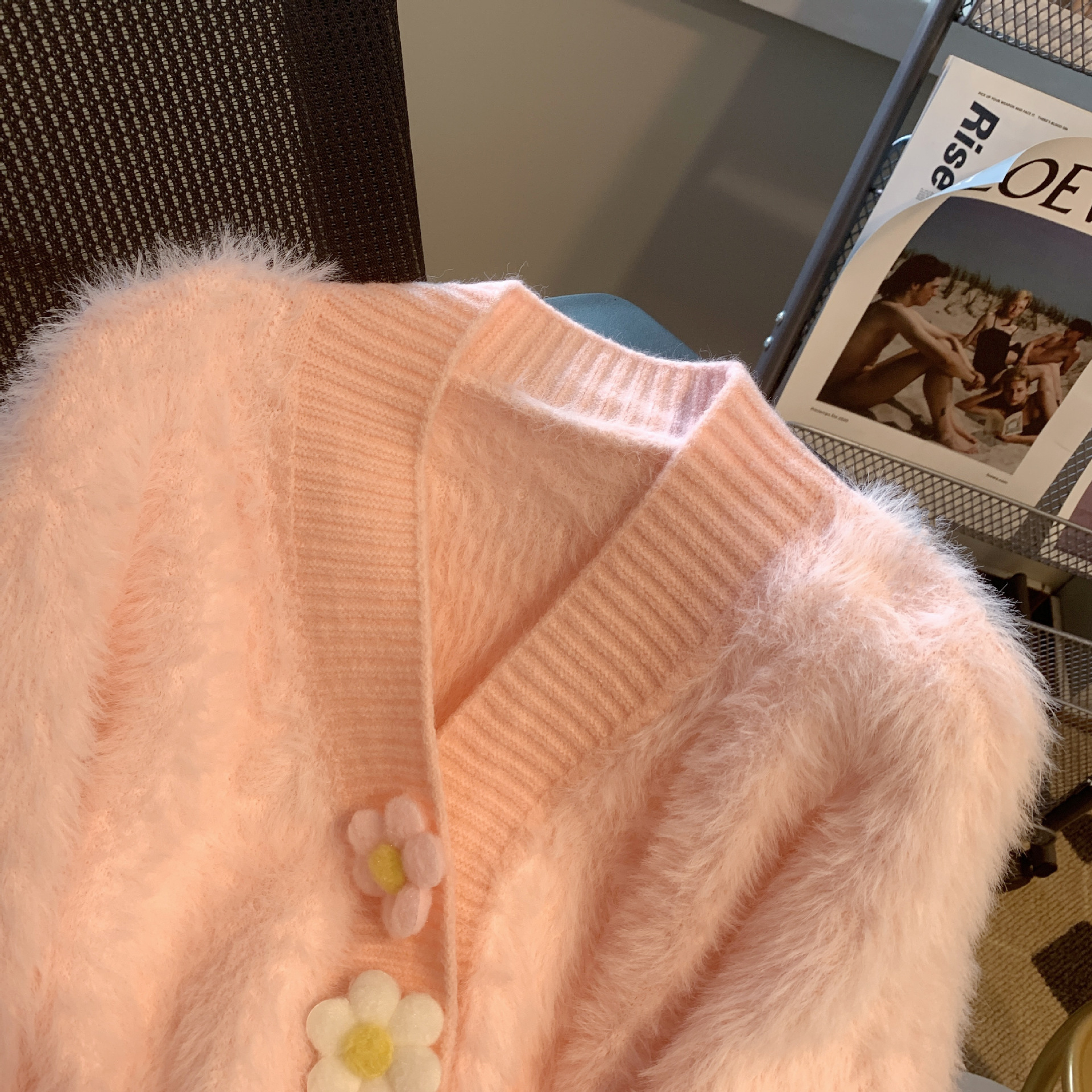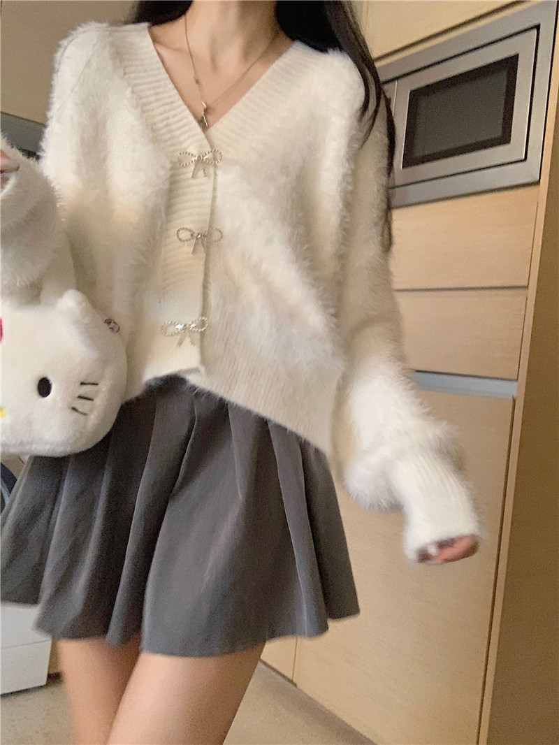 단색 모조 밍크 스웨터 재킷 2025 가을 스타일 배색 루즈핏 브이넥 독특한 디자인 니트 가디건스토어 가기