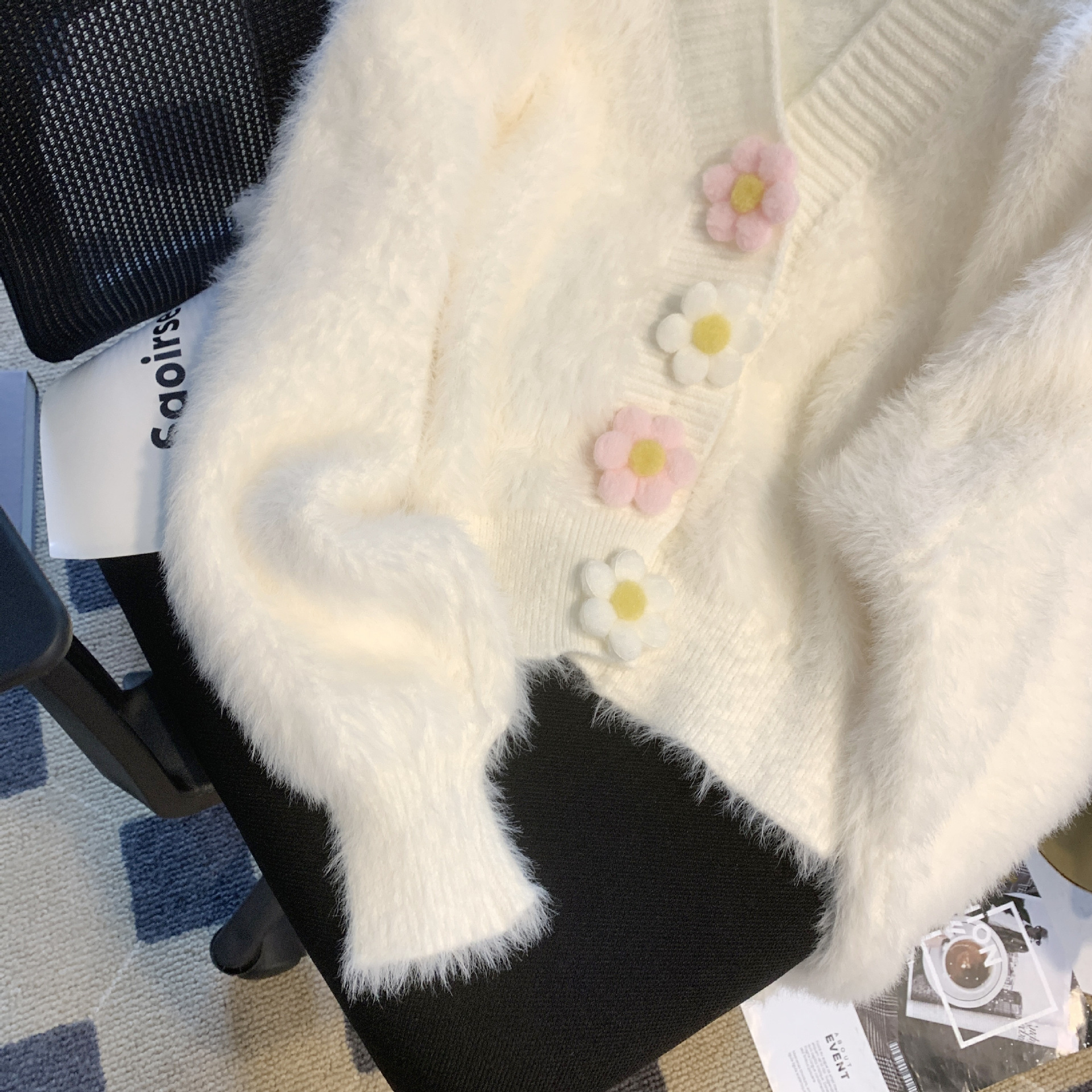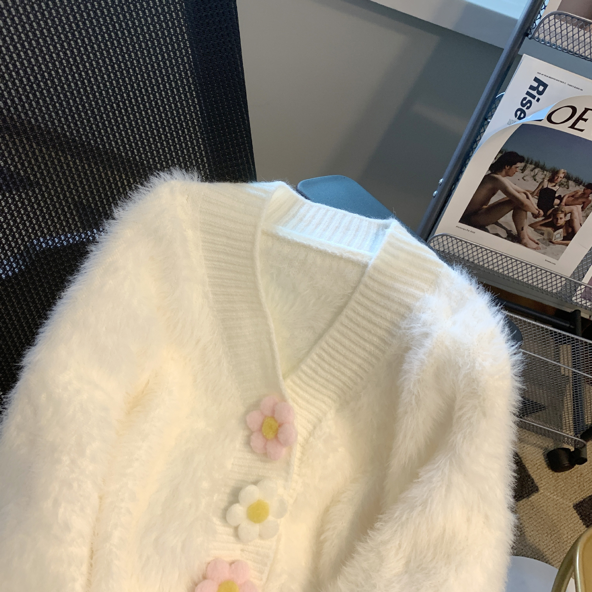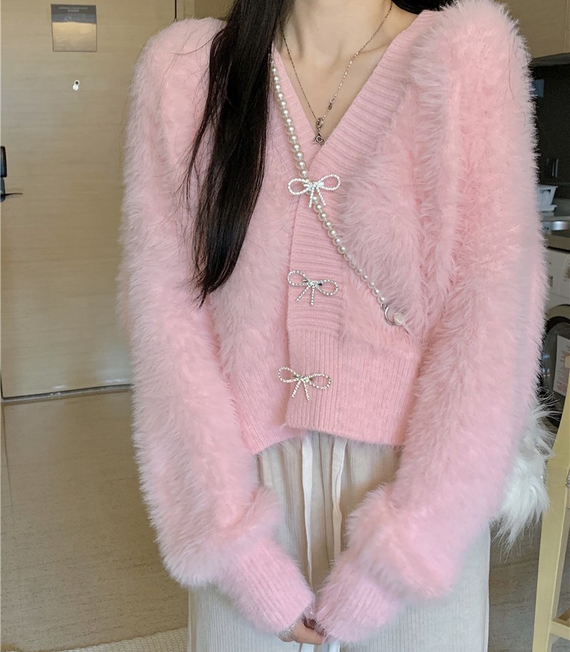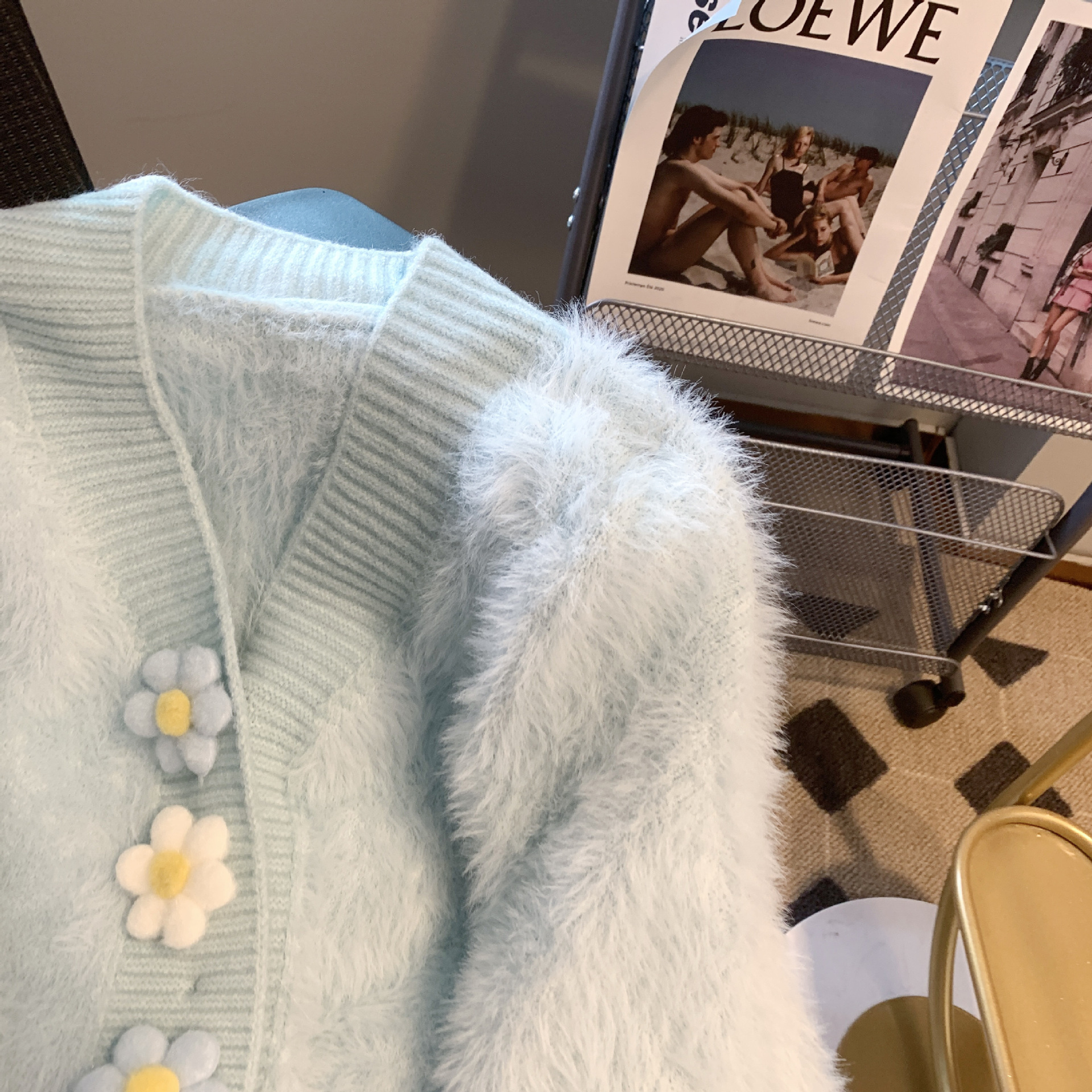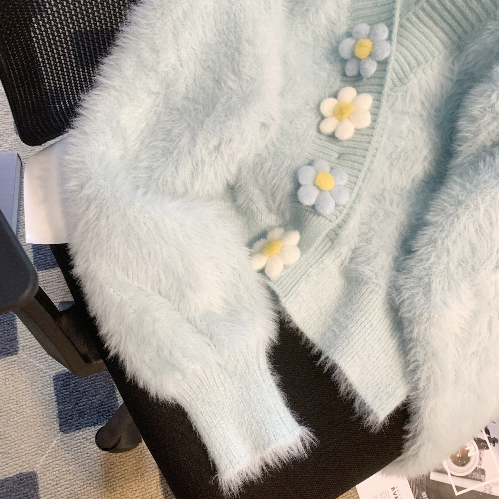 단색 모조 밍크 스웨터 재킷 2025 가을 스타일 배색 루즈핏 브이넥 독특한 디자인 니트 가디건스토어 가기