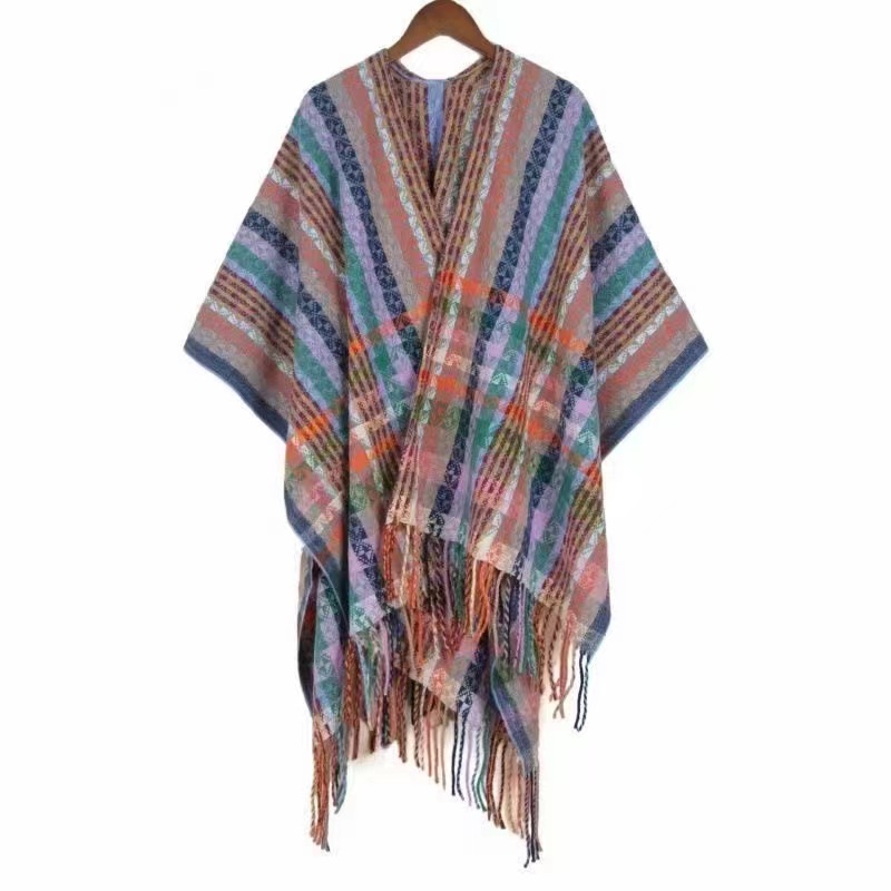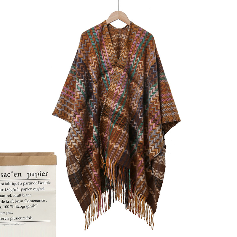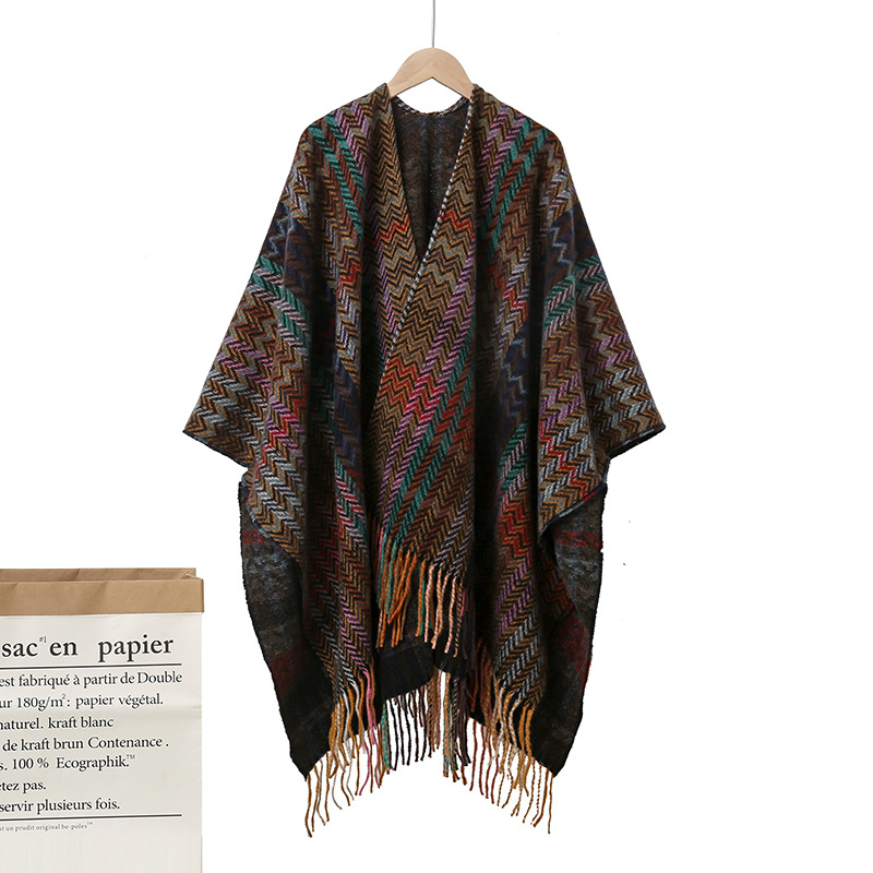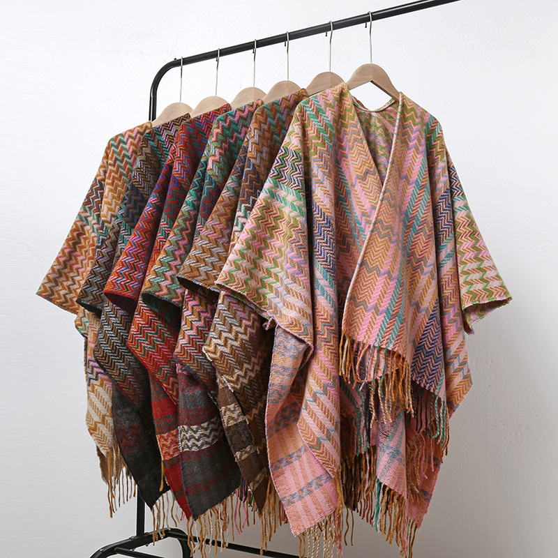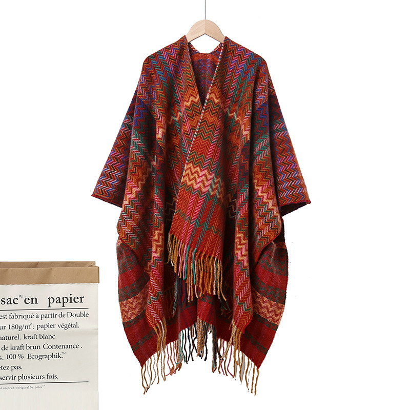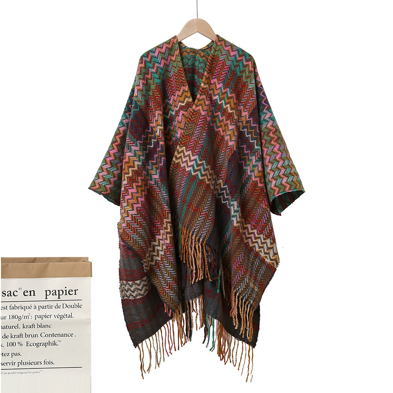 스플릿 케이프 롱 태슬 재킷과 여행을위한 슬리브와 두꺼운 따뜻한 복고풍 물결 무늬 숄