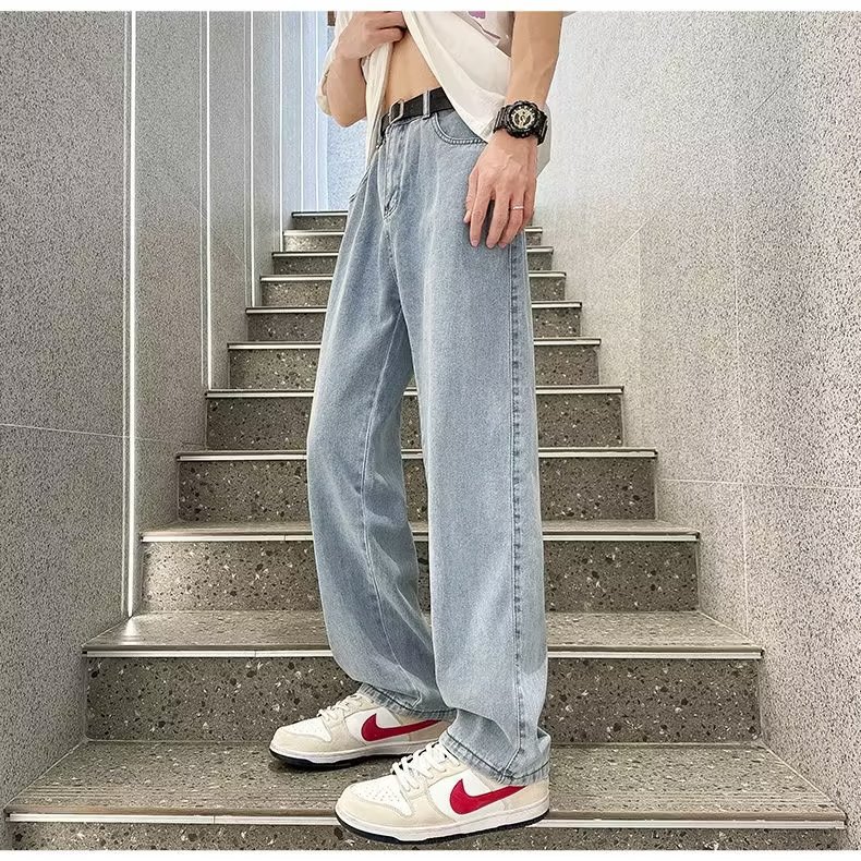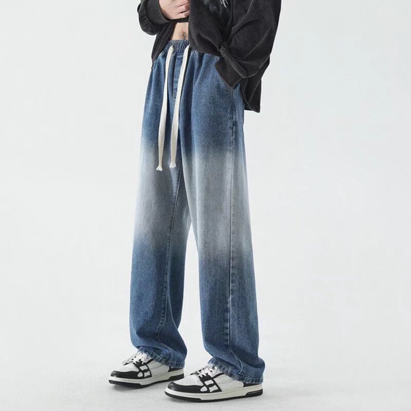 일본식 드로스트링 라이트 컬러 청바지 남성용 탄성 허리 느슨한 스트레이트 바닥 트렌디 한 와이드 레그 캐주얼 롱 팬츠 남성용스토어 가기