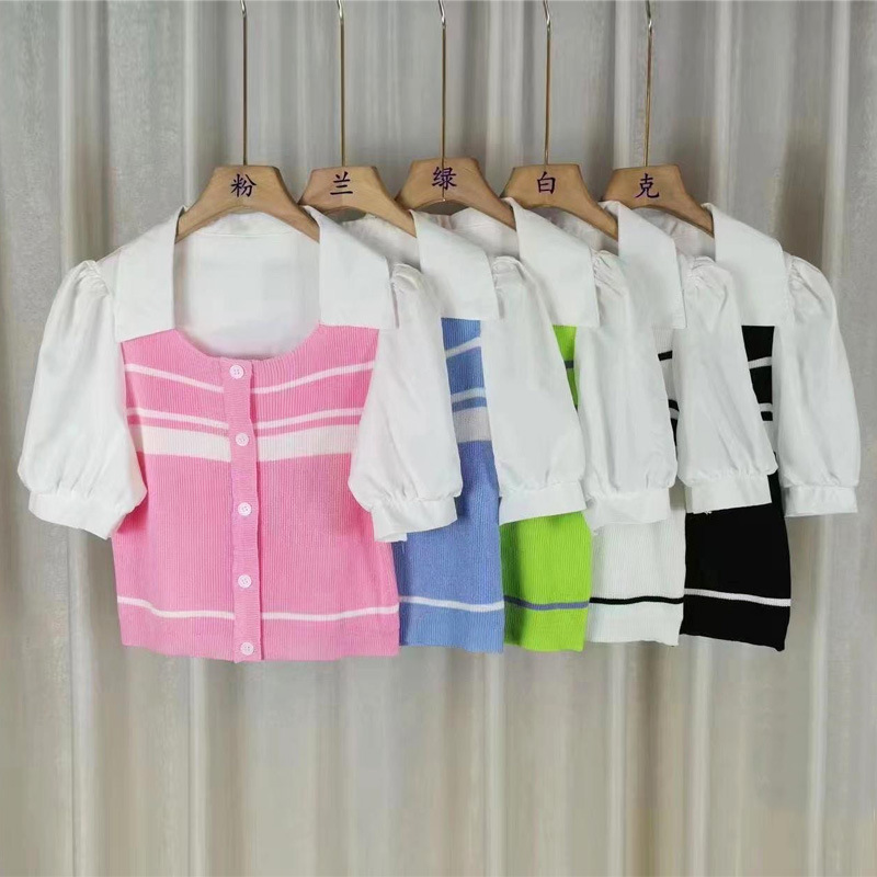 대비 스트라이프 퍼프 슬리브 니트 여성의 여름 새로운 순수한 욕망 스타일 섹시한 짧은 모든 매치 달콤한 스파이스 걸 탑스토어 가기